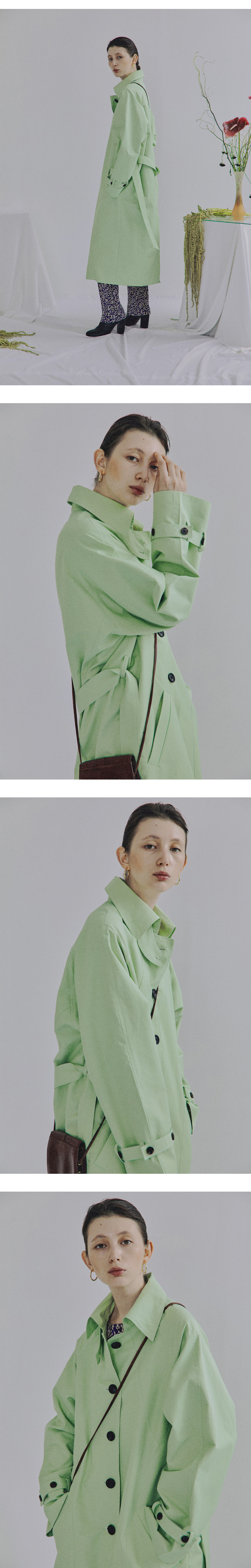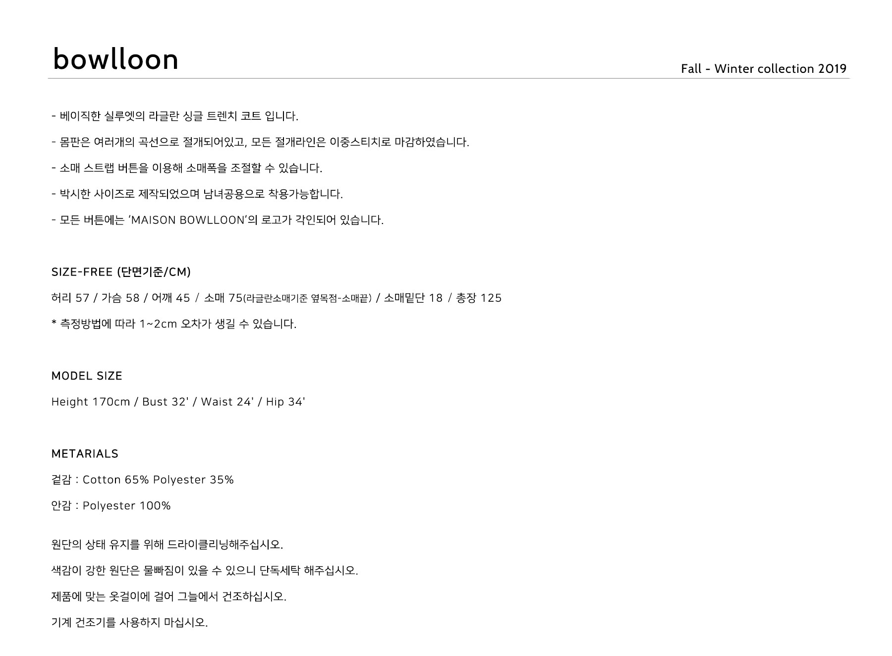베이직한 실루엣의 라글란 싱글 트렌치 코트입니다. 몸판은 여러개의 곡선으로 절개되어있고, 모든 절개라인은 이중스티치로 마감하였습니다. 소매 스트랩 버튼을 이용해 소매폭을 조절할 수 있습니다. 박시한 사이즈로 제작되어 남녀공용으로 착용 가능합니다. 모든 버튼에는 'MAISON BOWLLOON'로고가 각인되어 있습니다.