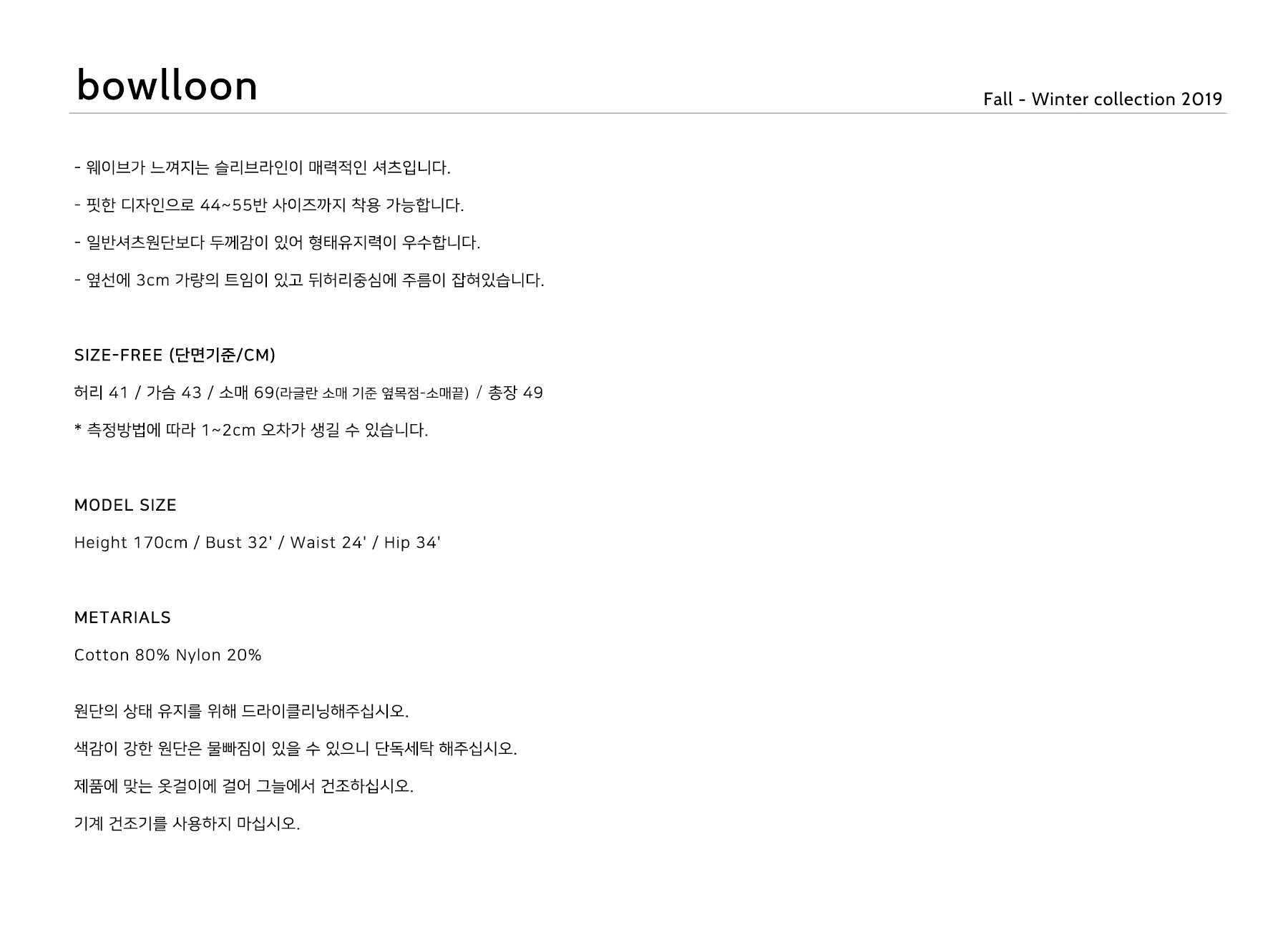 일반적인 셔츠원단보다 두께감이 있어 형태유지력이 우수합니다.