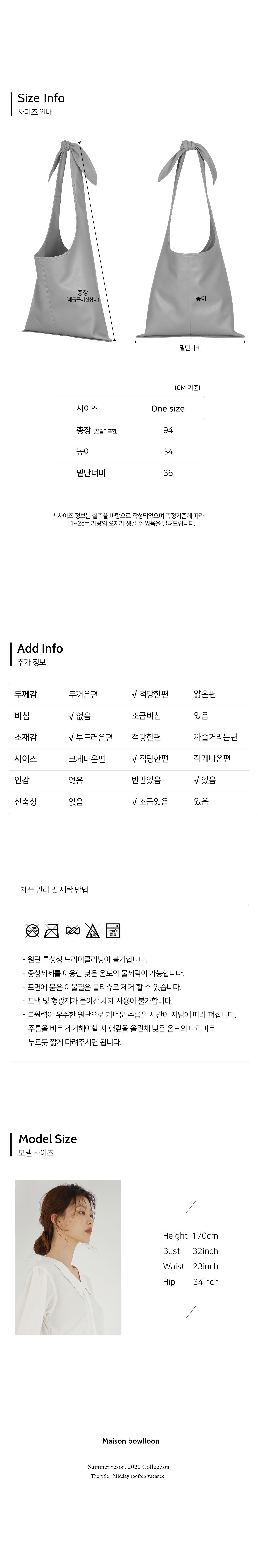 총장(끈길이포함) 94 / 높이 34 / 밑단너비 36