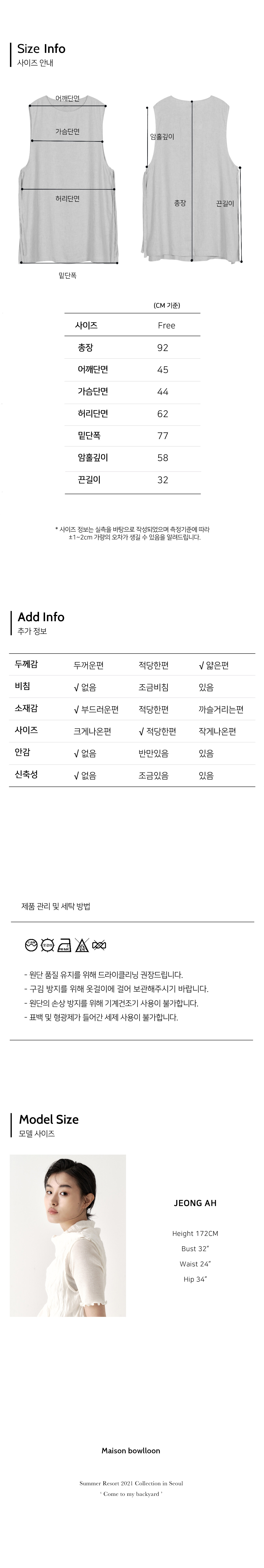 가벼운 중량감으로 한여름과 간절기 레이어드용으로 착용하기 좋은 아이템입니다.