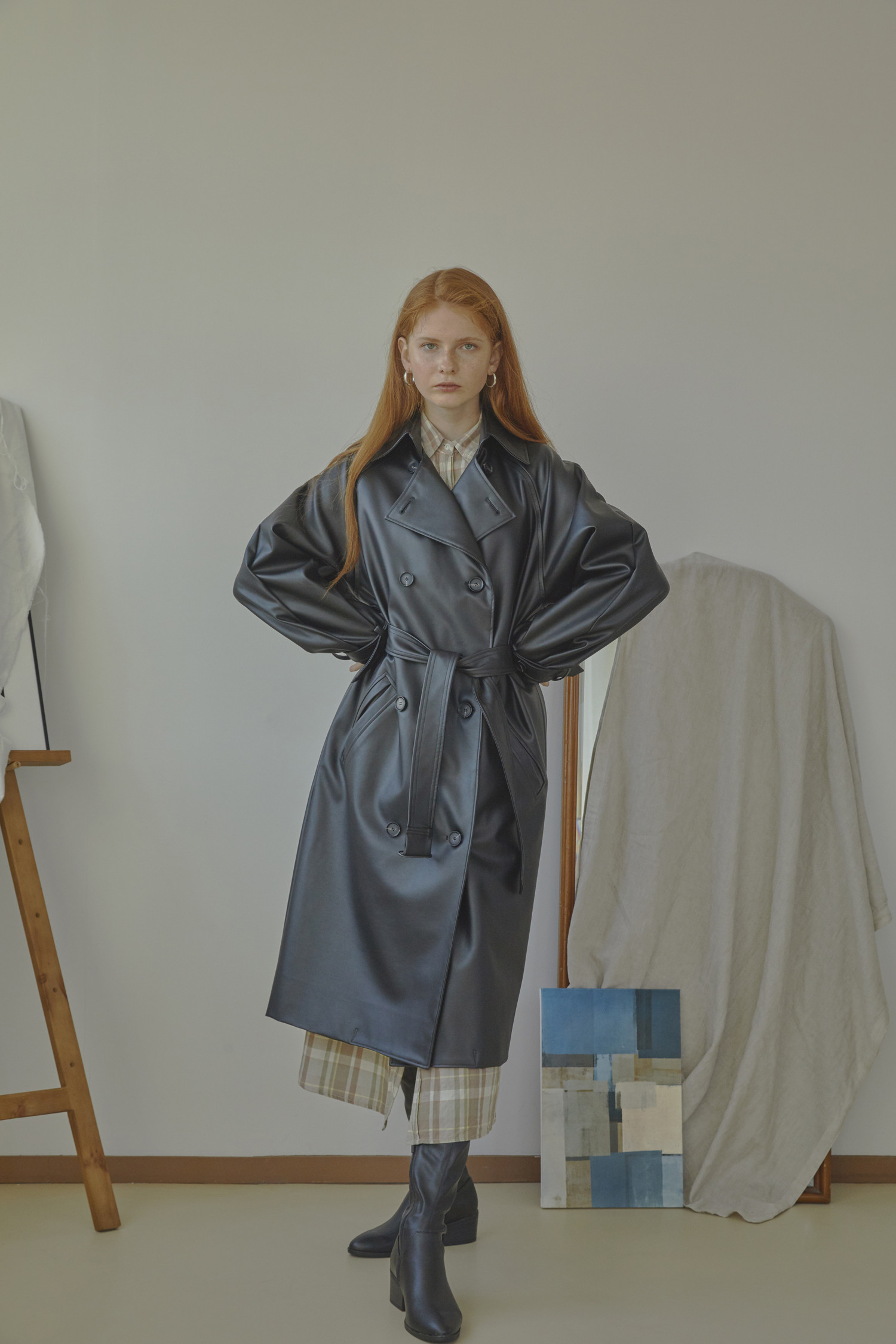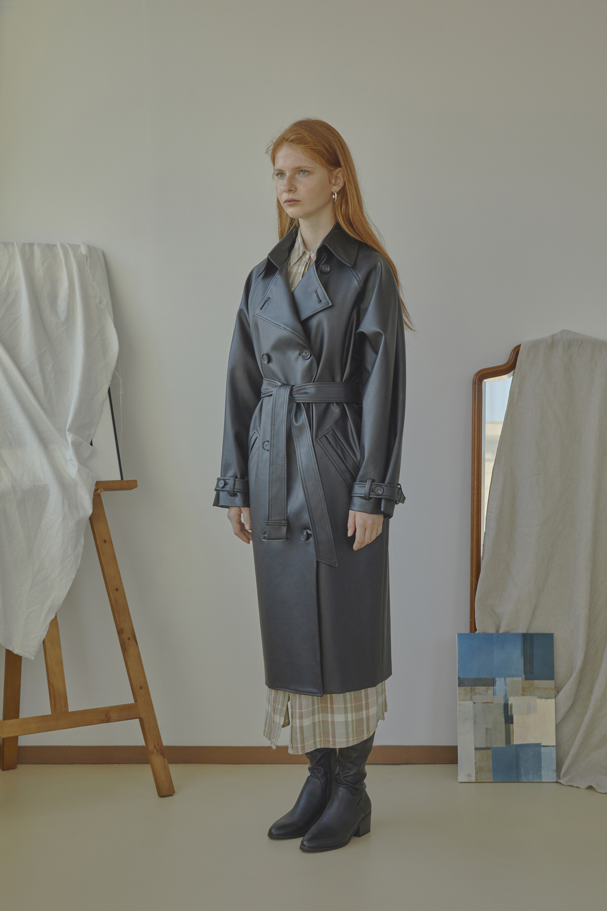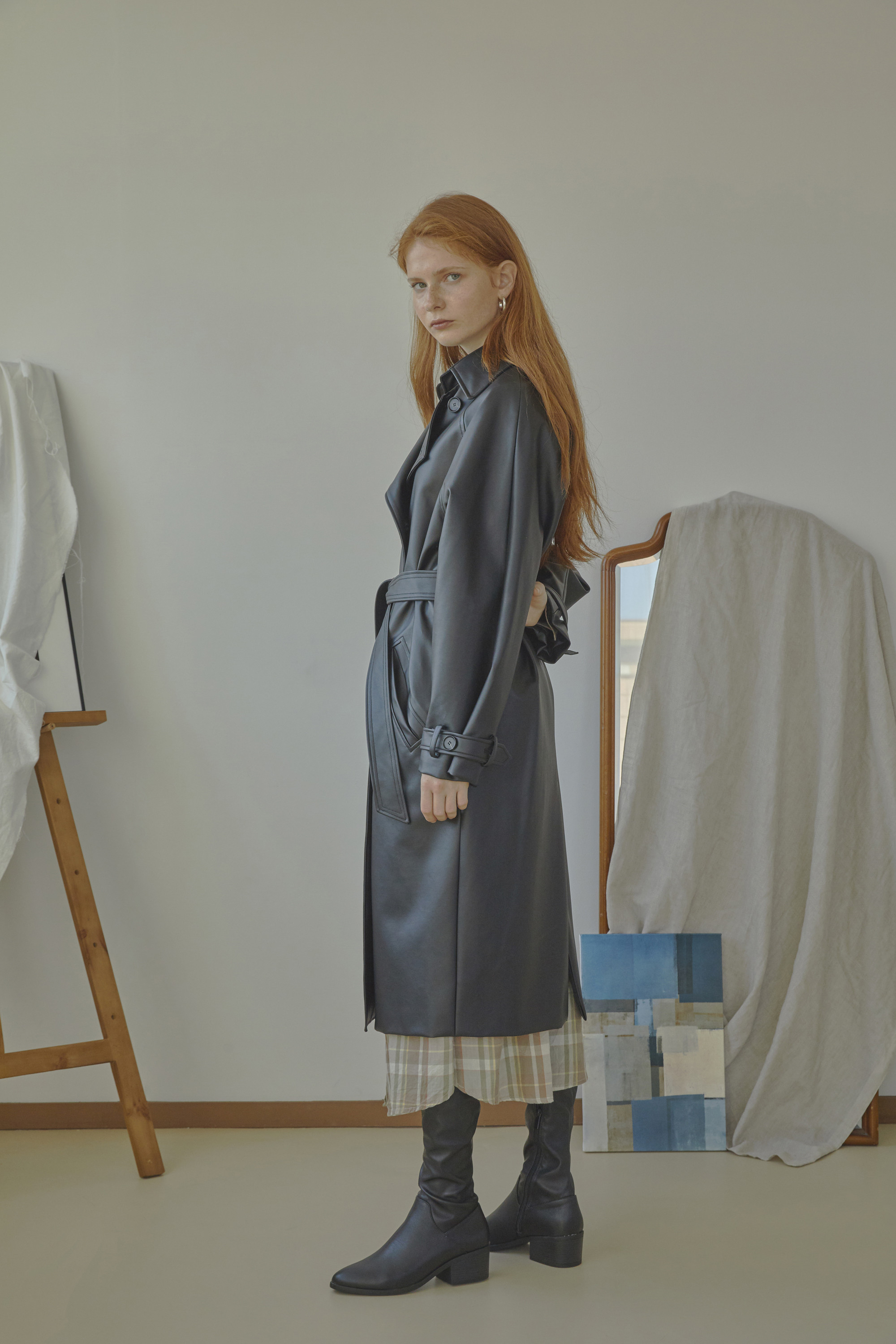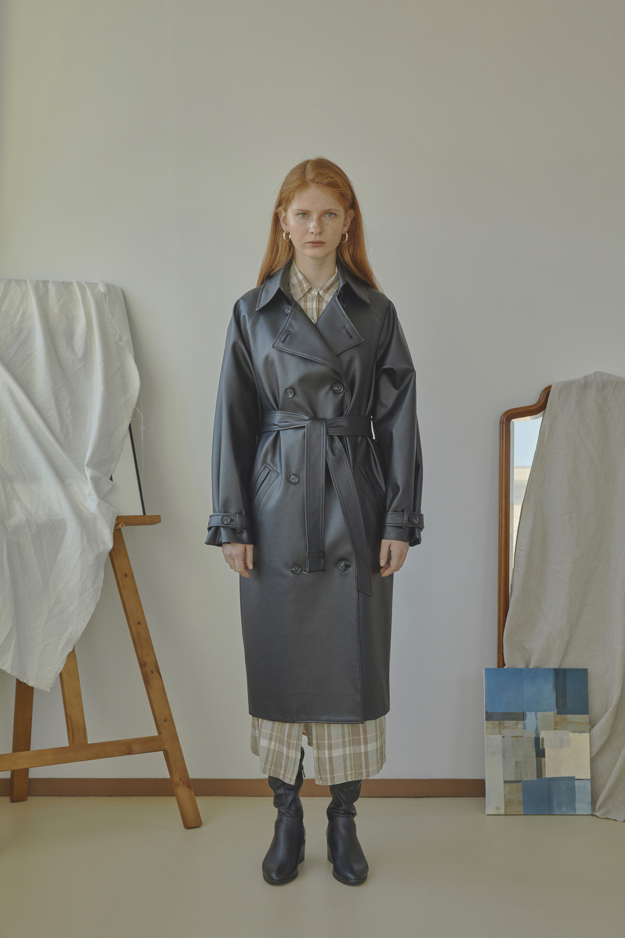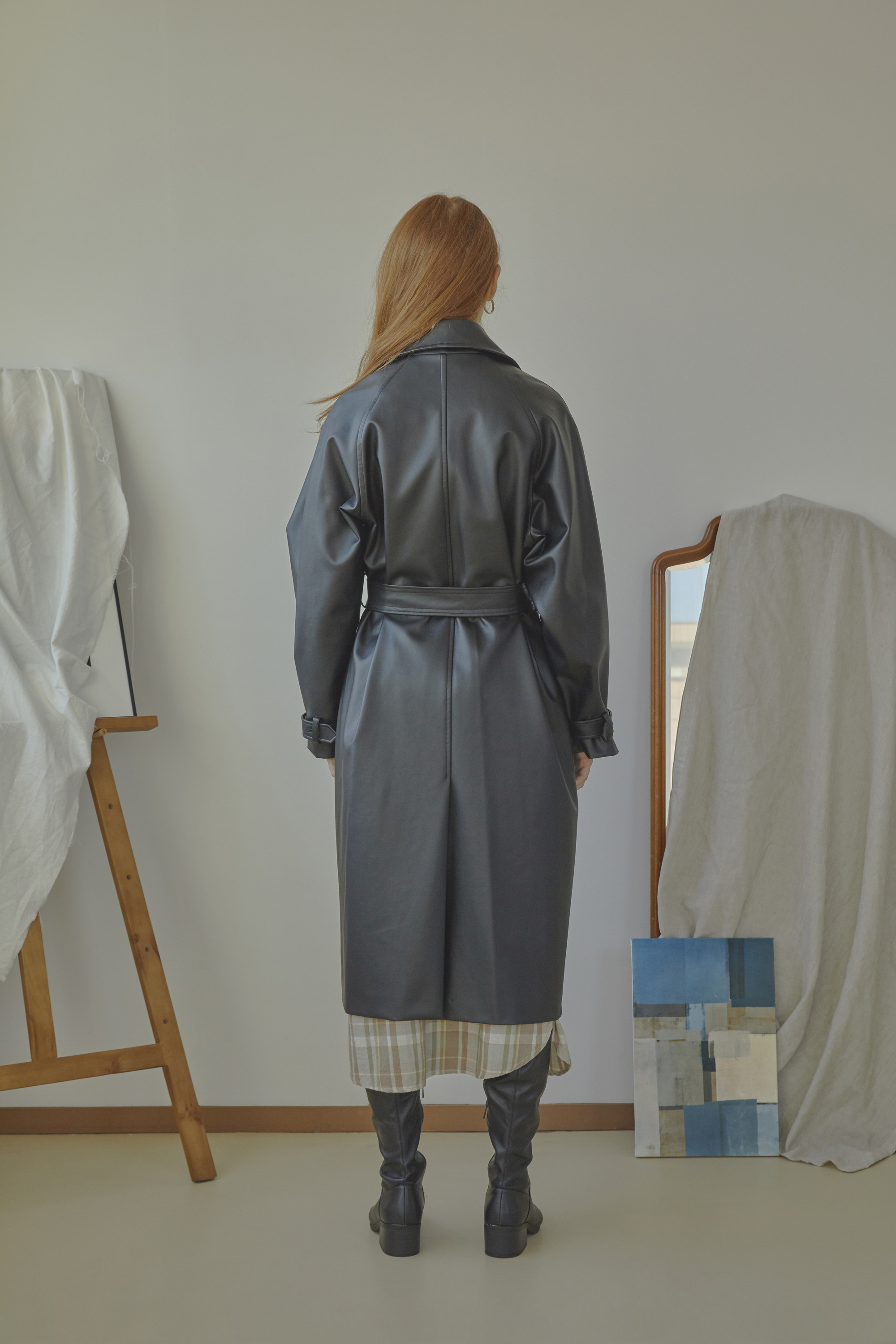 페이크 레더 소재의 클래식한 트렌치 코트입니다.