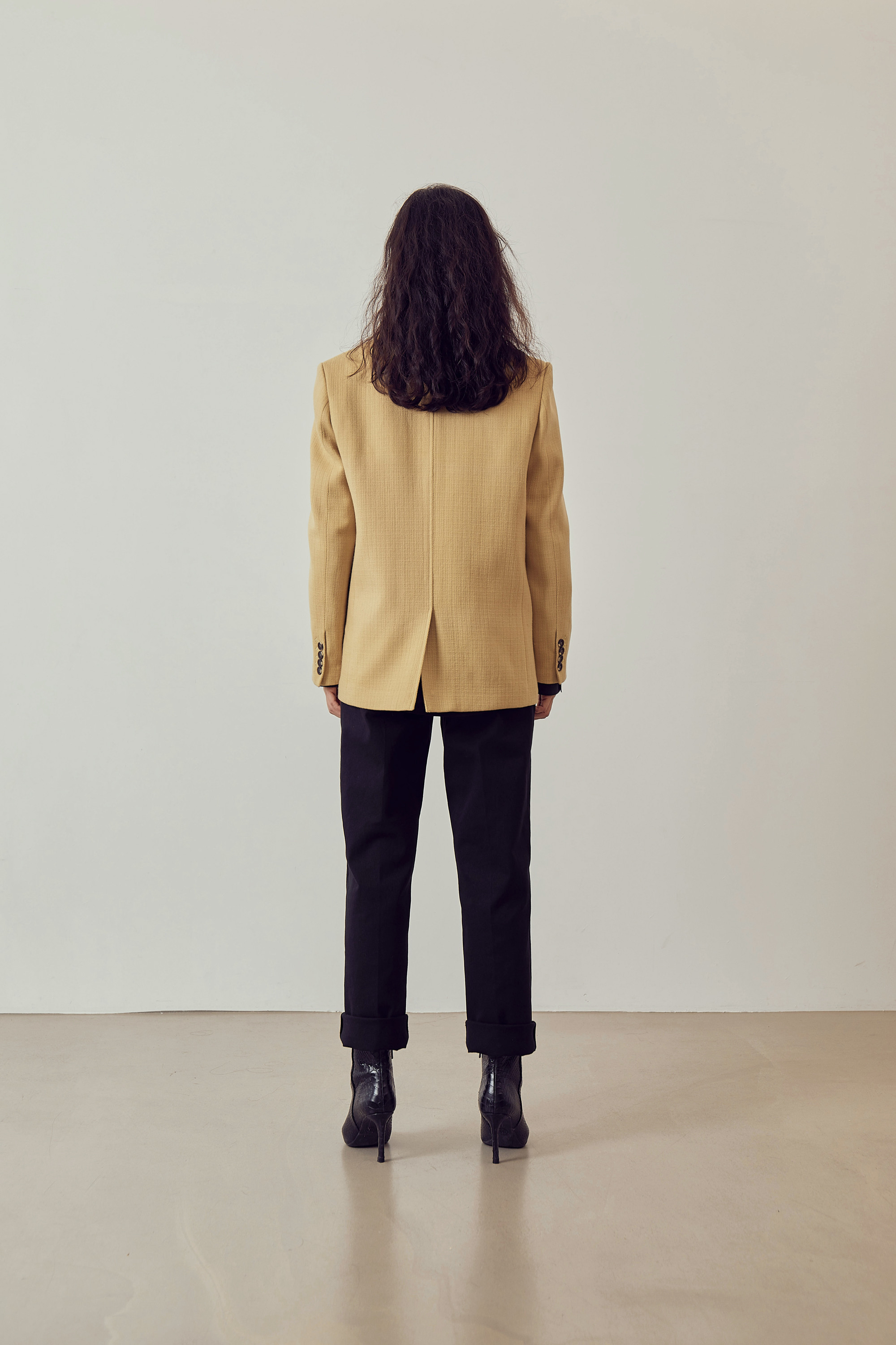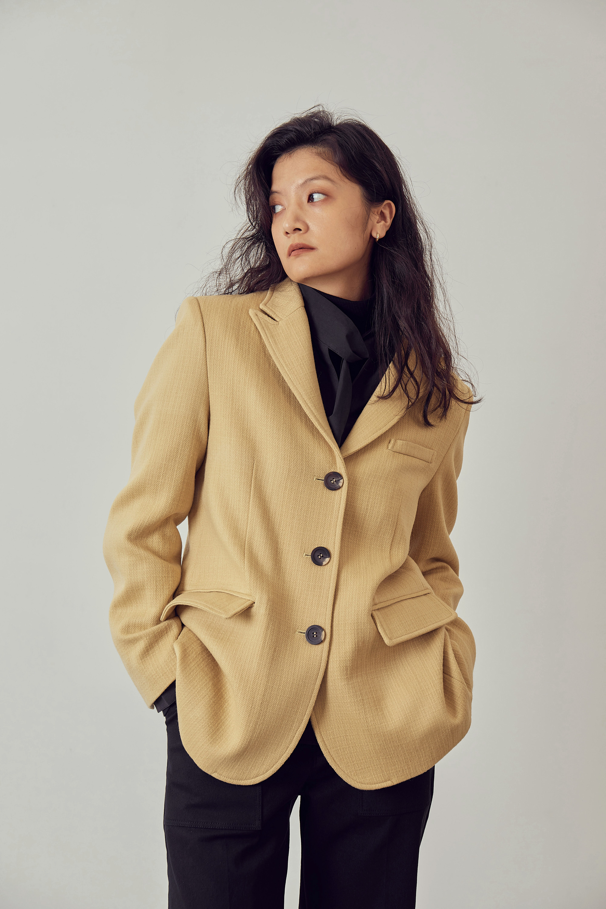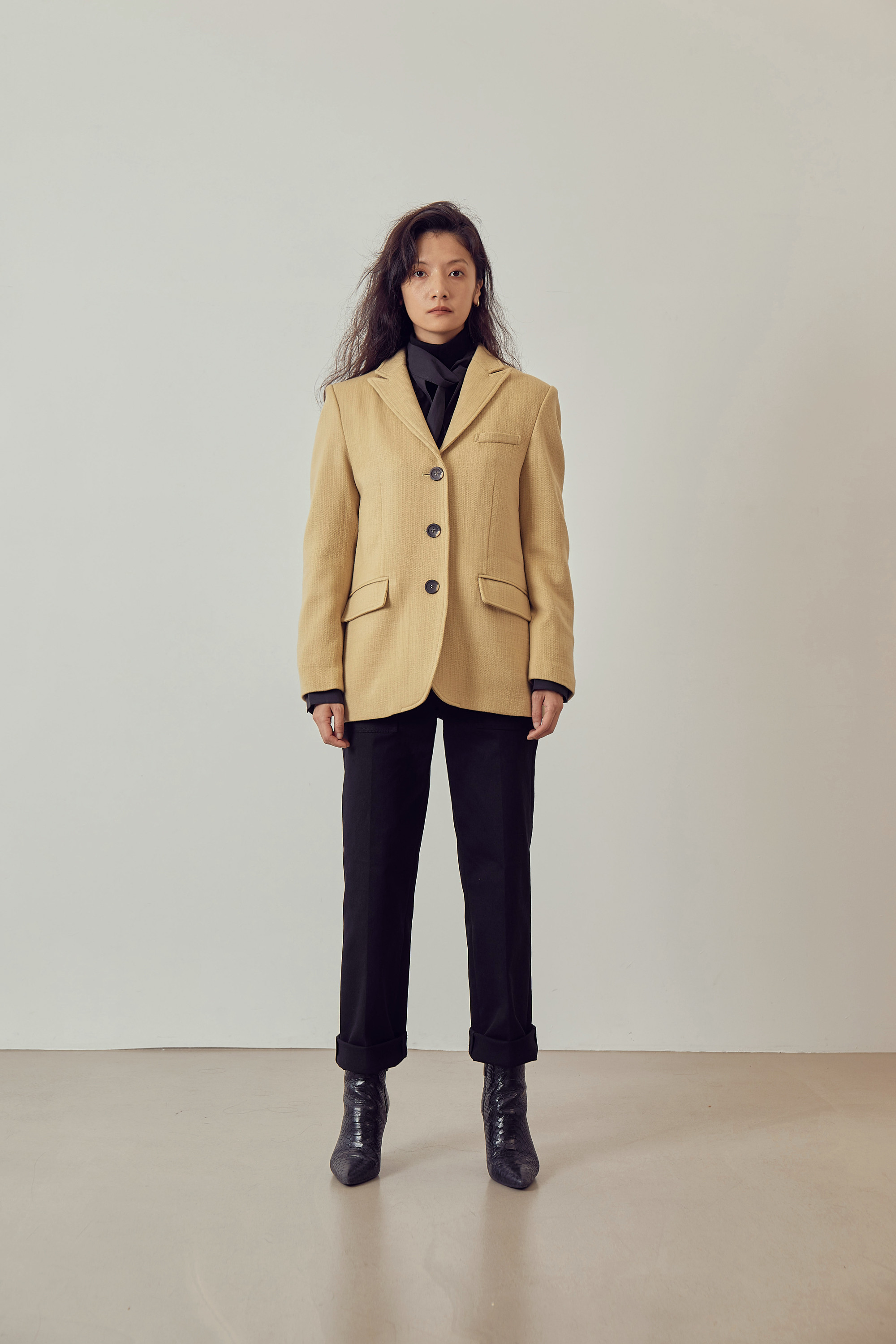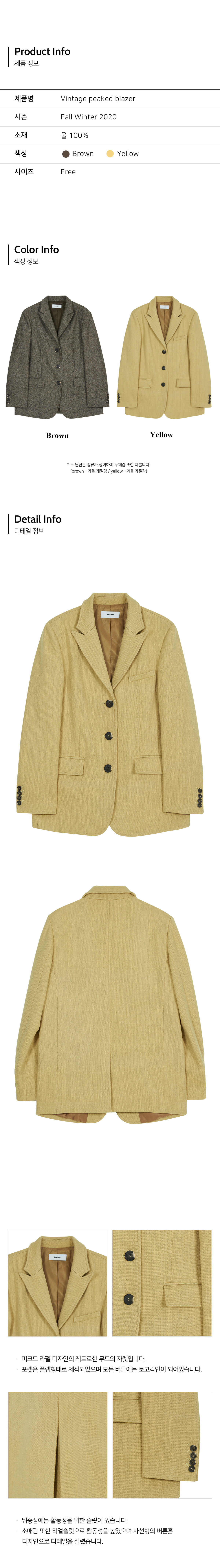 베이직한 피크드 칼라 형태의 자켓입니다.