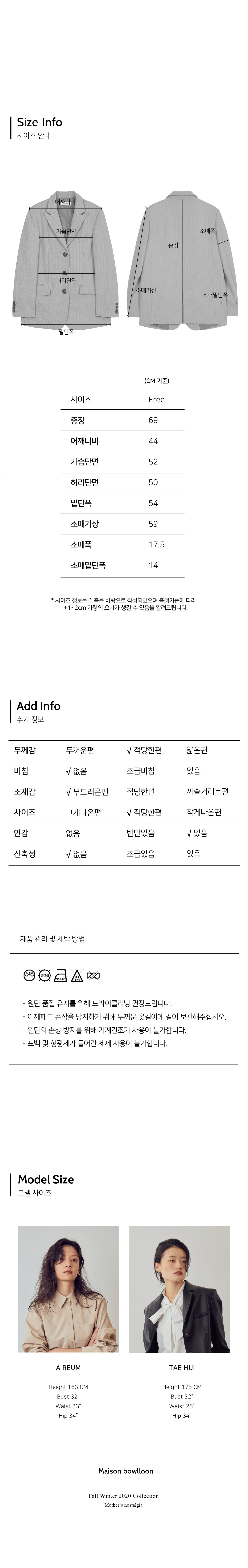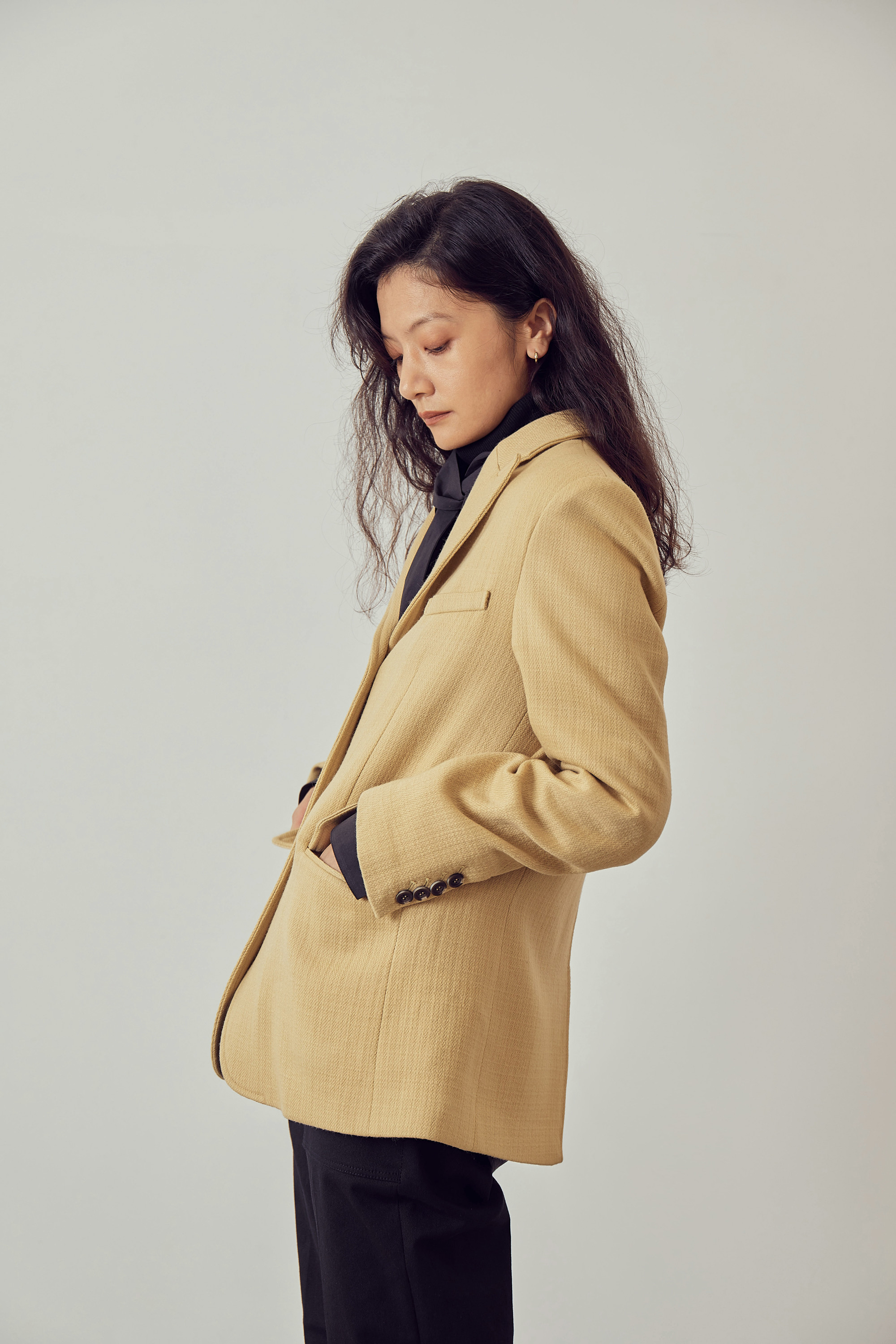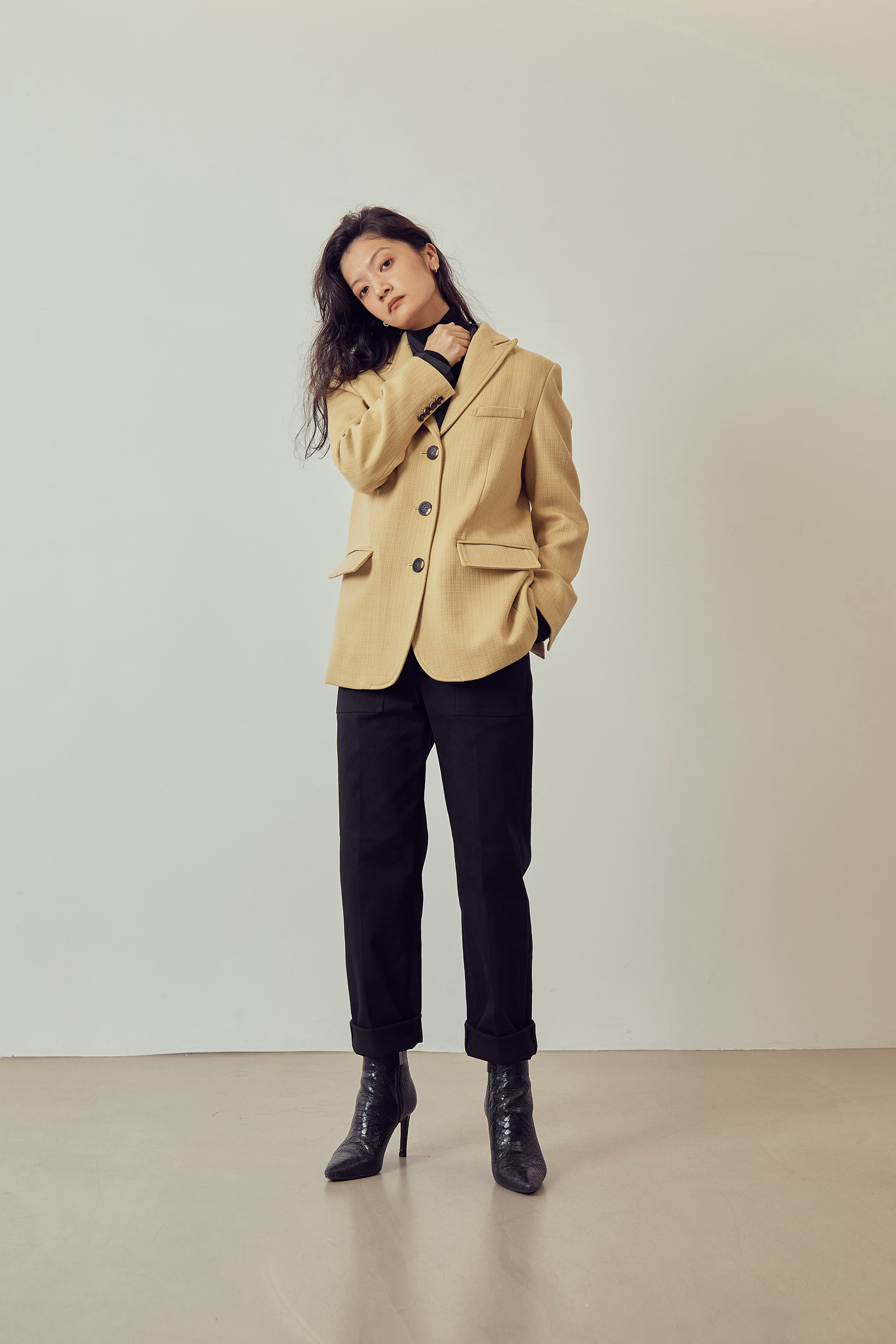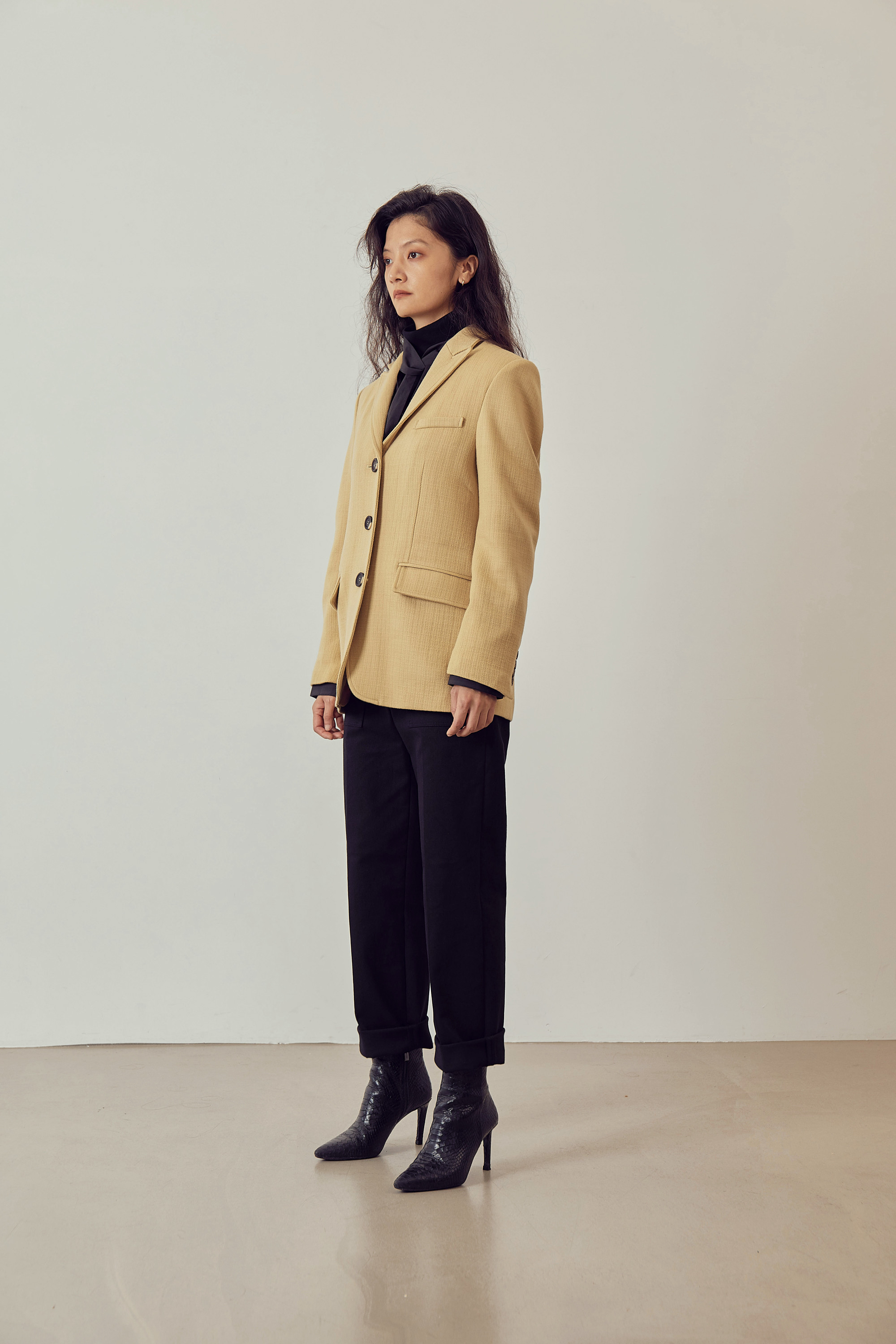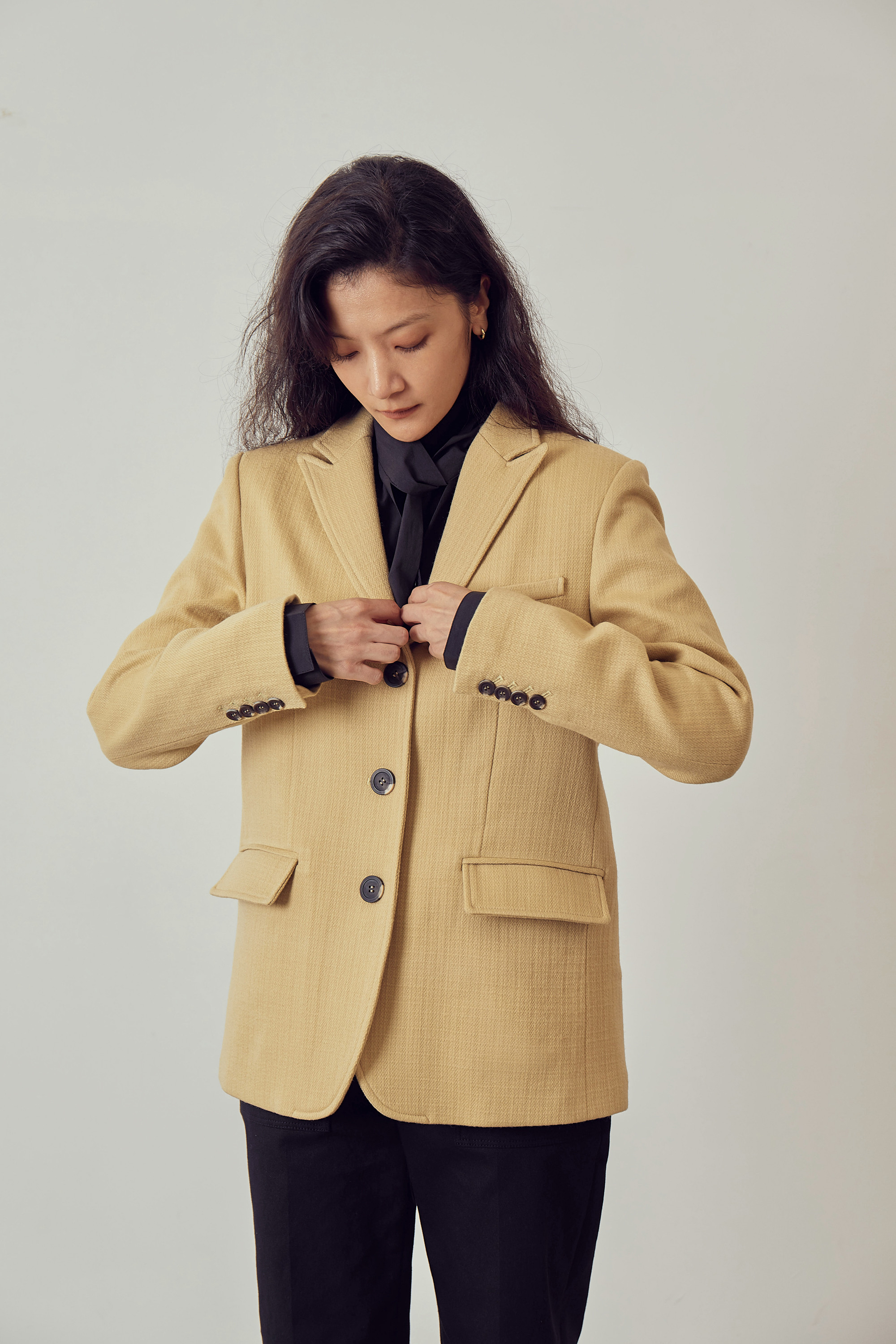 베이직한 피크드 칼라 형태의 자켓입니다.
