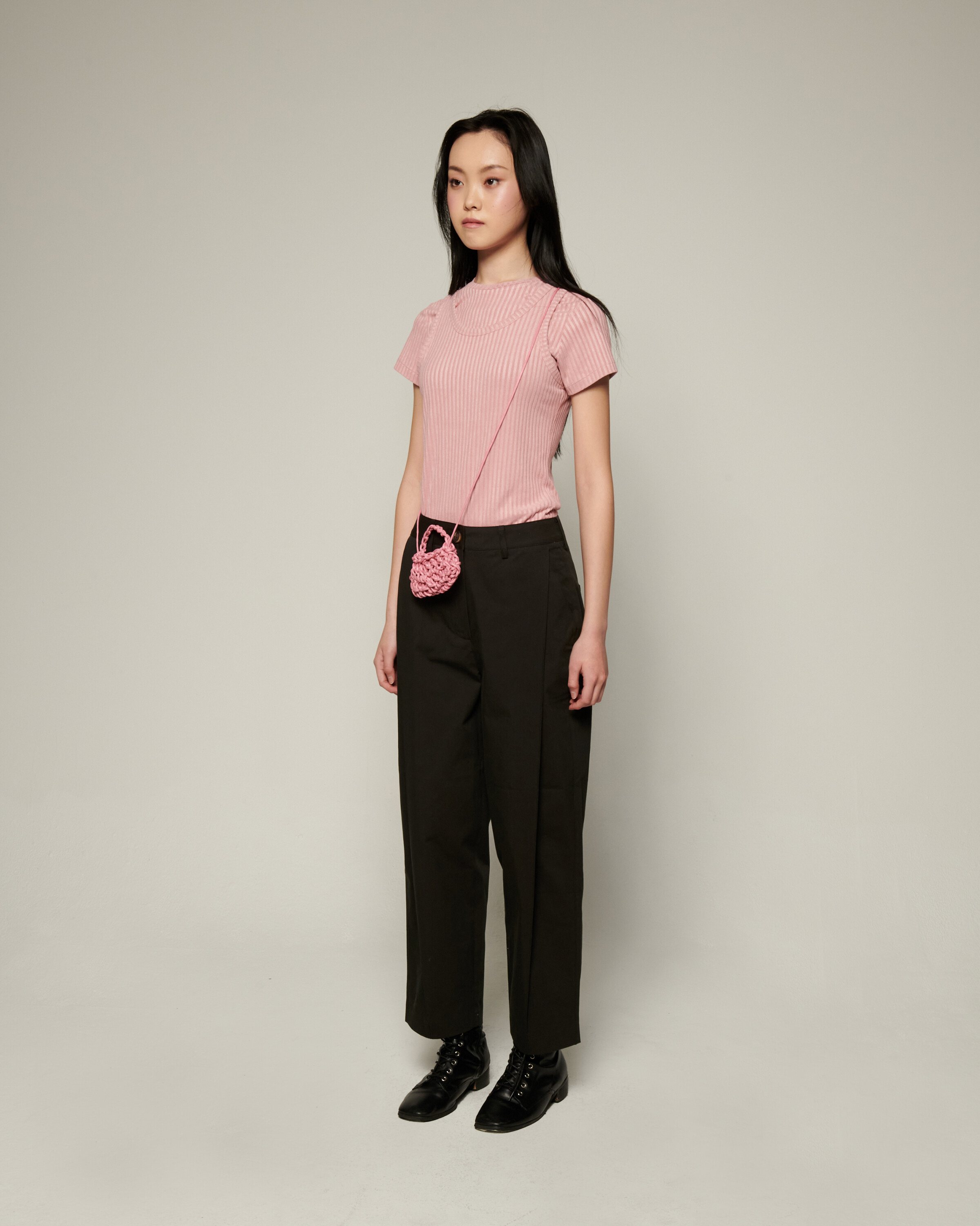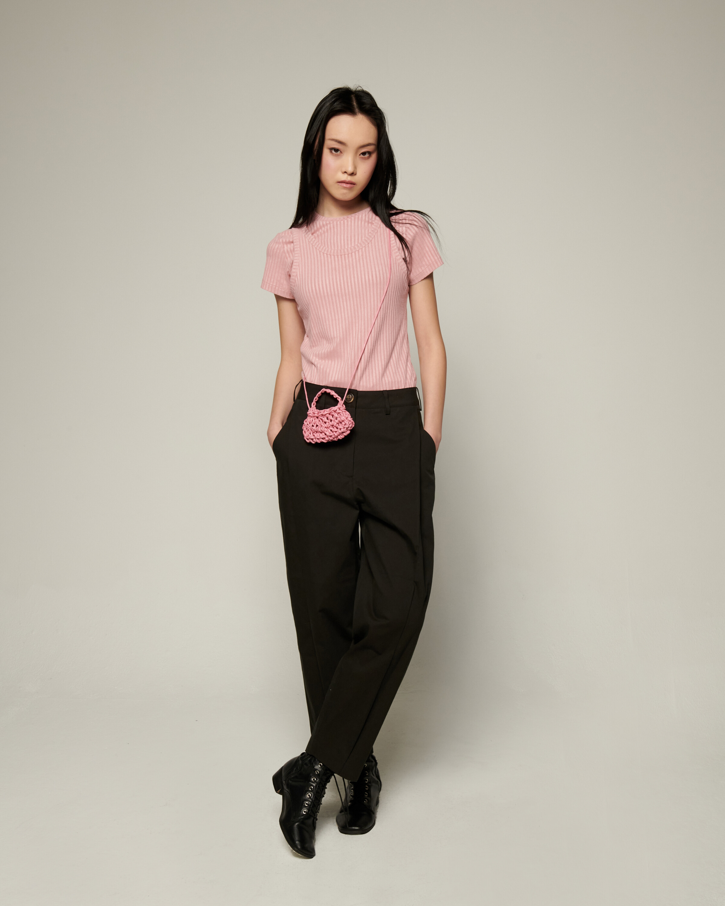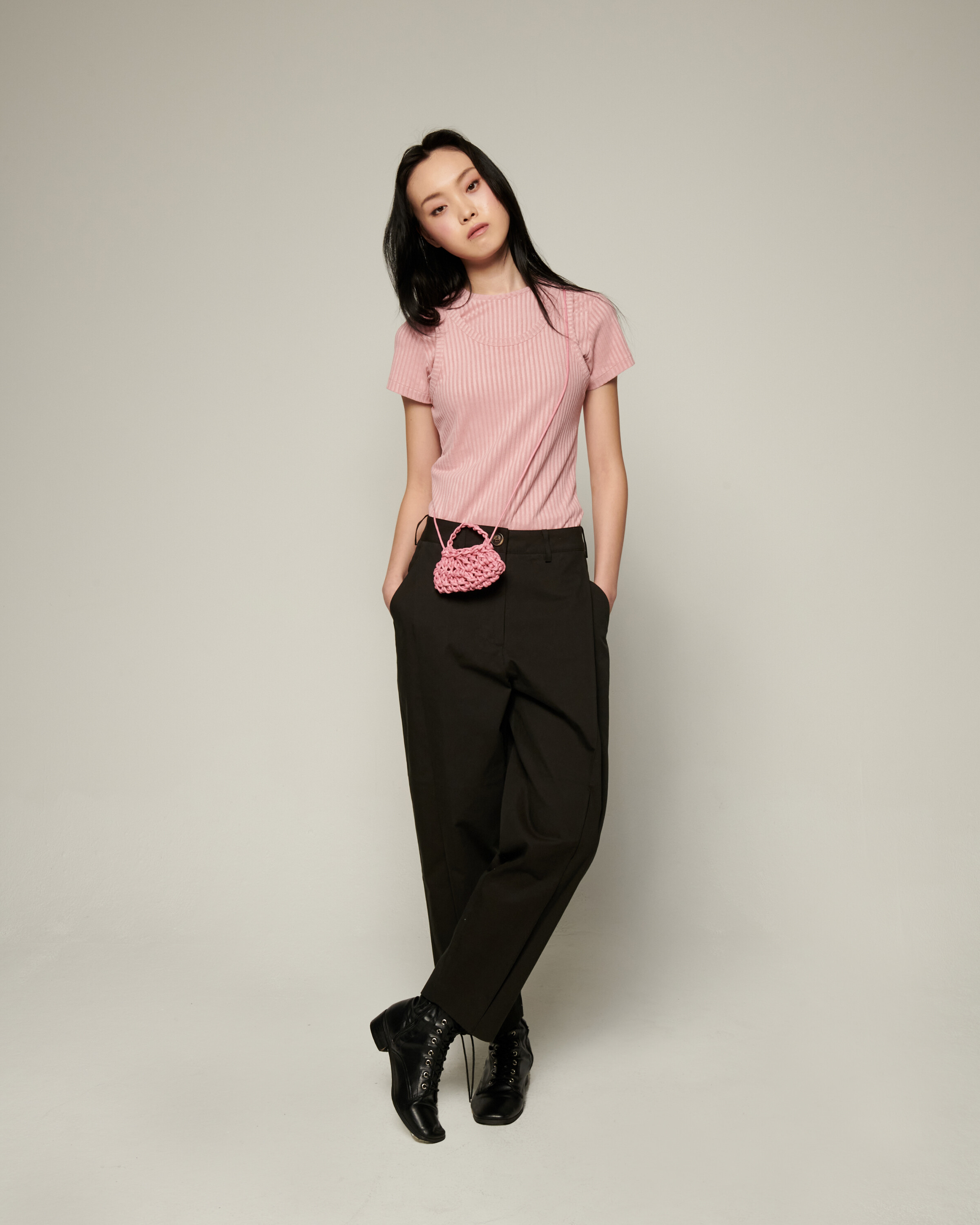 핀턱 라인은 장식스티치로 고정하여 변형이 없으며 밑단은 내부에서 마감처리하여 정돈된 실루엣을 보여줍니다.