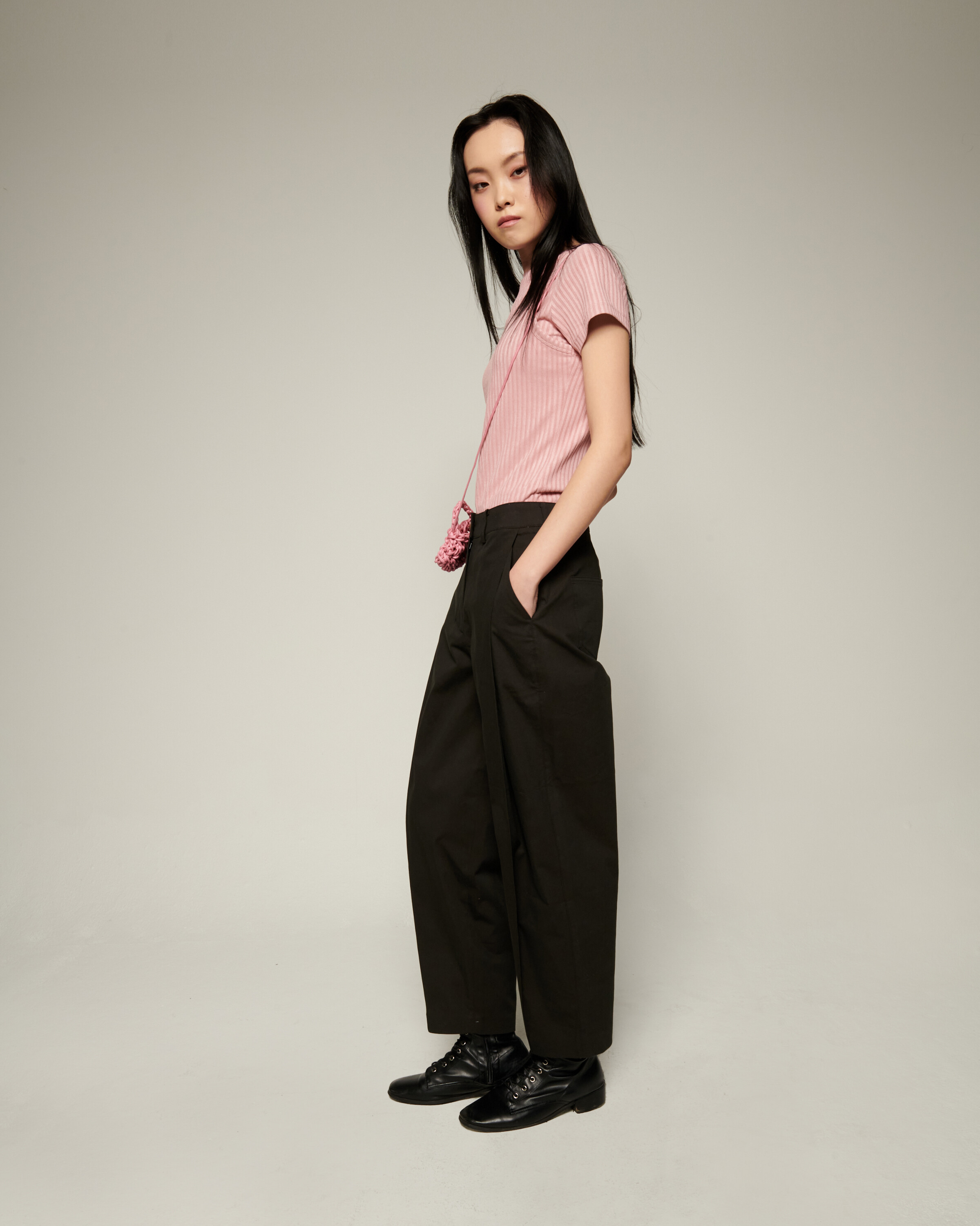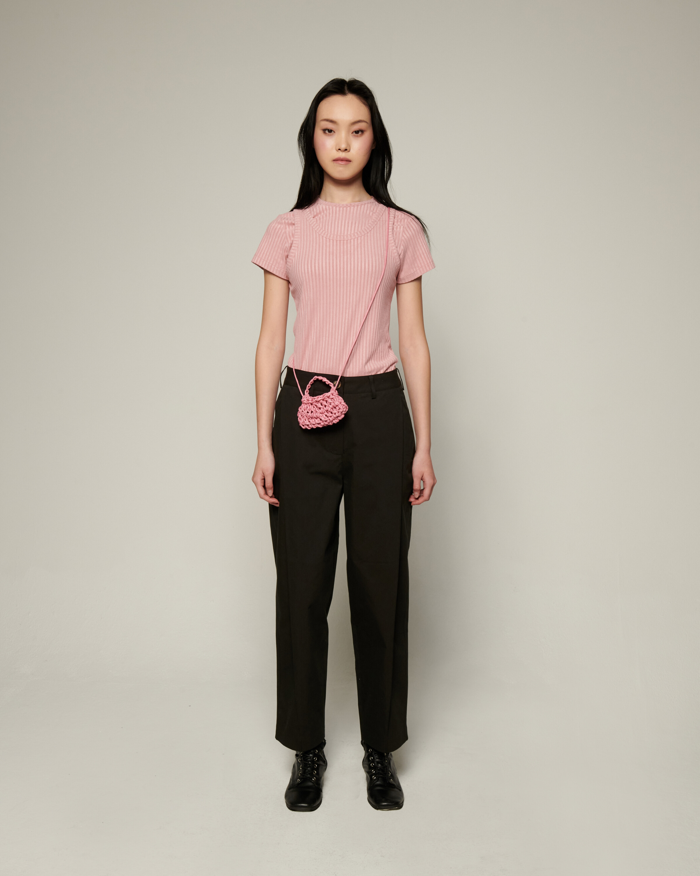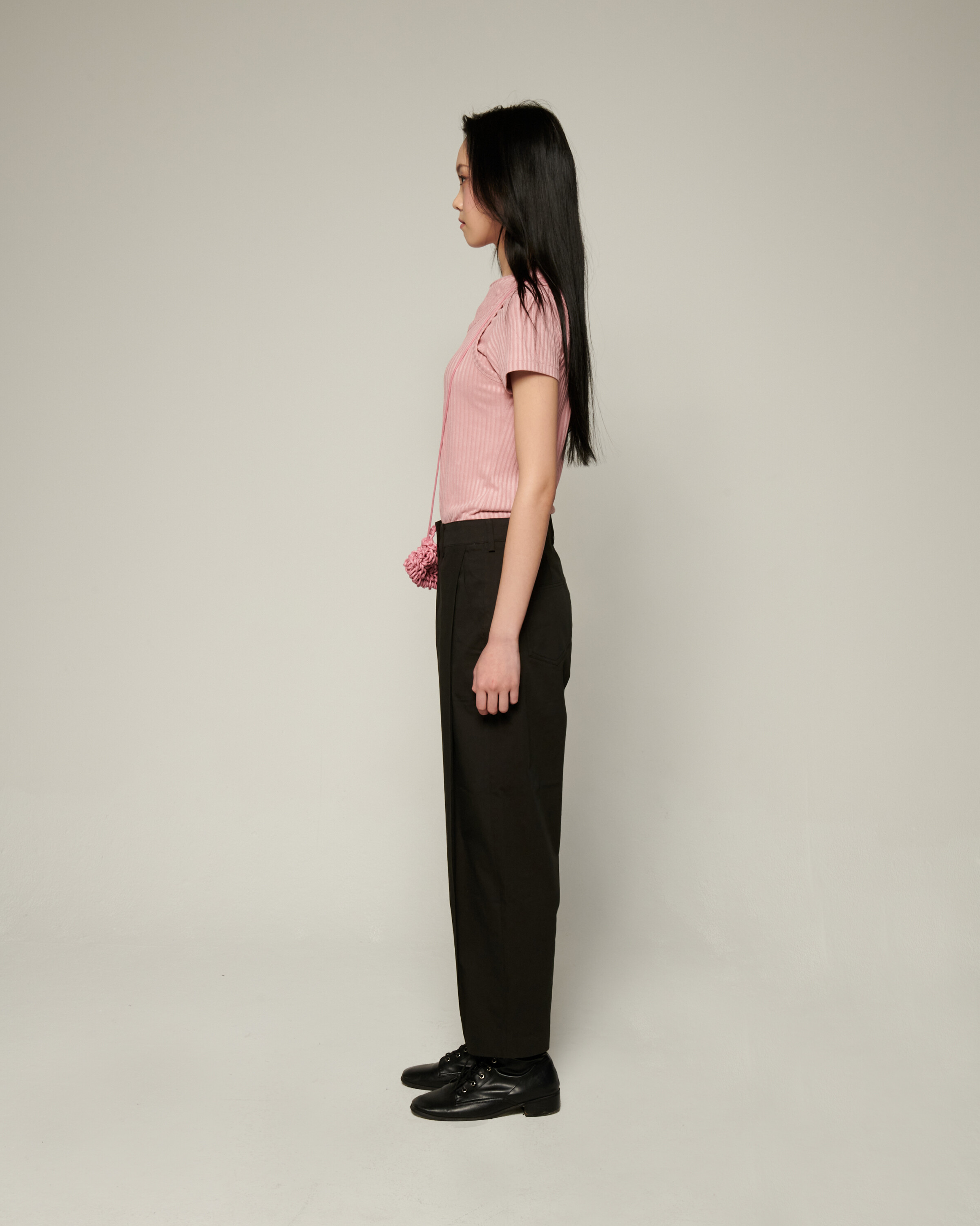 핀턱 라인은 장식스티치로 고정하여 변형이 없으며 밑단은 내부에서 마감처리하여 정돈된 실루엣을 보여줍니다.