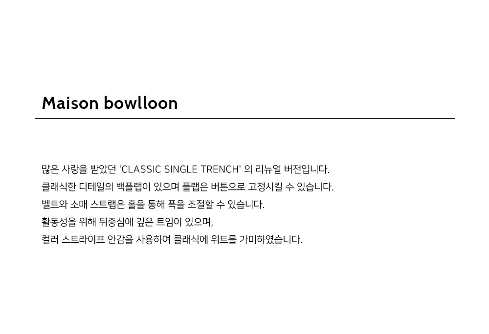 많은 사랑을 받았던 'CLASSIC SINGLE TRENCH' 를 리뉴얼 버전입니다.