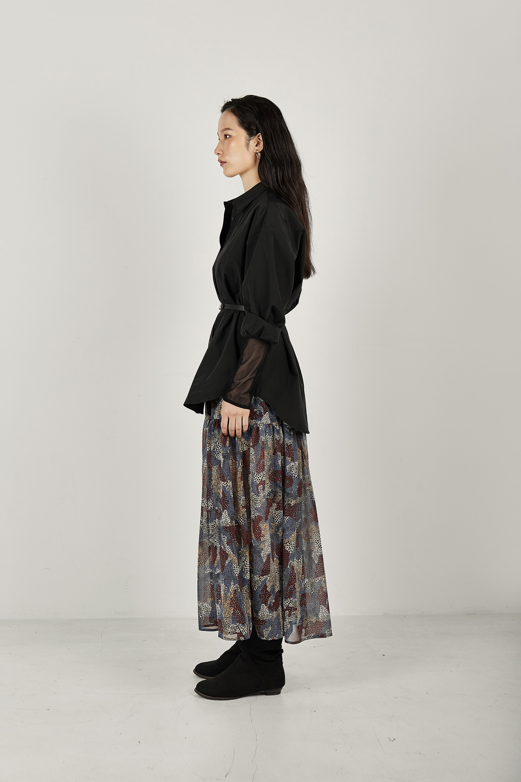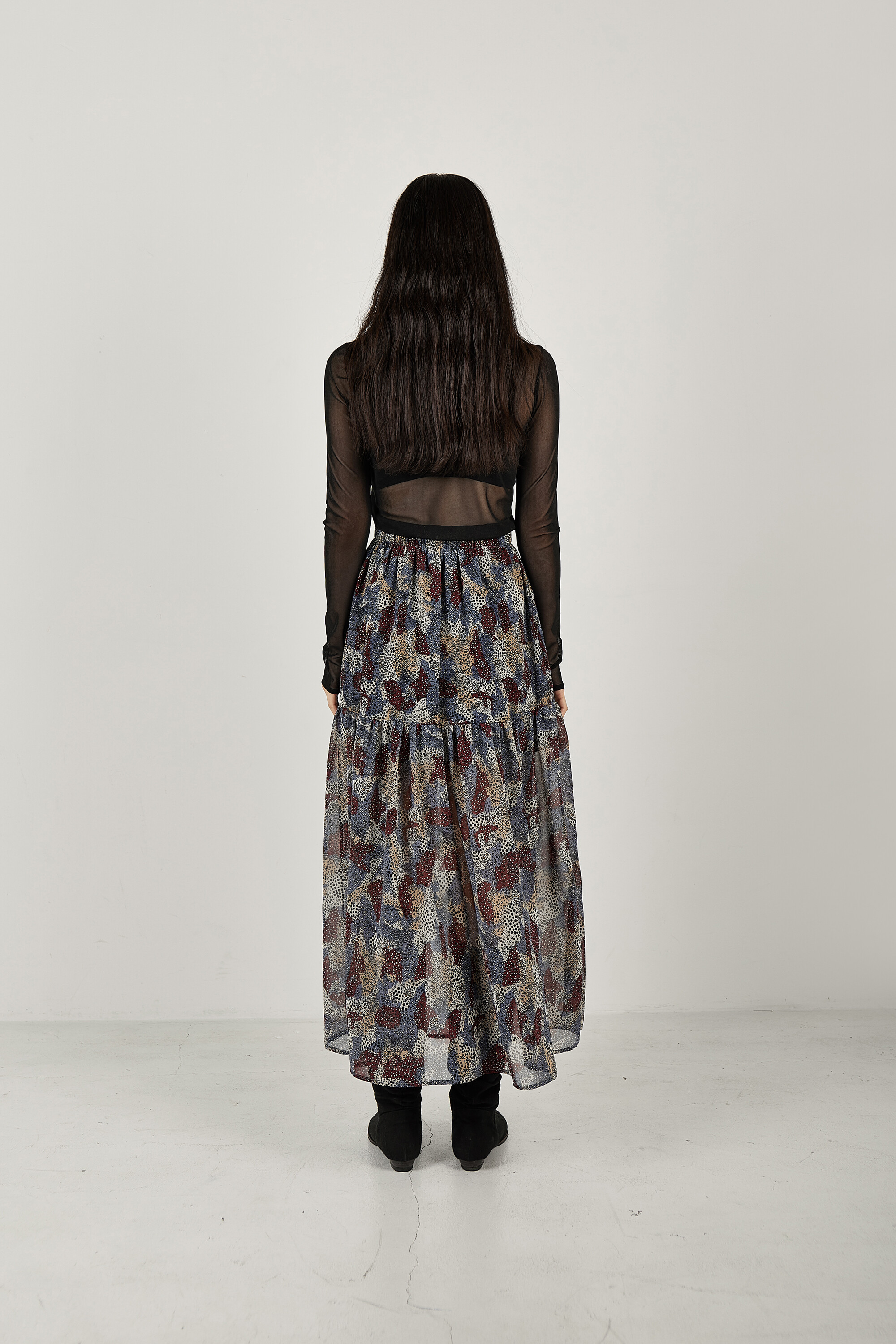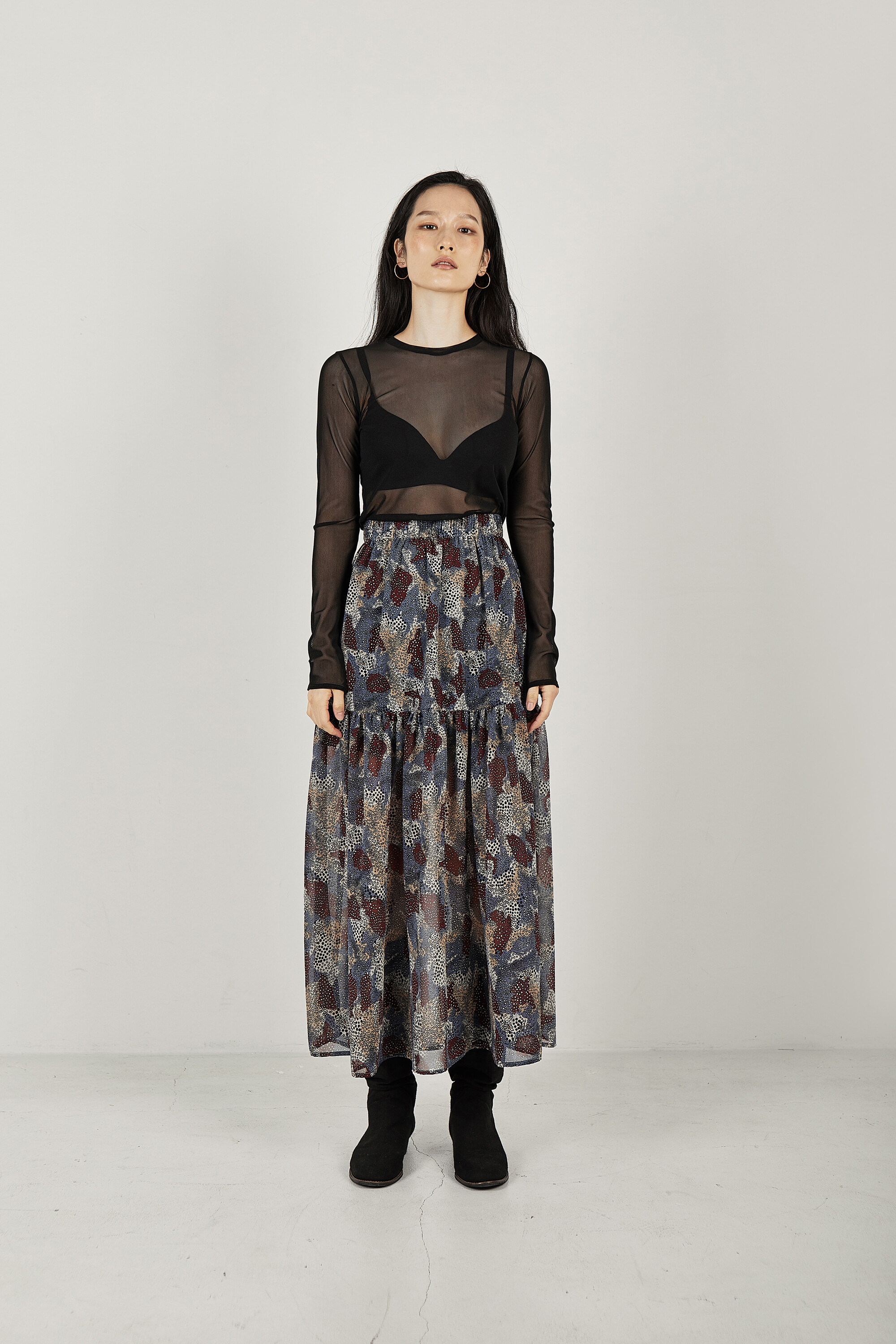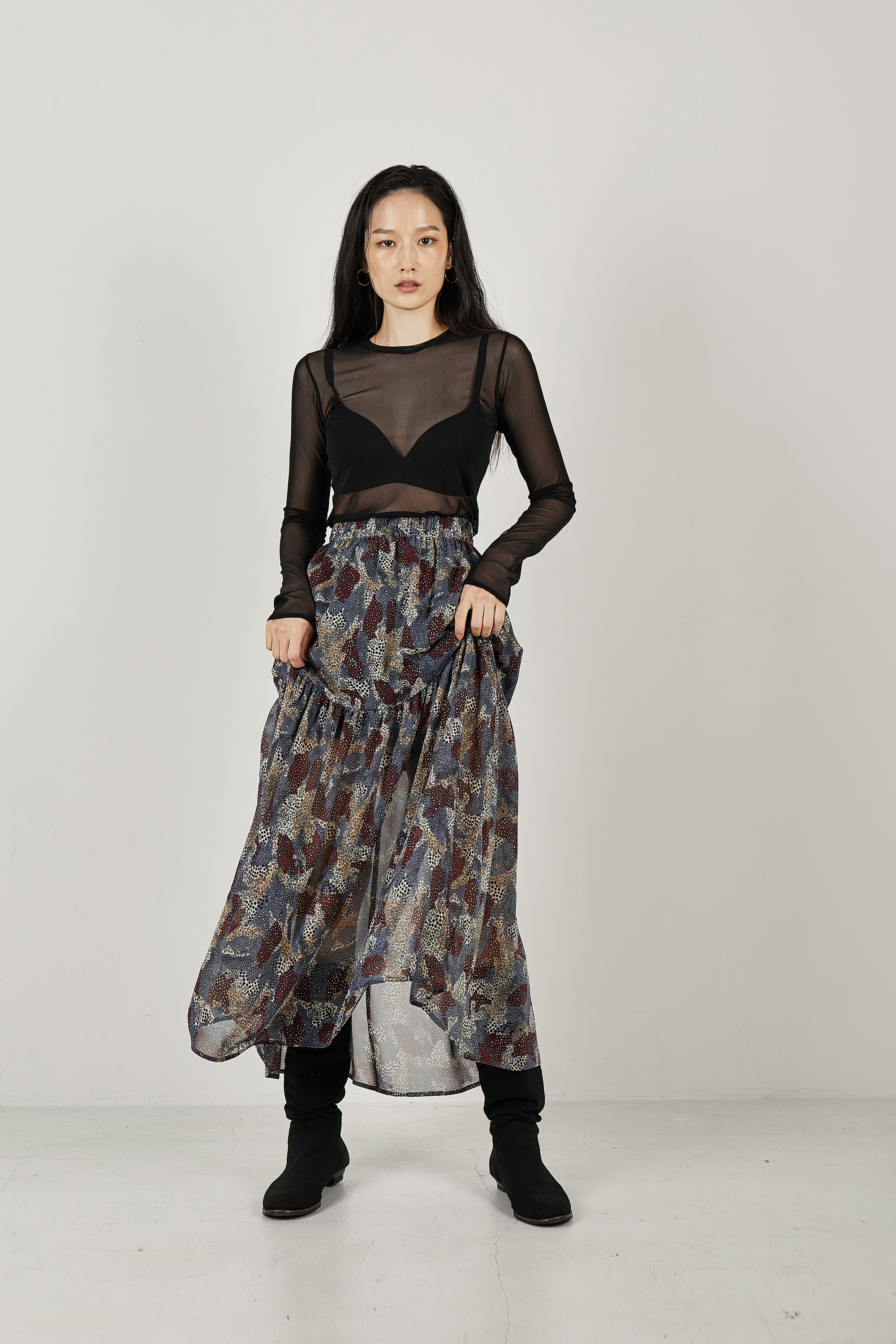 카모플라쥬 형태의 패턴이 가미된 쉬폰 스커트입니다.