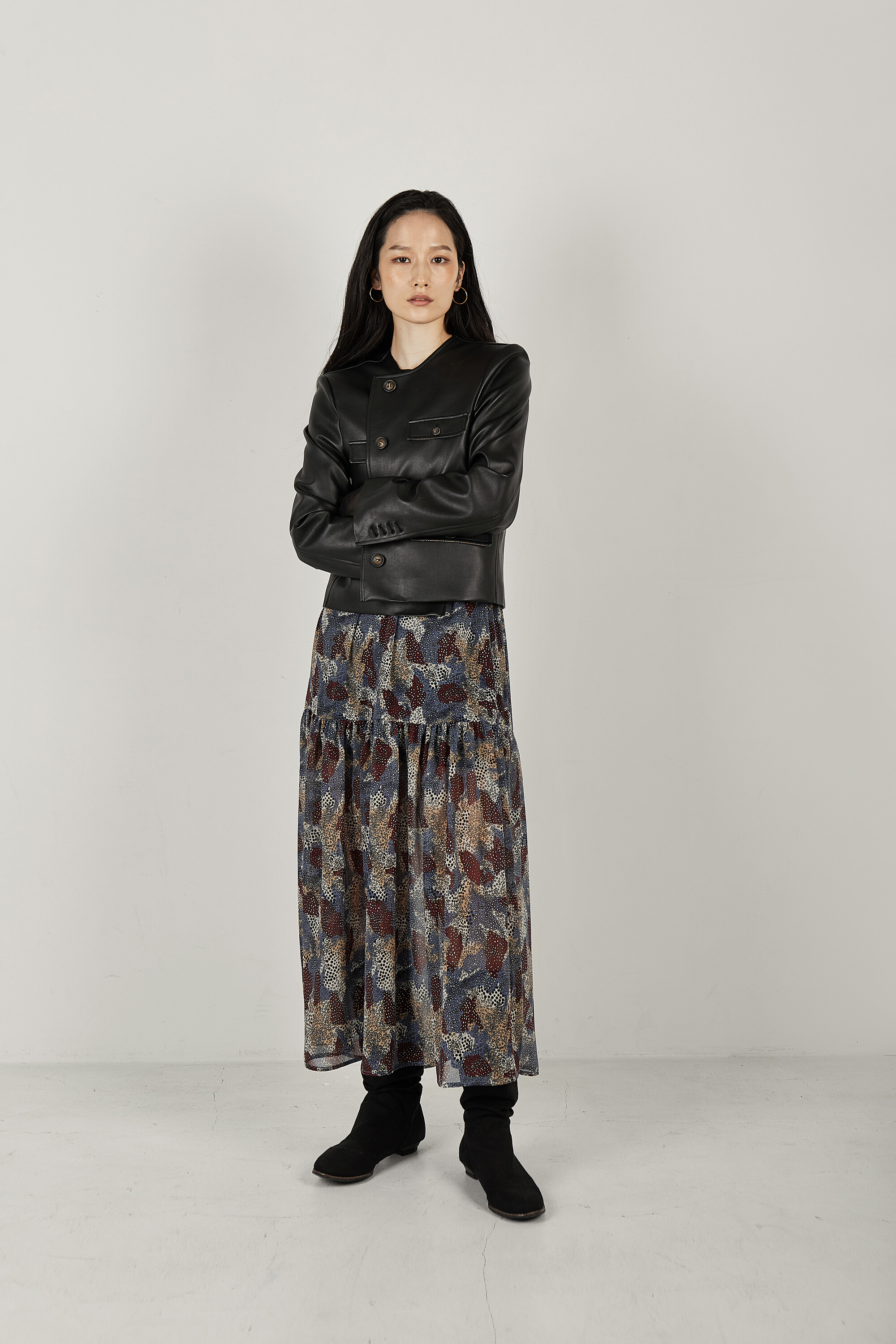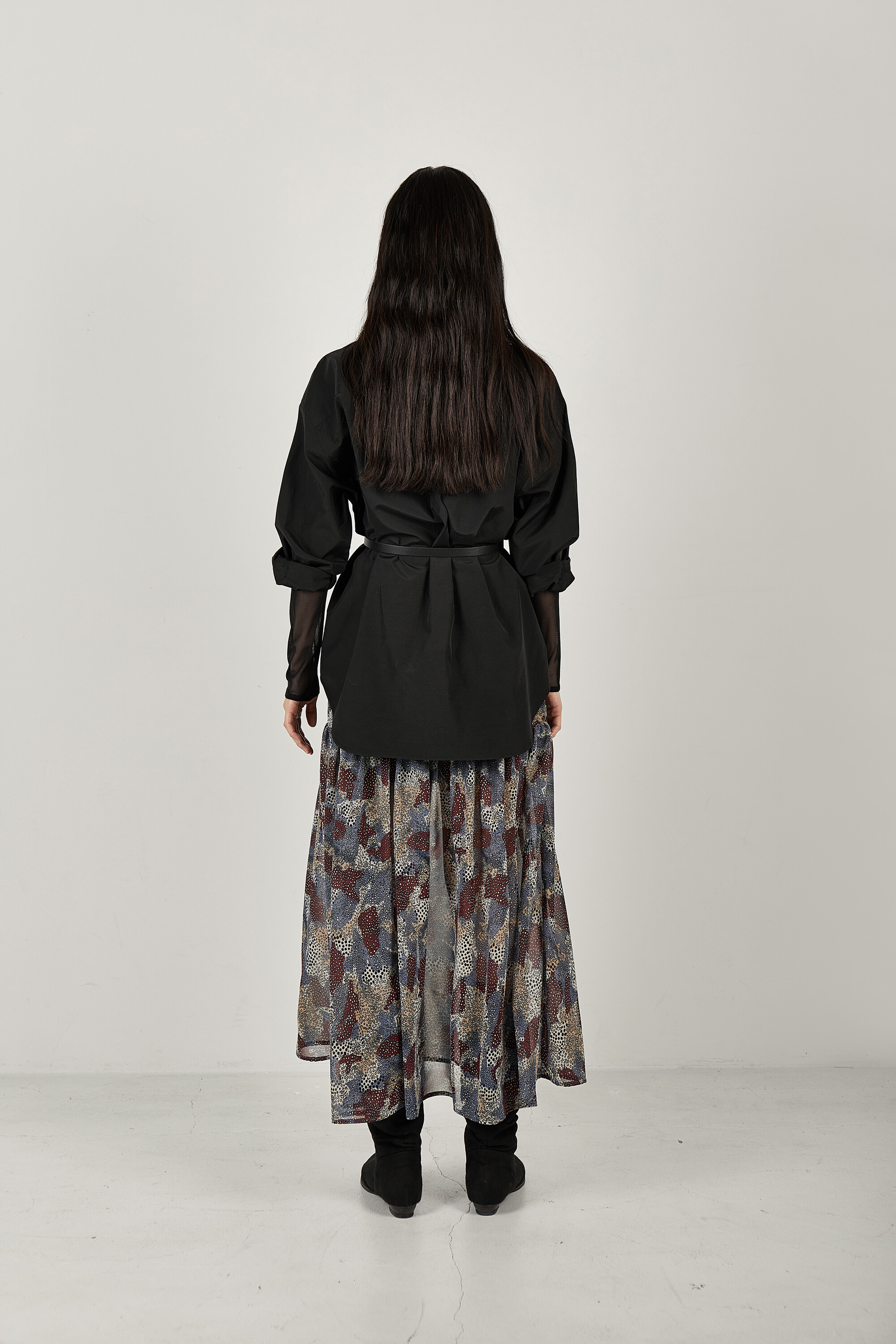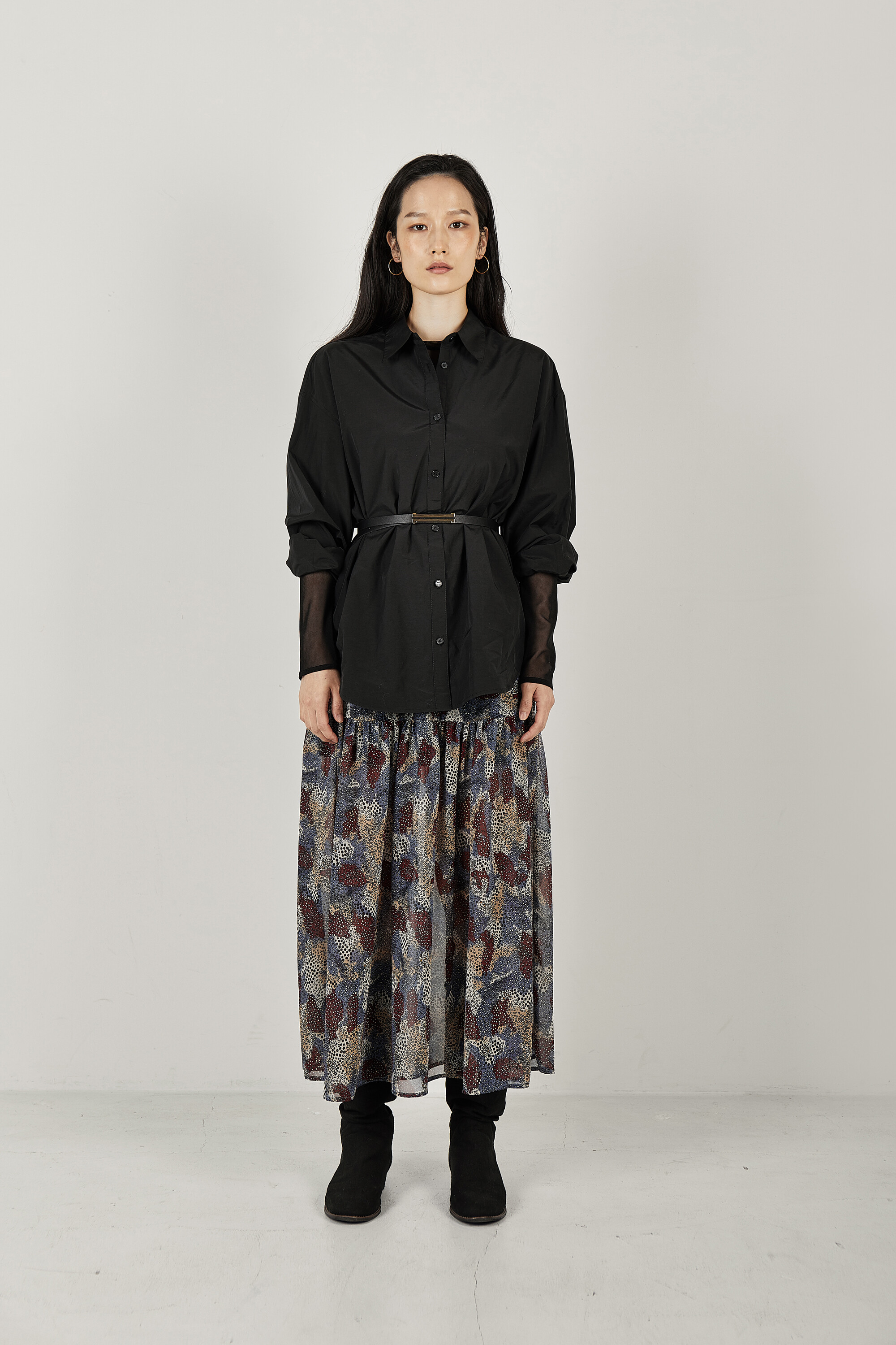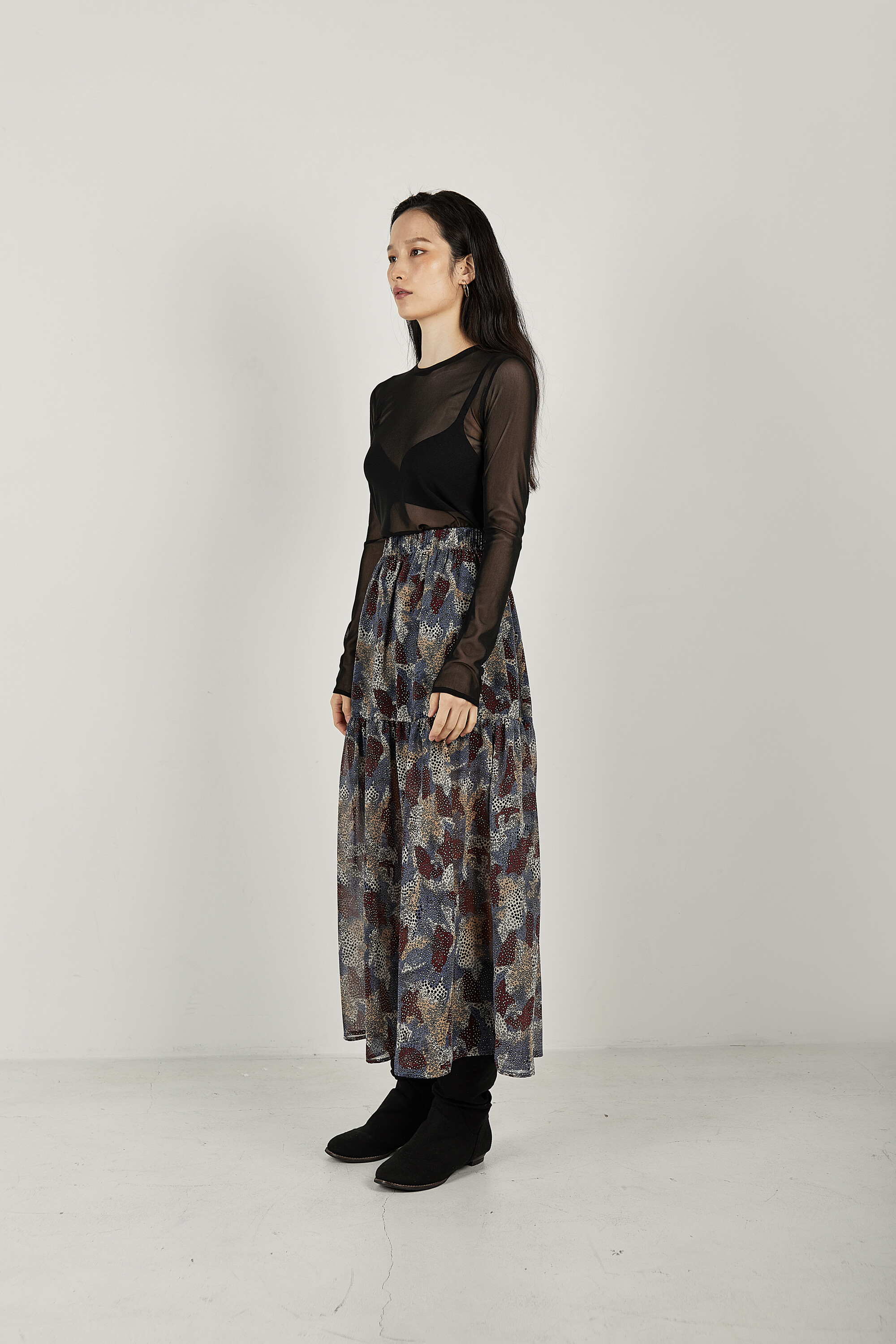 카모플라쥬 형태의 패턴이 가미된 쉬폰 스커트입니다.