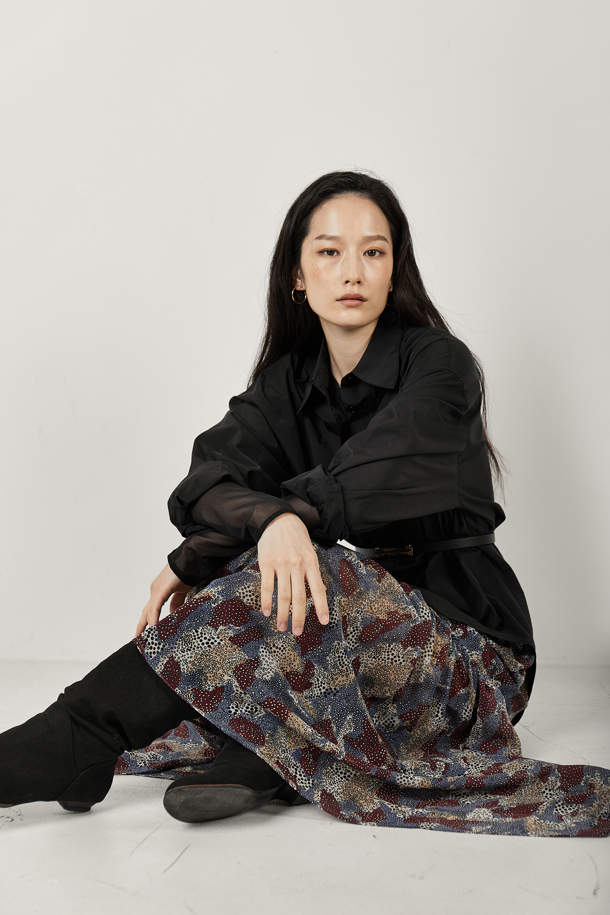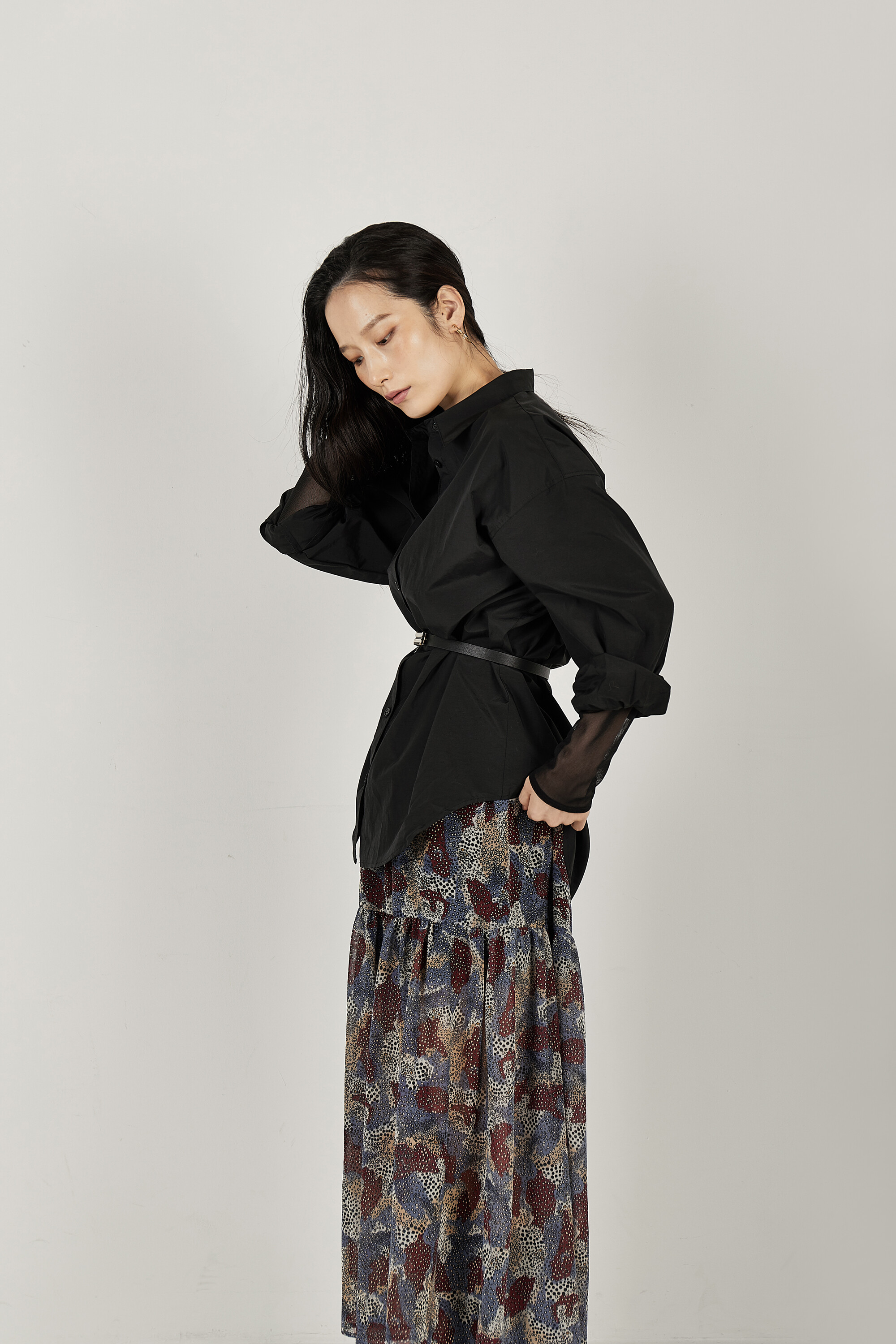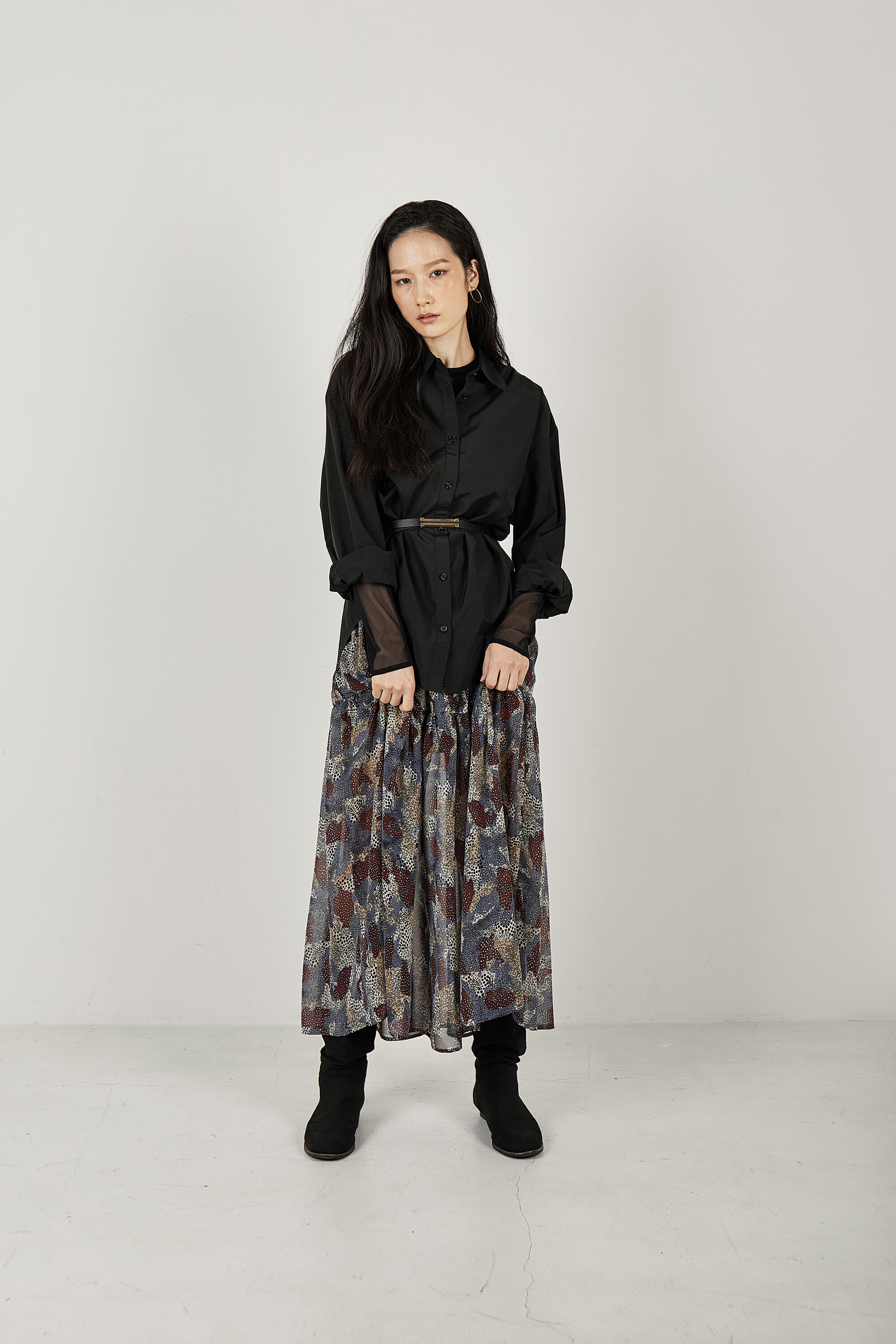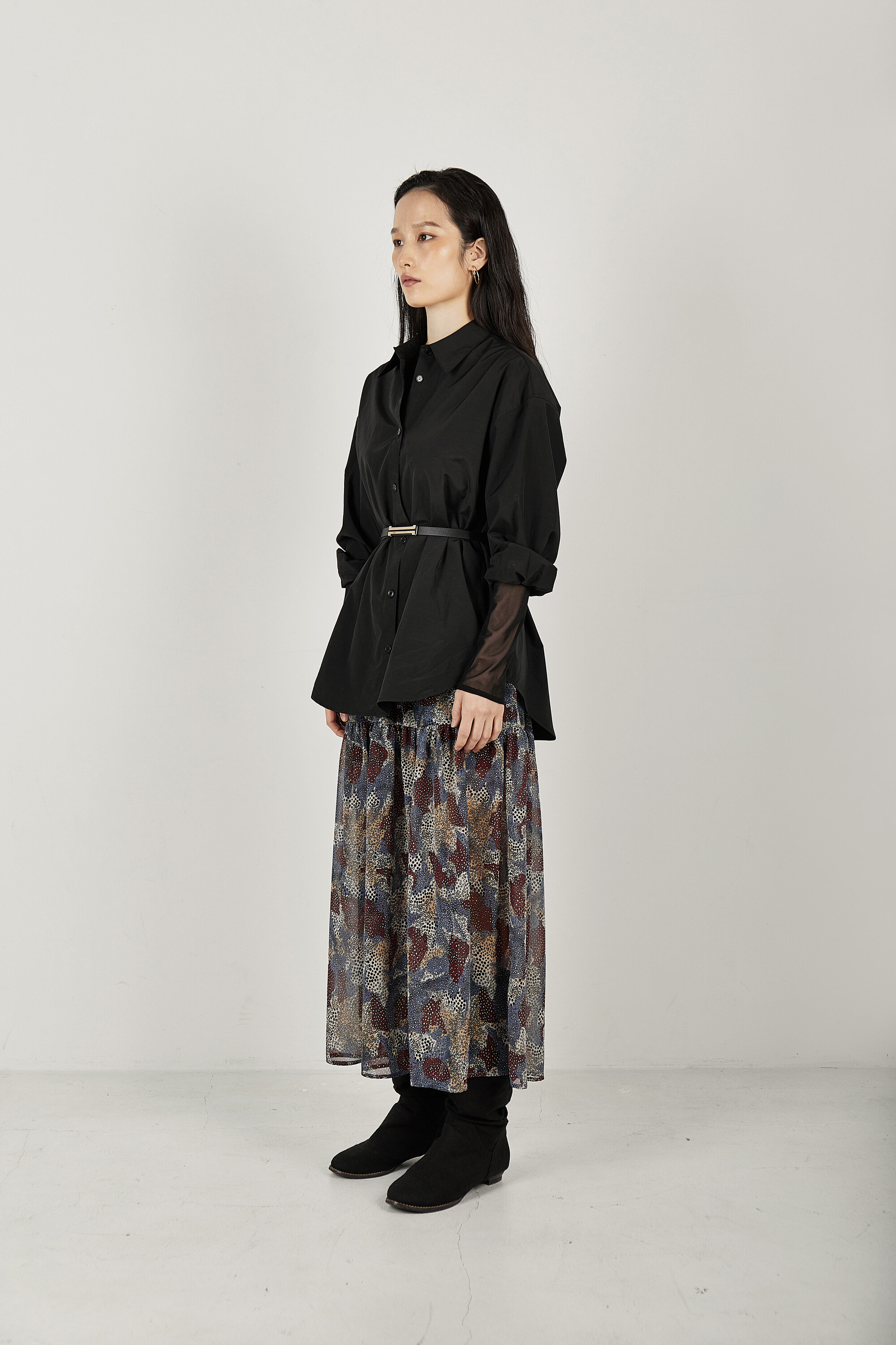 카모플라쥬 형태의 패턴이 가미된 쉬폰 스커트입니다.