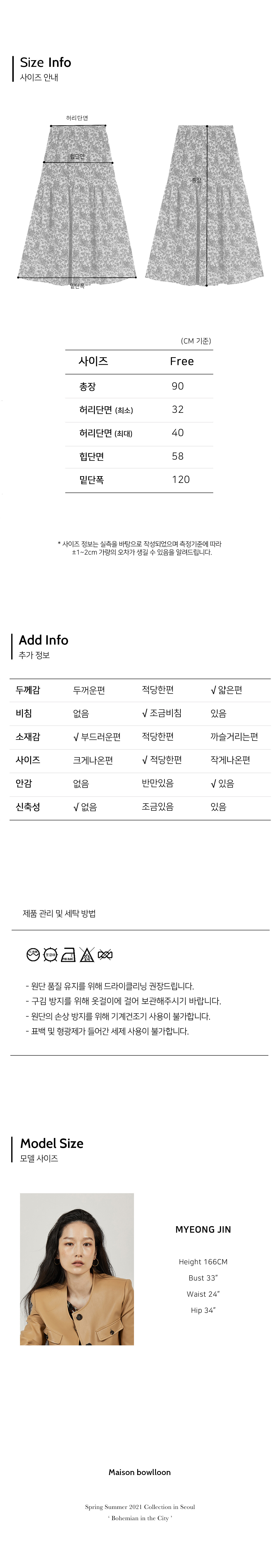 허리밴딩 스타일로 사이즈폭이 넓으며 힙라인 아래로 셔링이 시작되는 곳 까지 속치마가 덧대어져 있습니다.