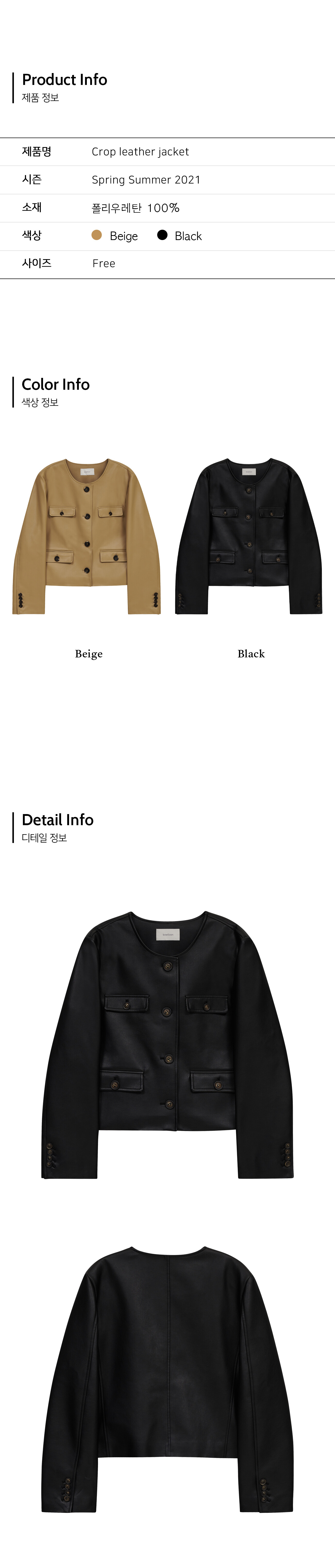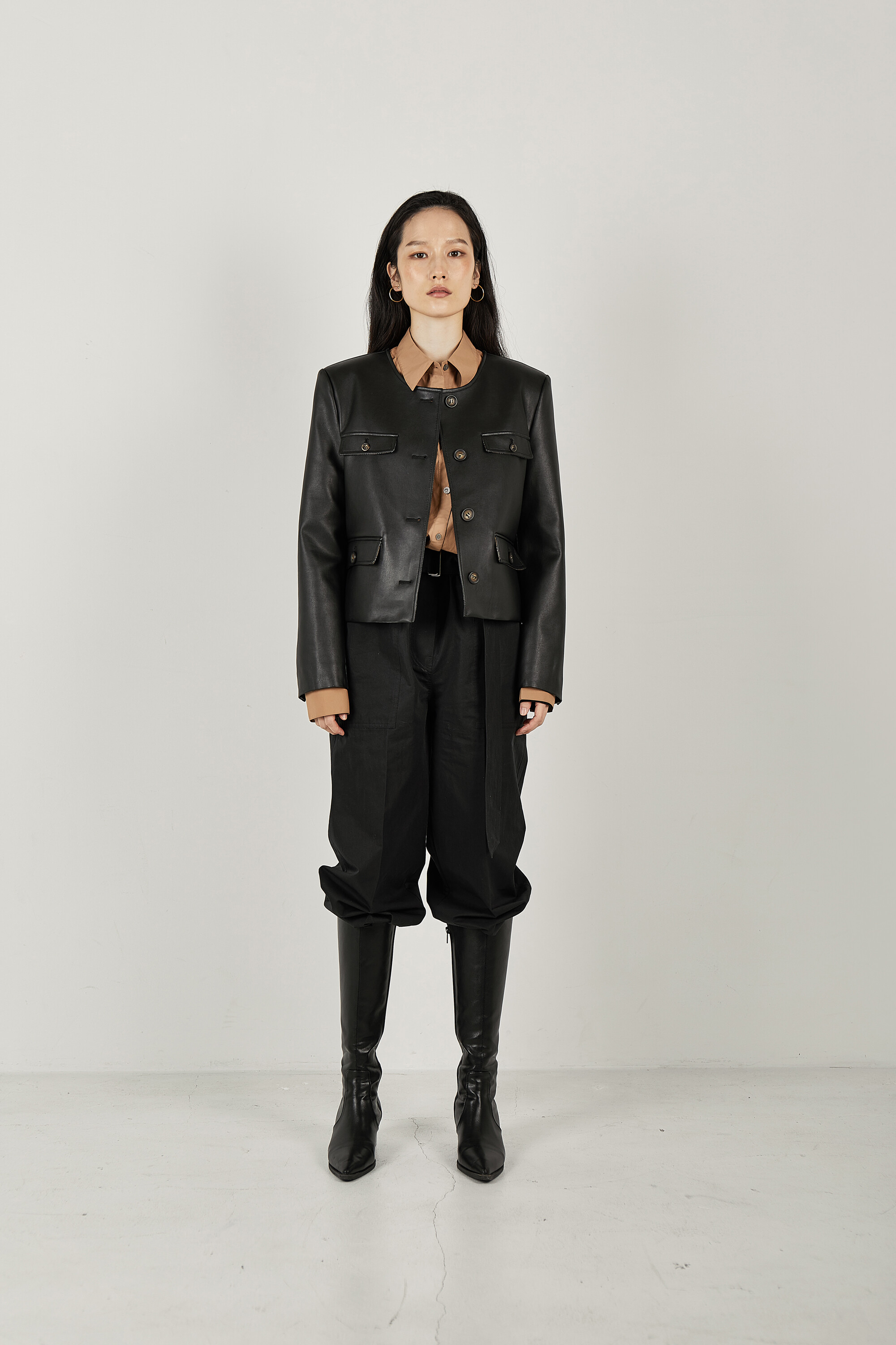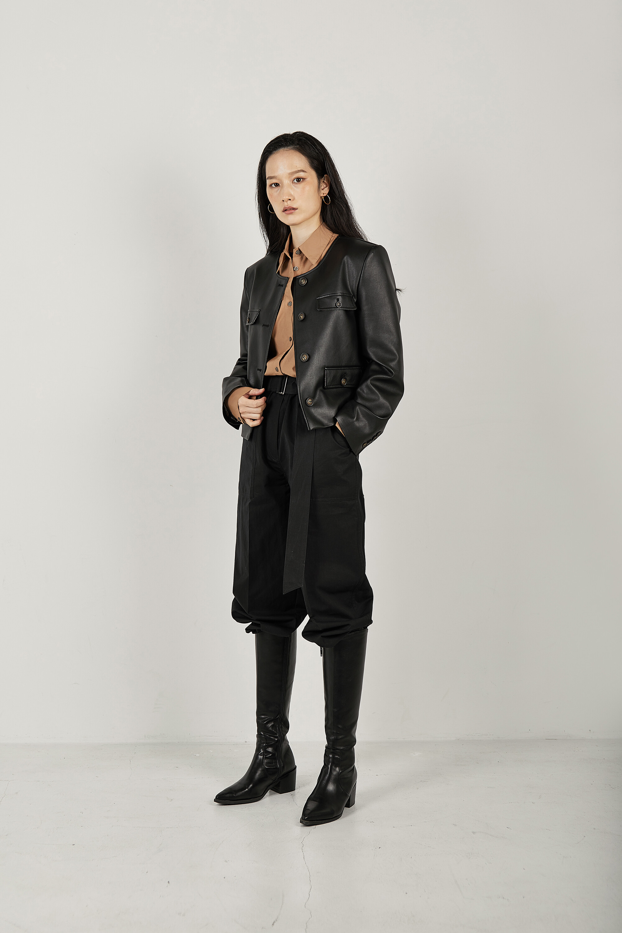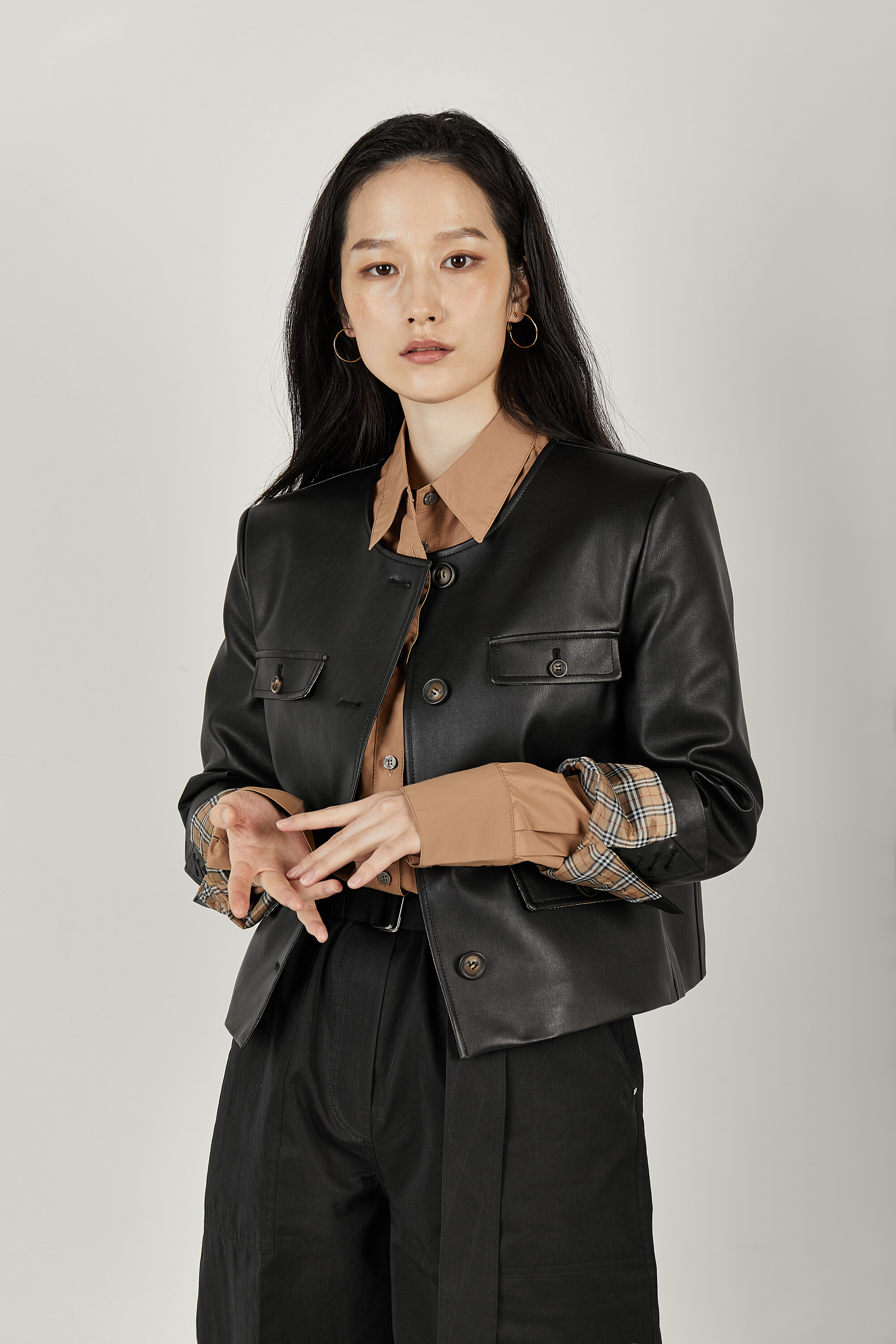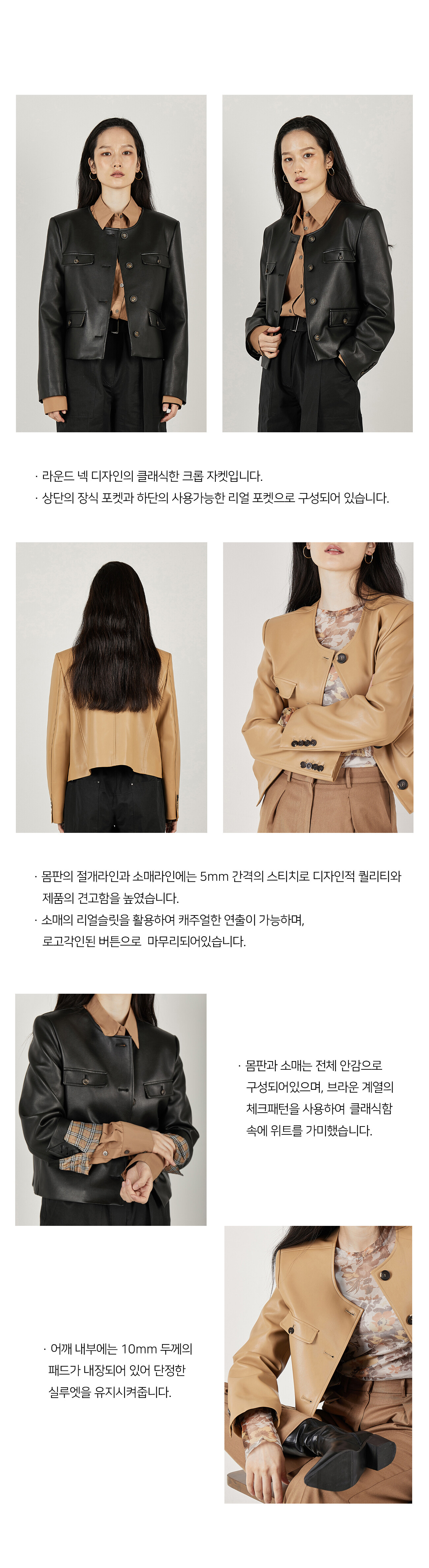 비건레더로 제작된 라운드 넥의 크롭 자켓입니다.