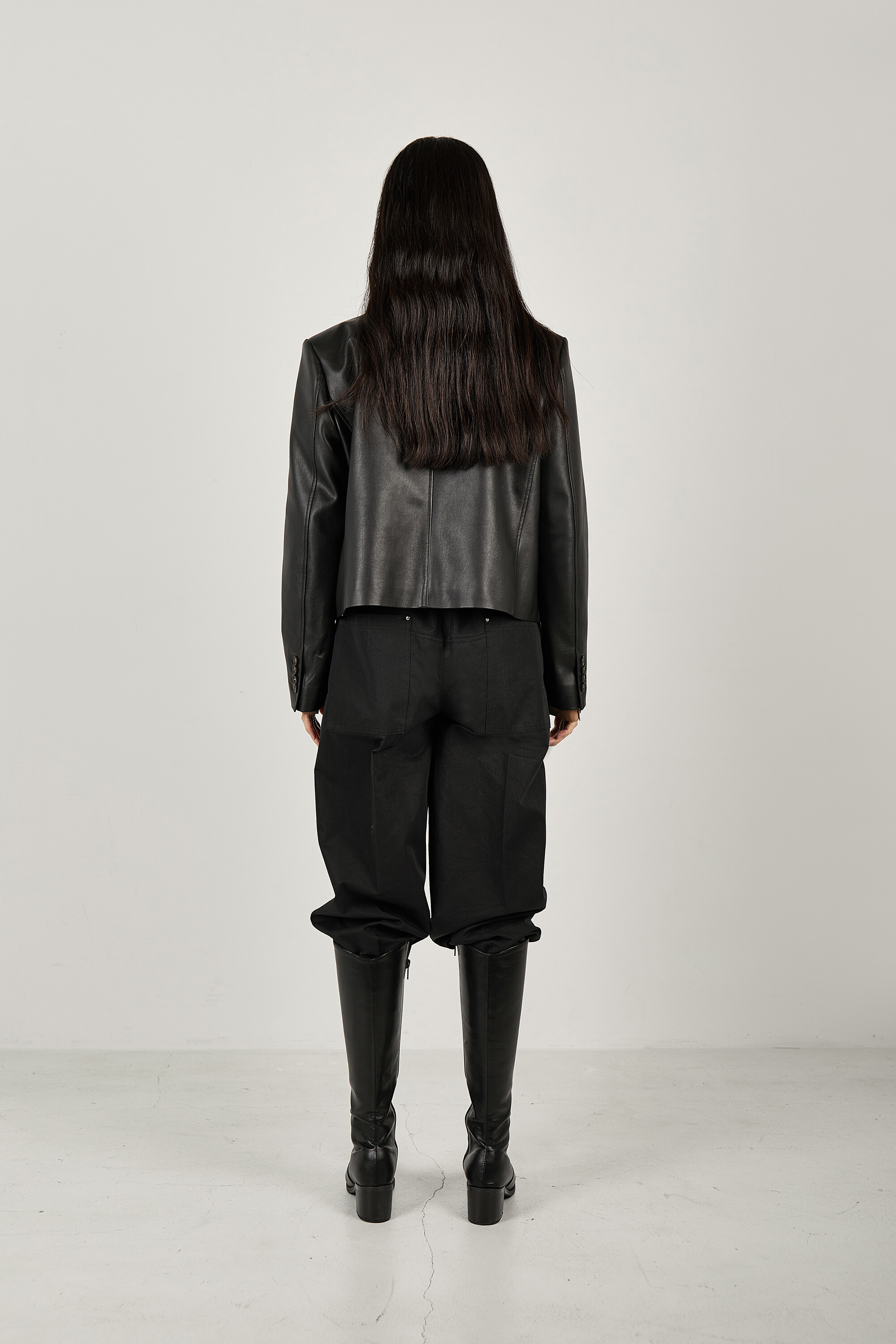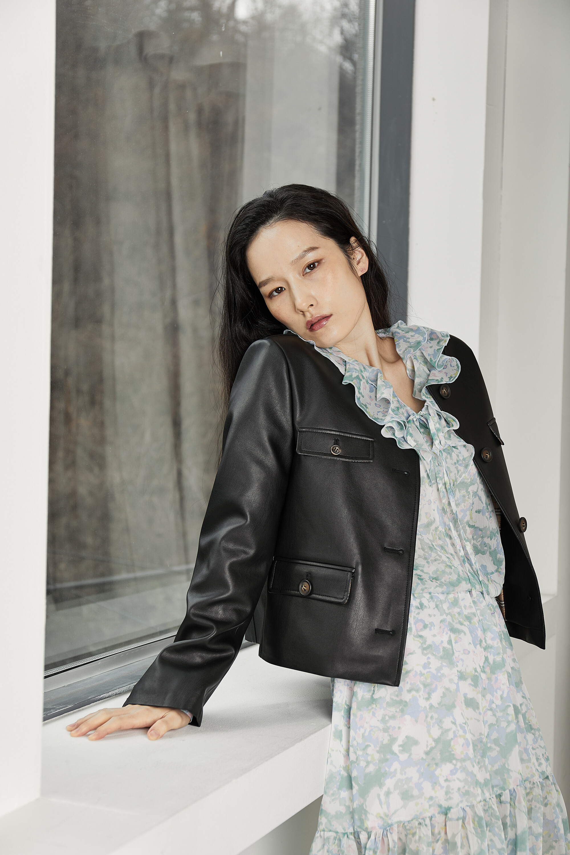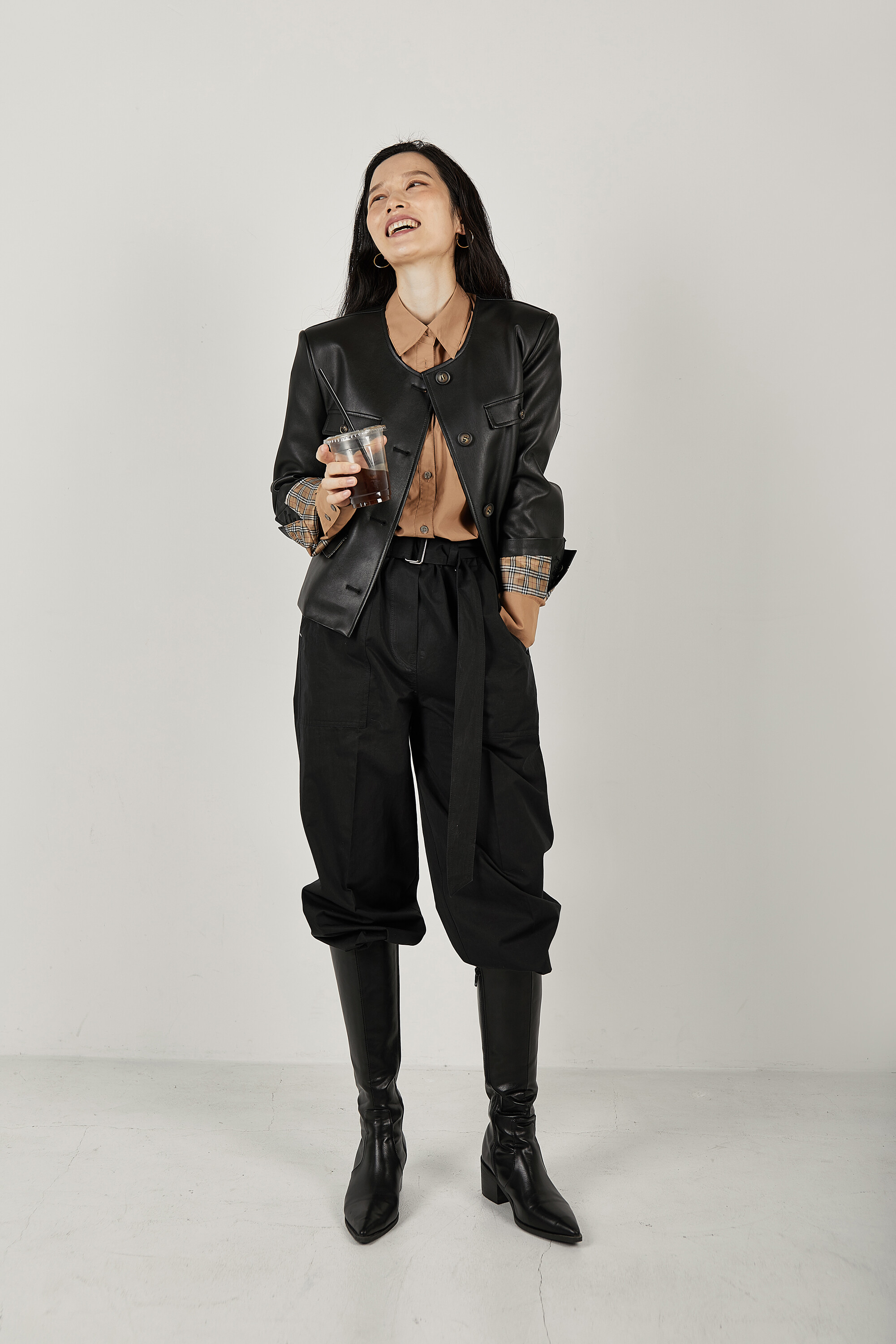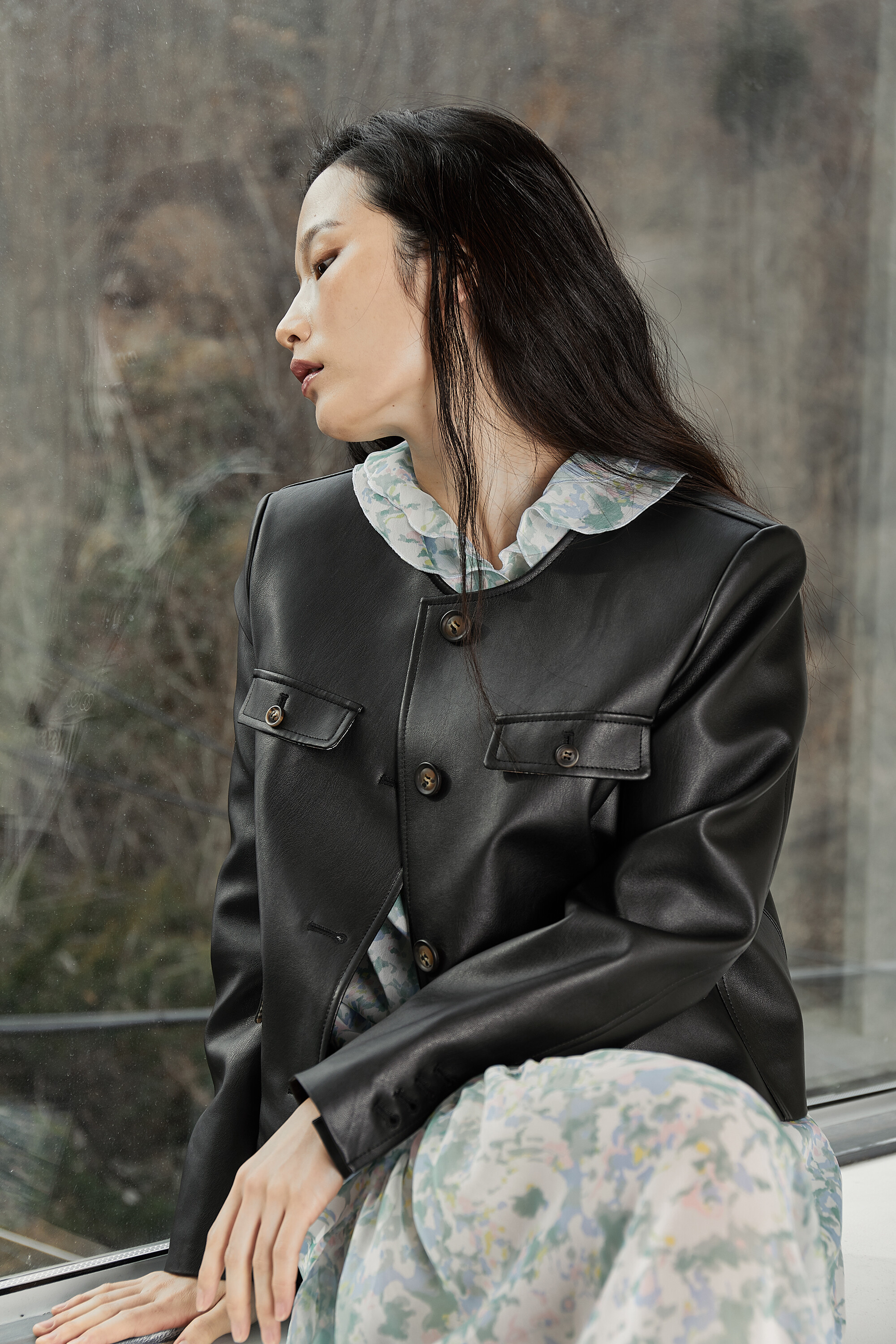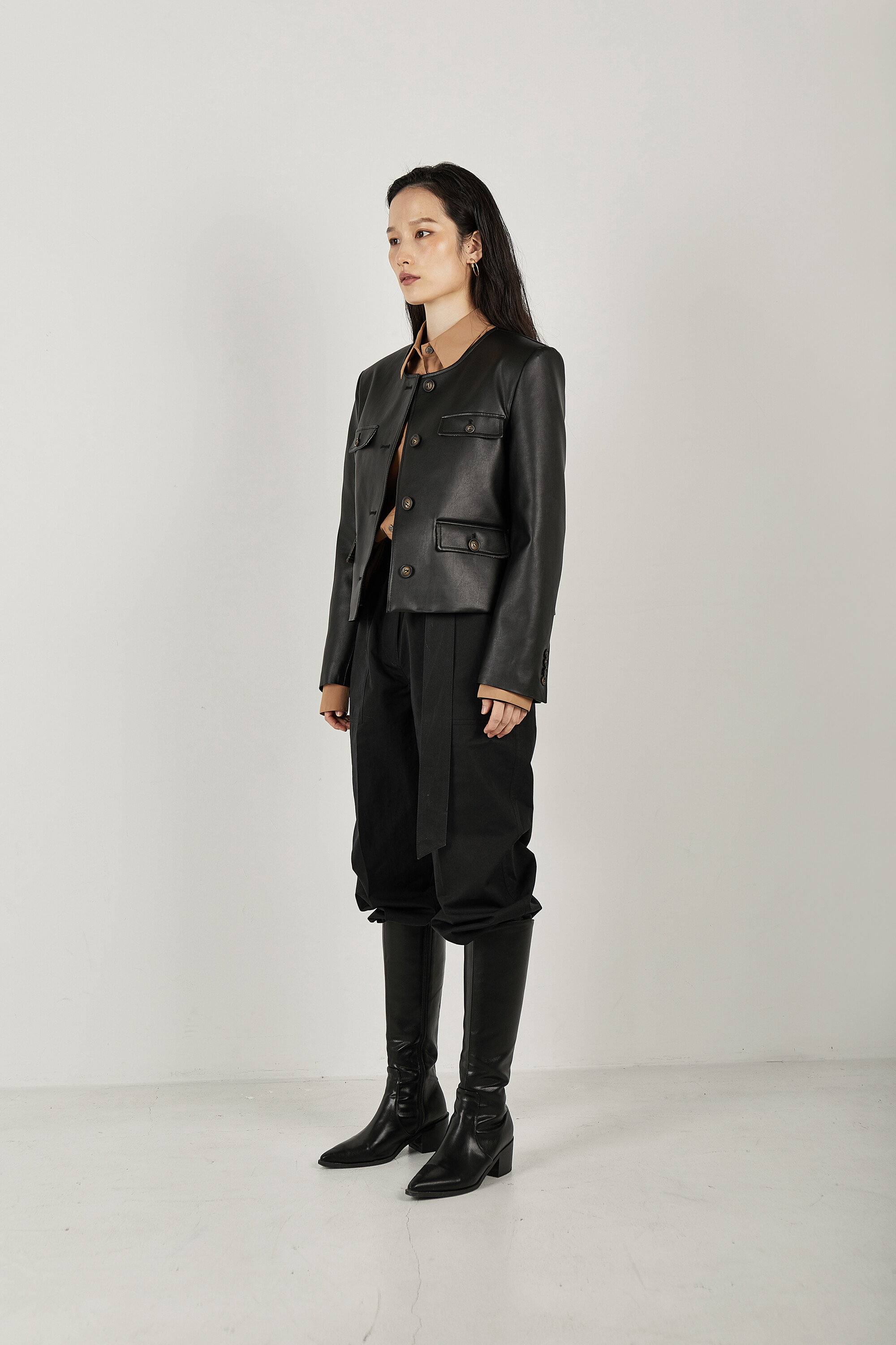 비건레더로 제작된 라운드 넥의 크롭 자켓입니다.