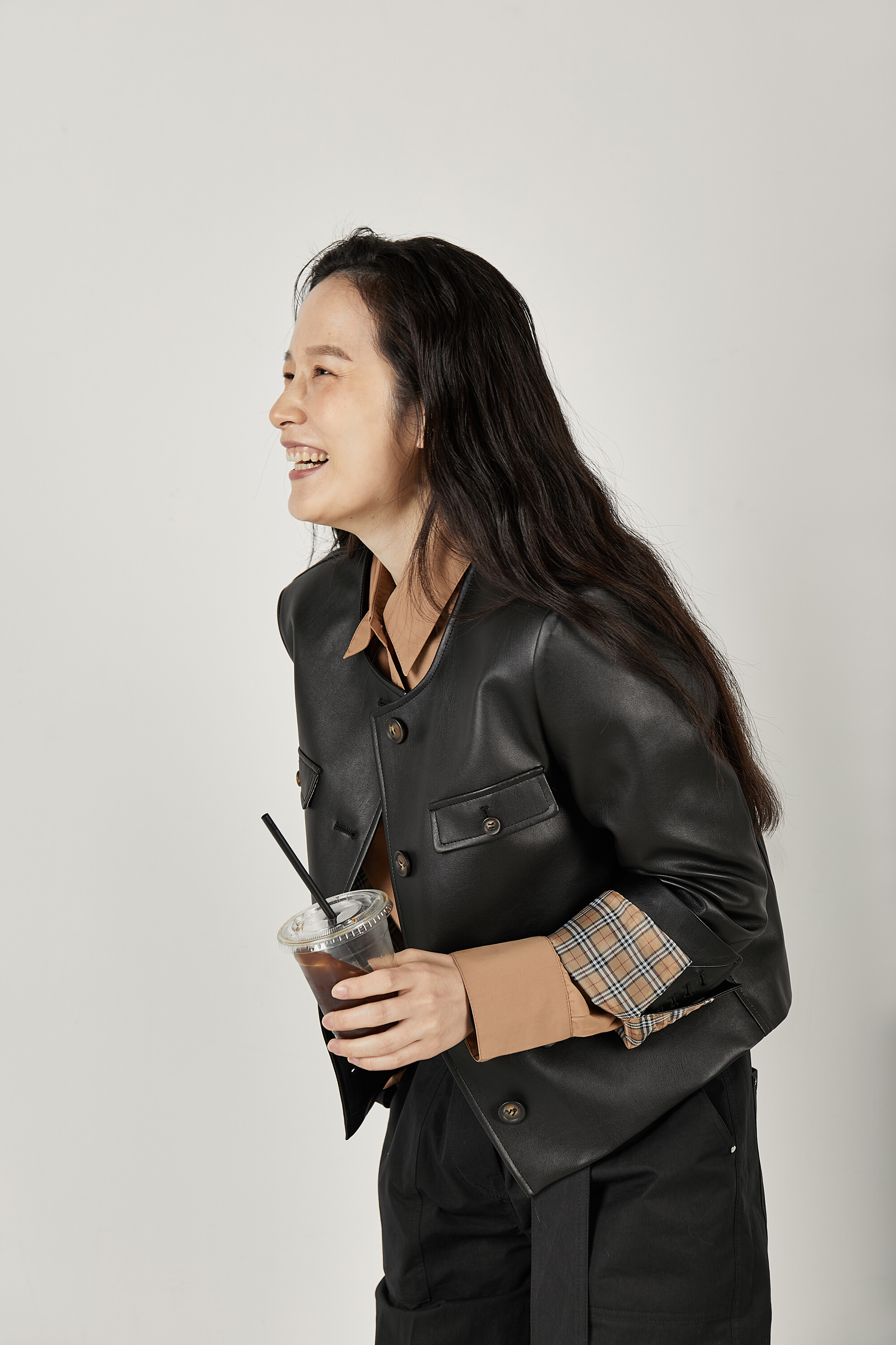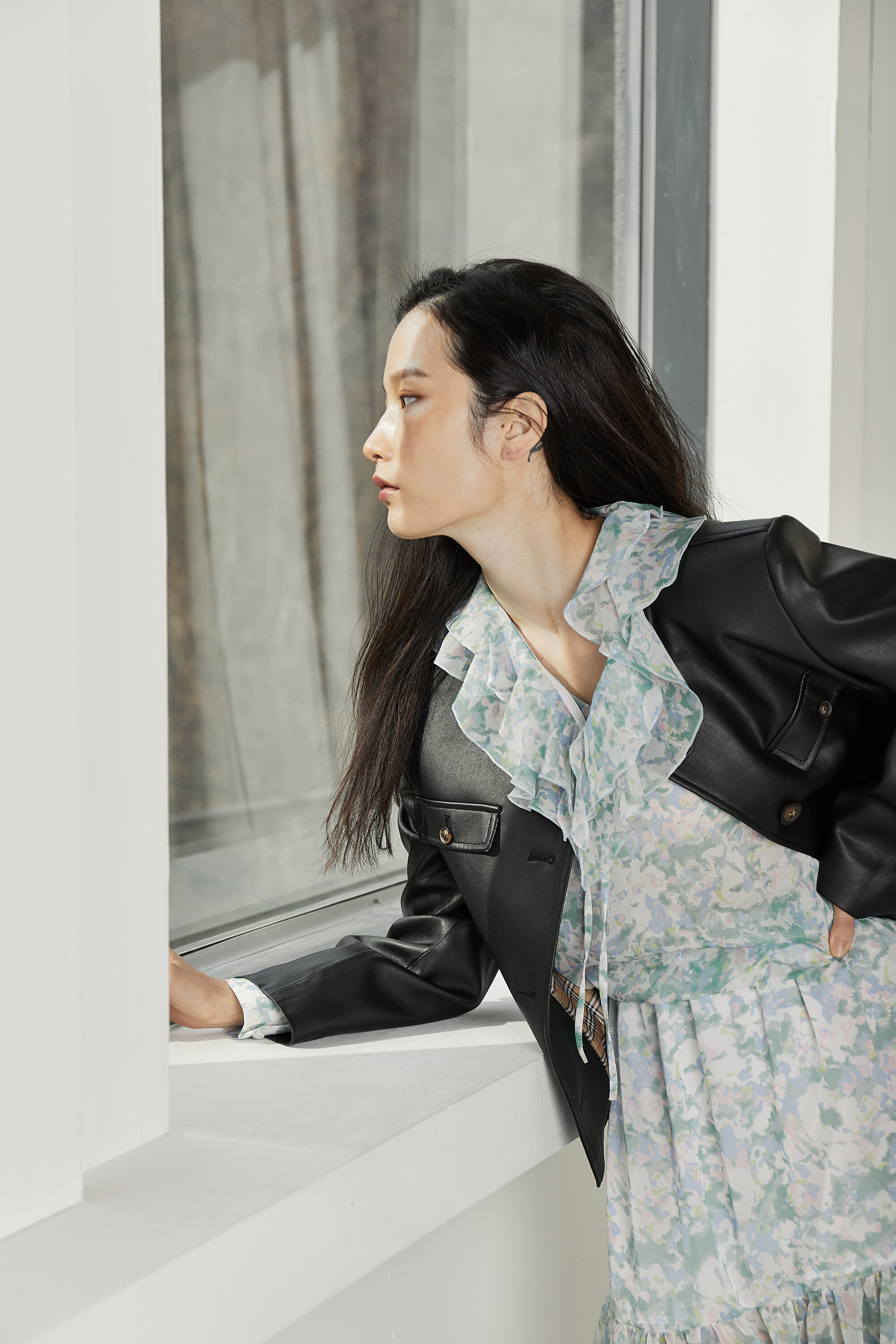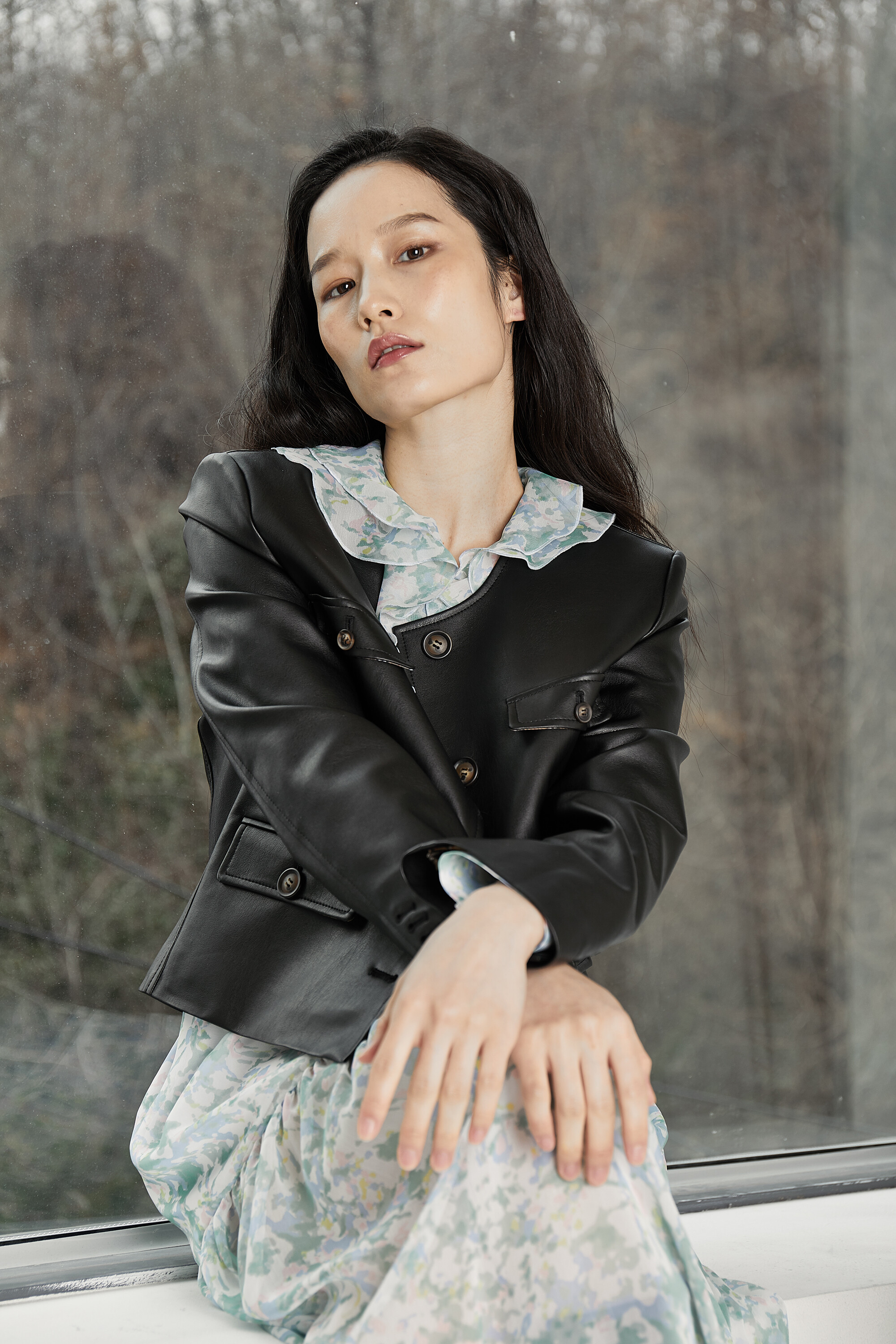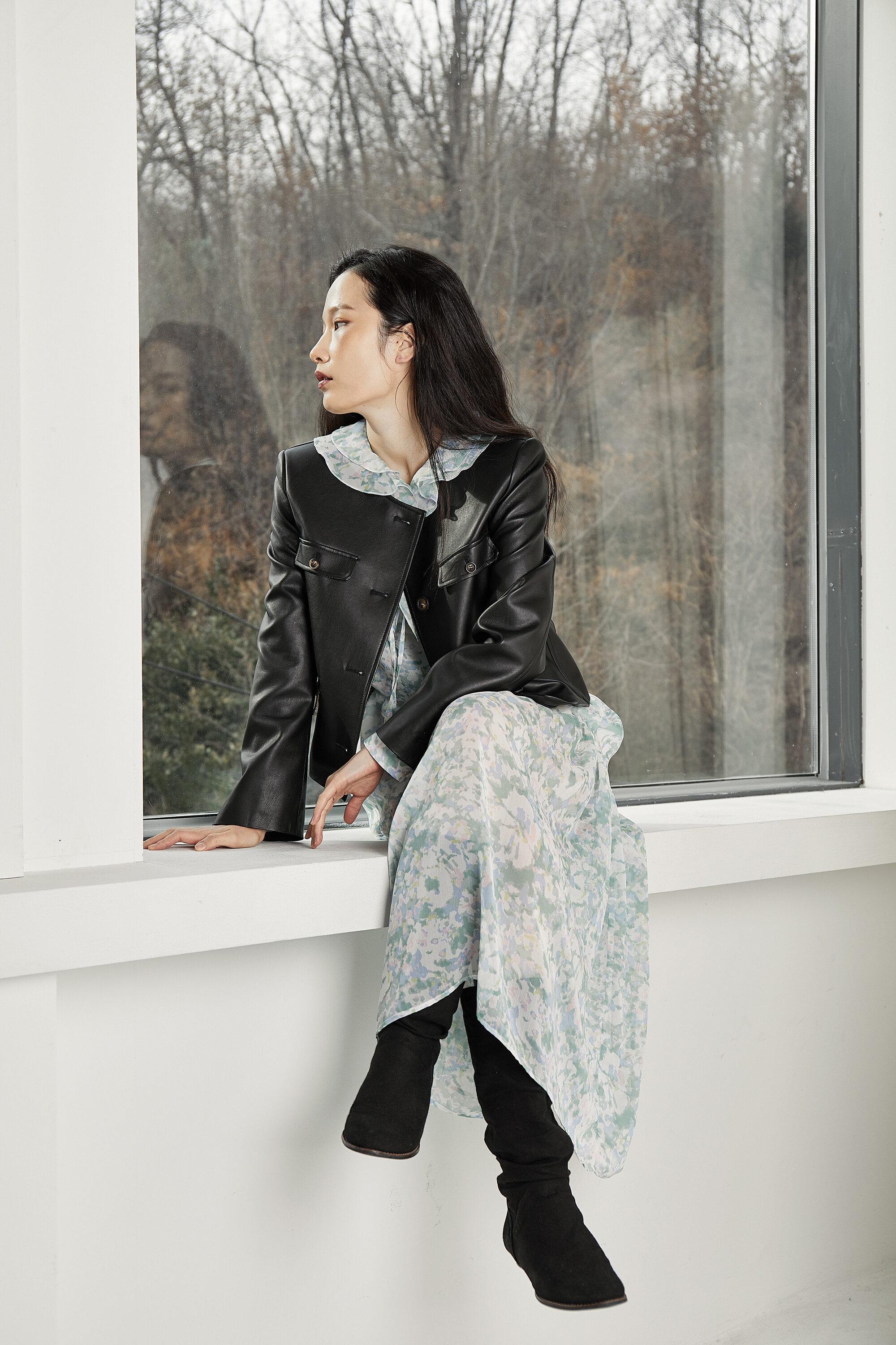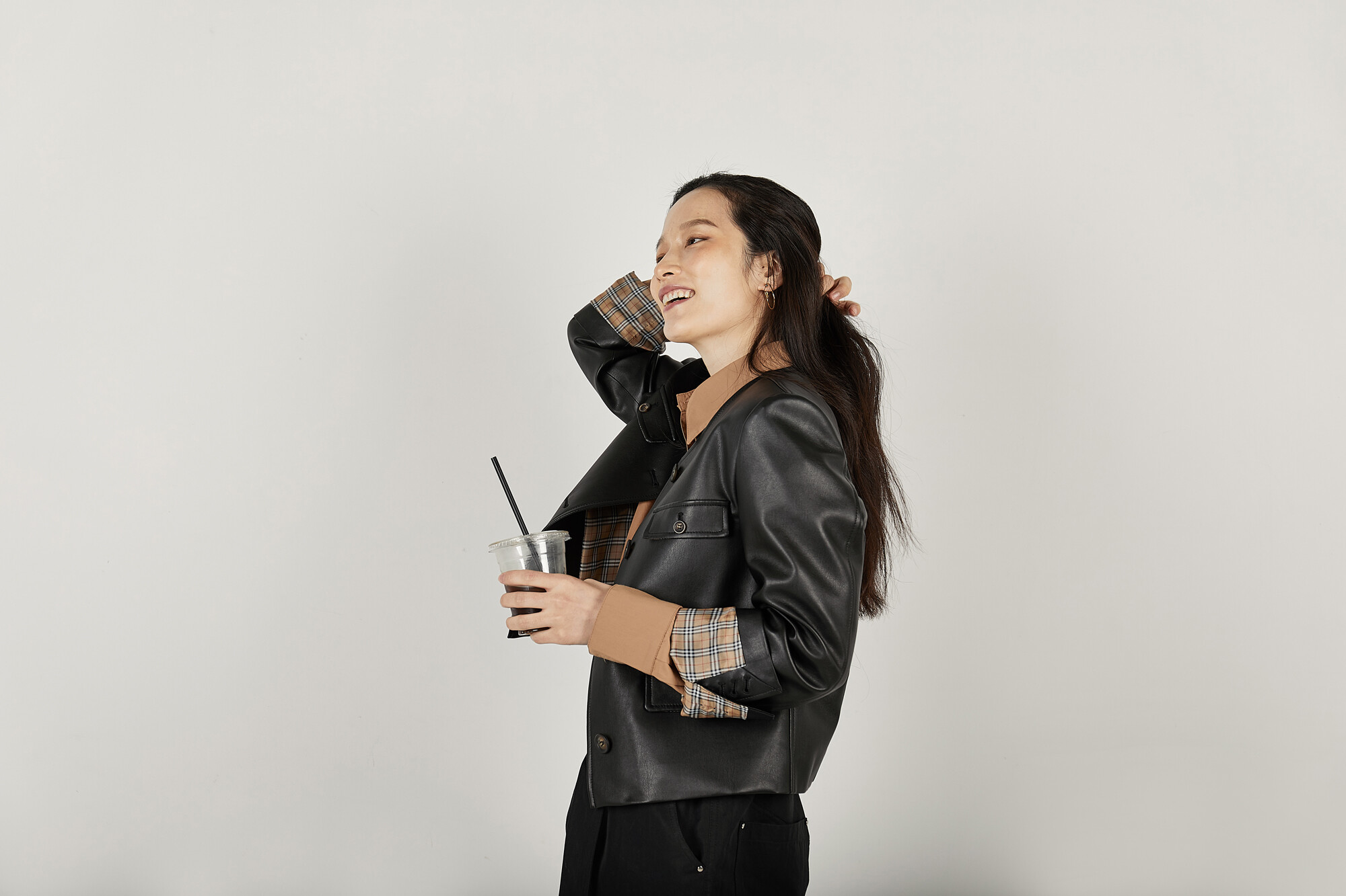 비건레더로 제작된 라운드 넥의 크롭 자켓입니다.