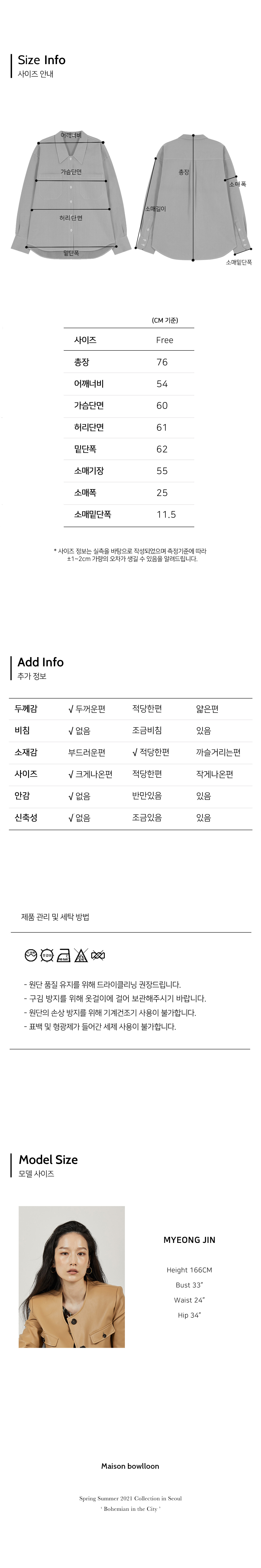 총장 76 / 어깨너비 54 / 가슴단면 60 / 소매길이 55
