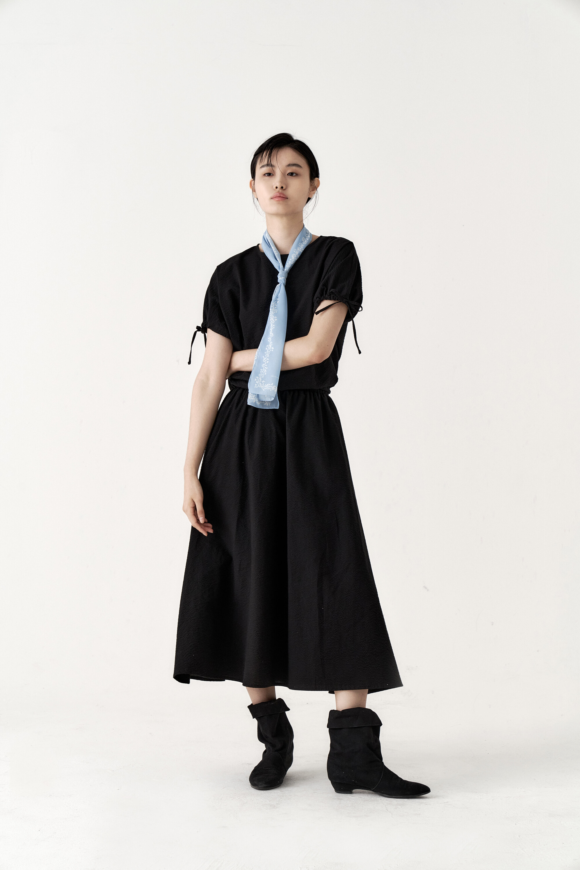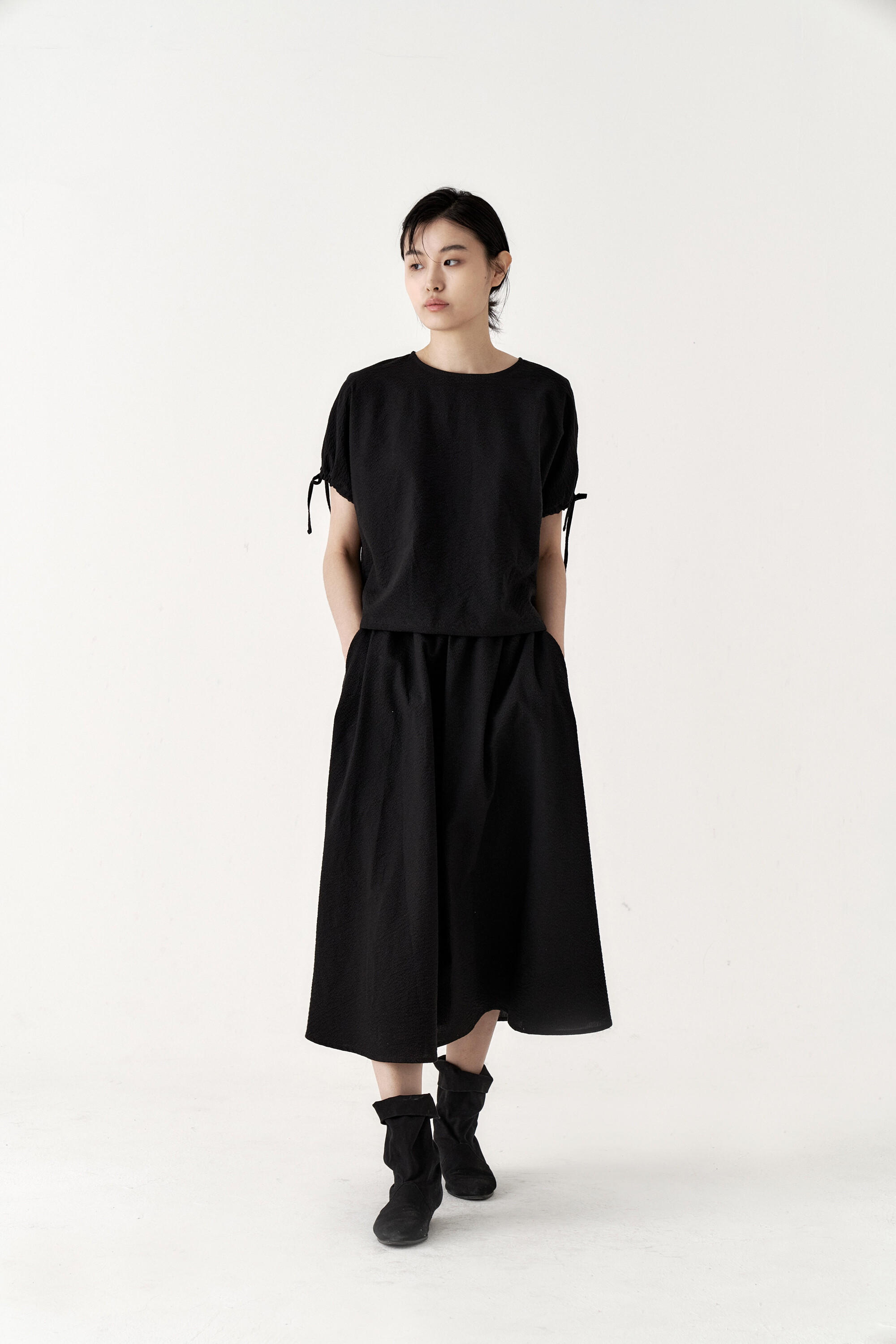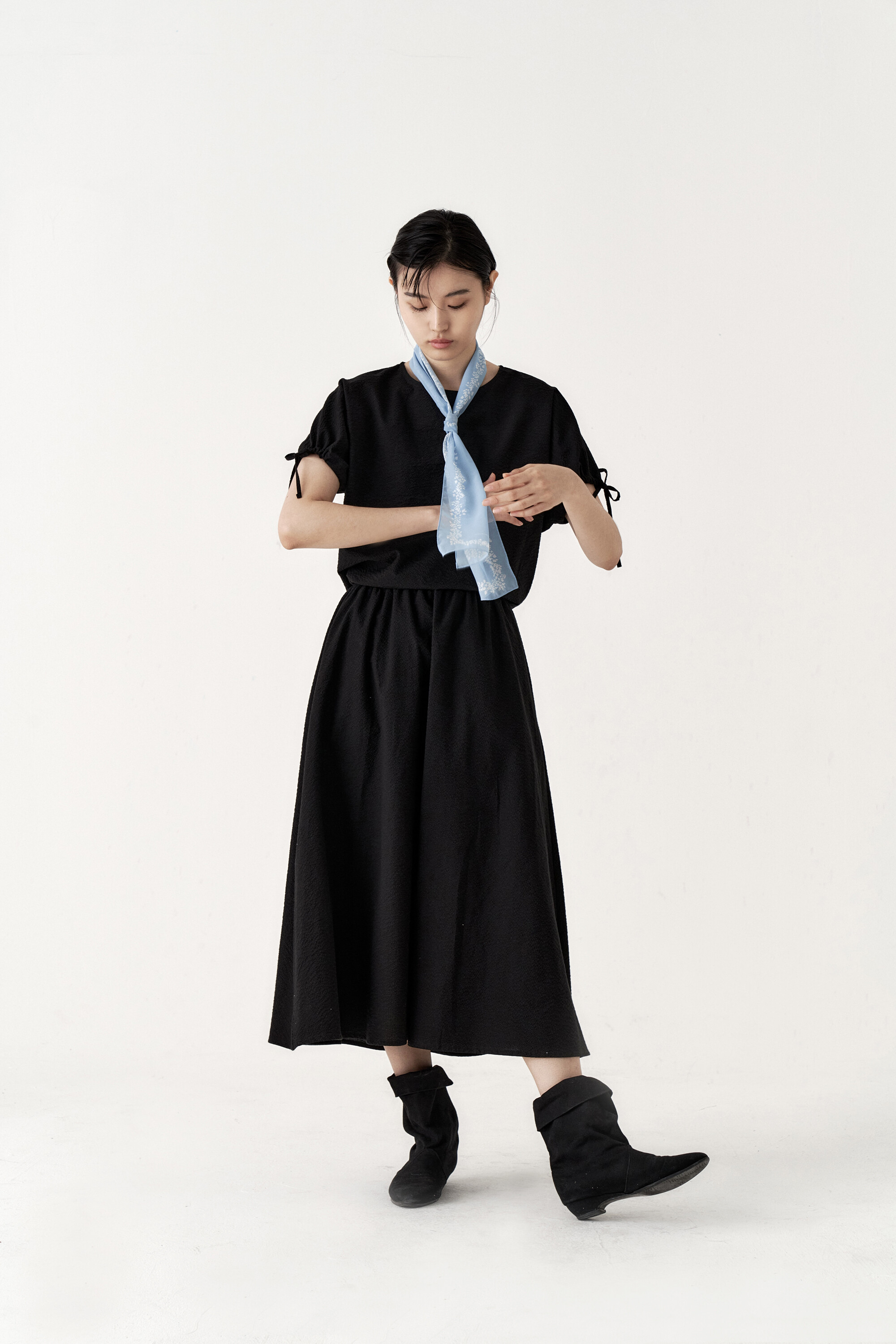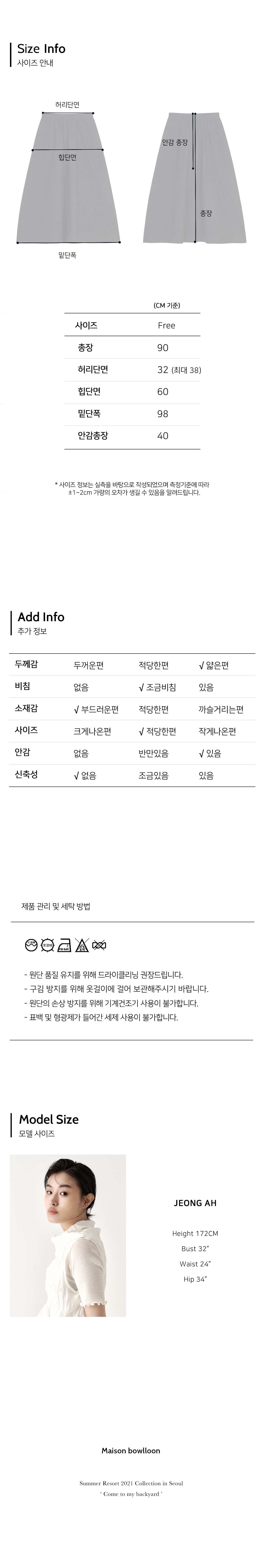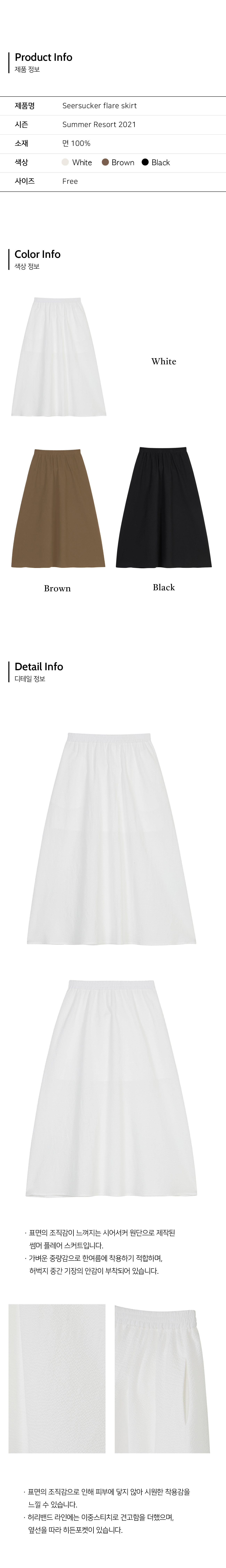원단 표면에 엠보가 느껴지는 시어서커 원단으로 제작된 썸머 플레어 스커트입니다.