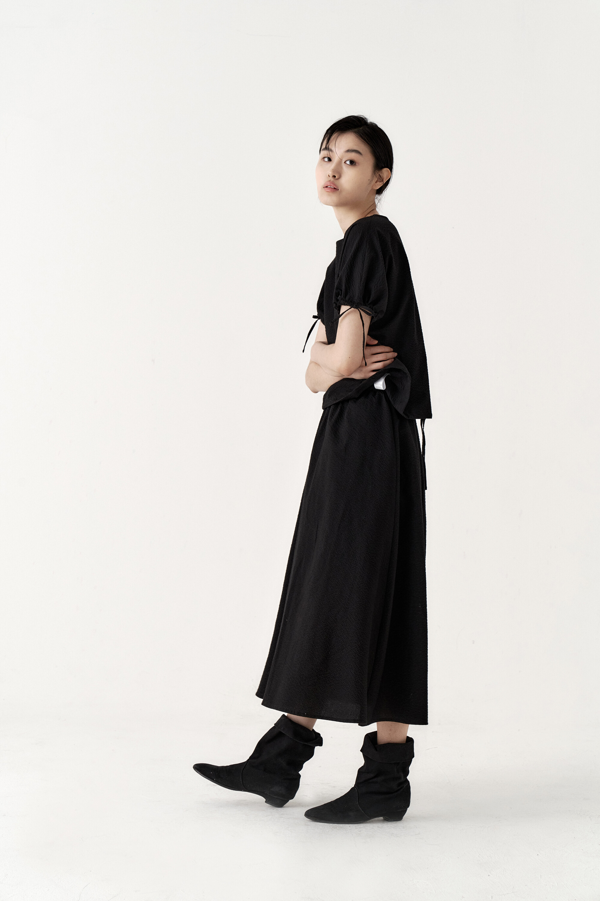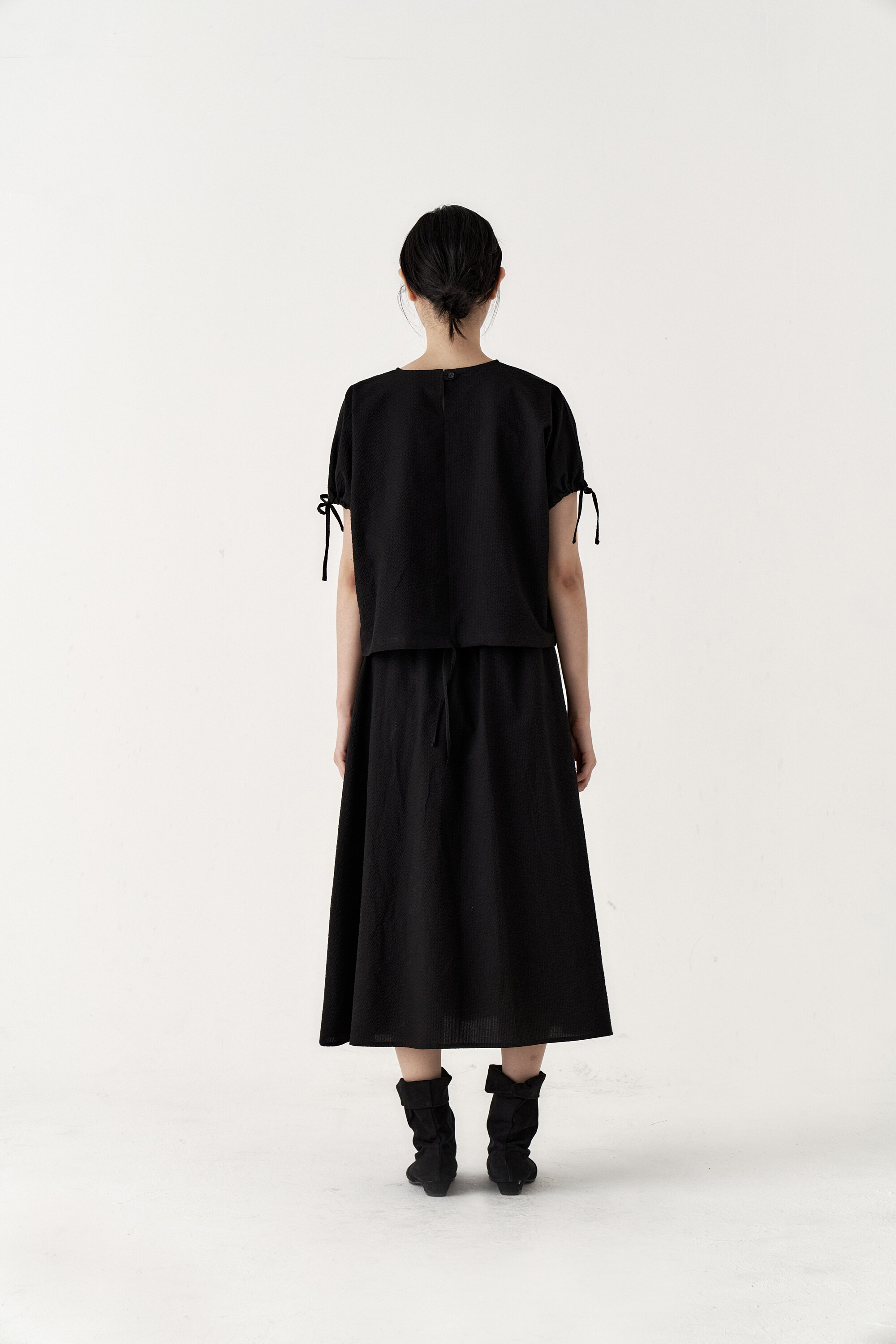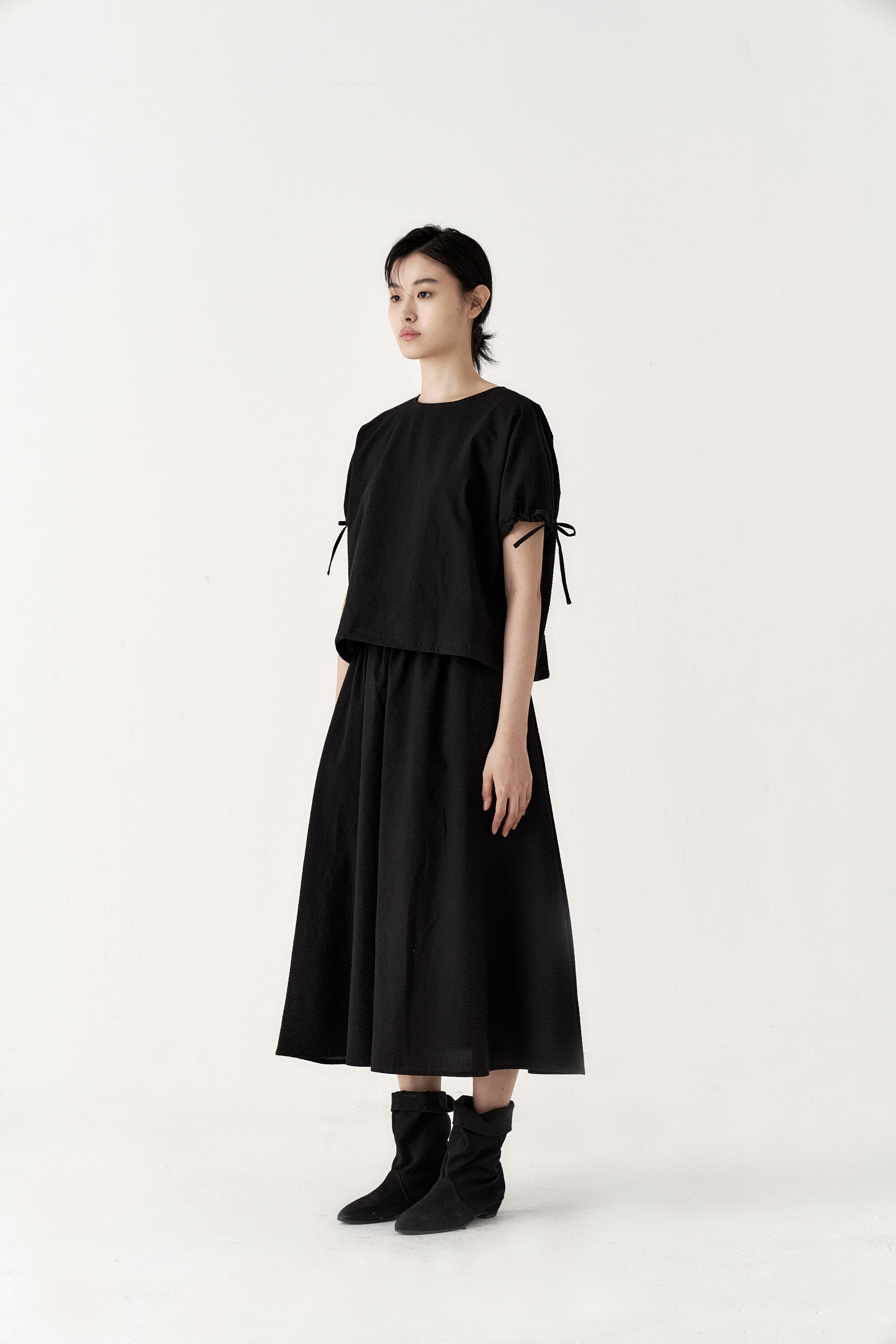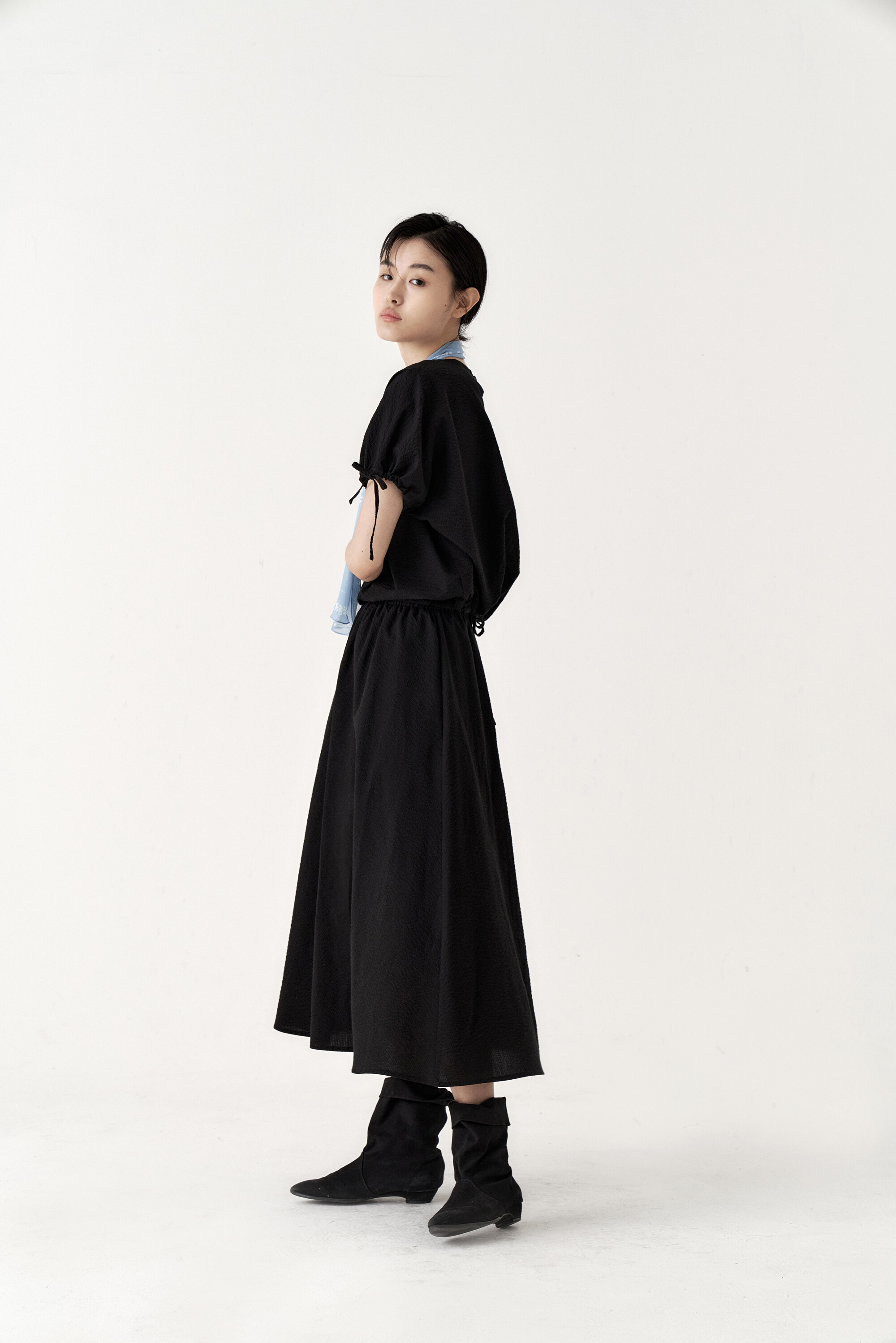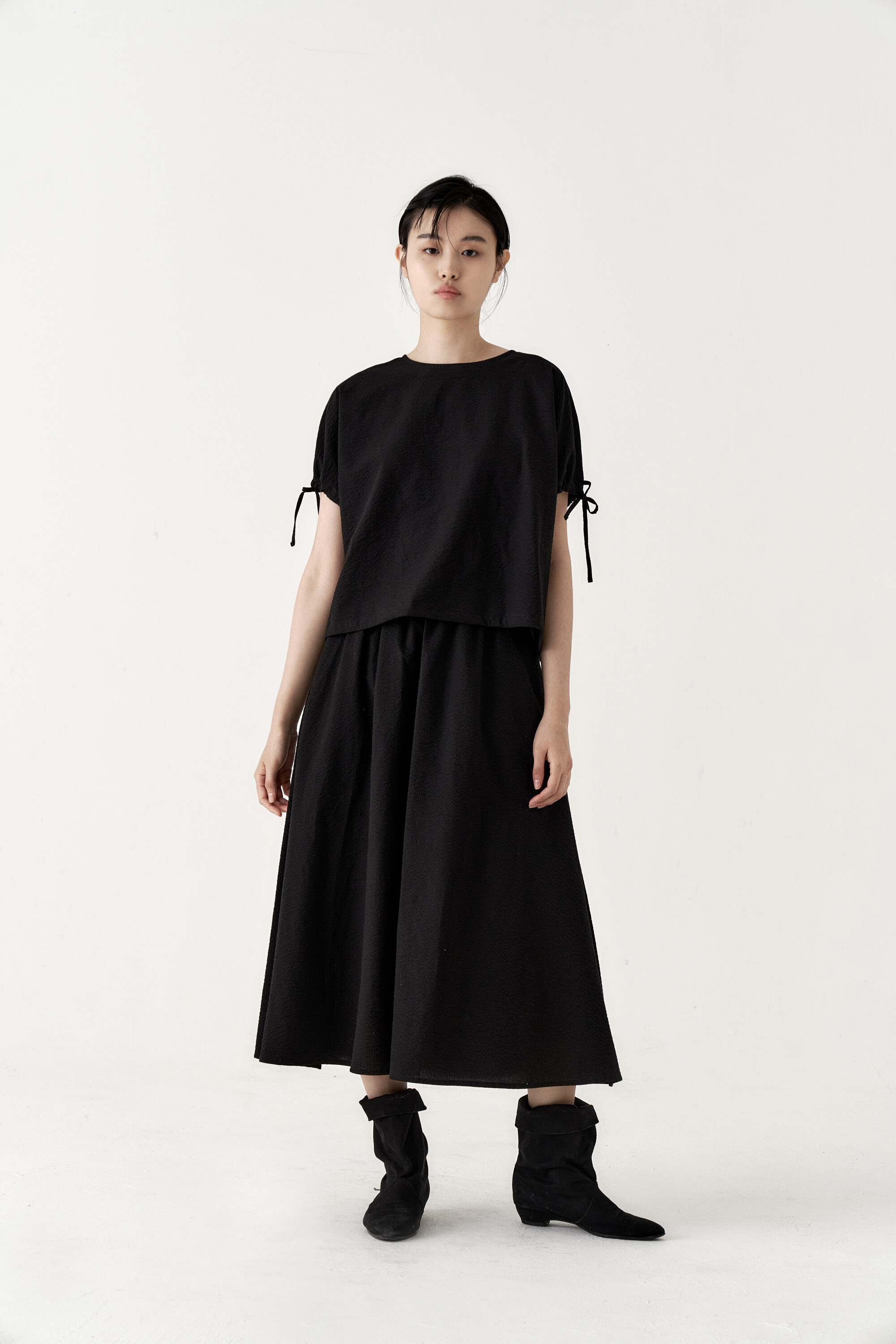 원단 표면에 엠보가 느껴지는 시어서커 원단으로 제작된 썸머 플레어 스커트입니다.