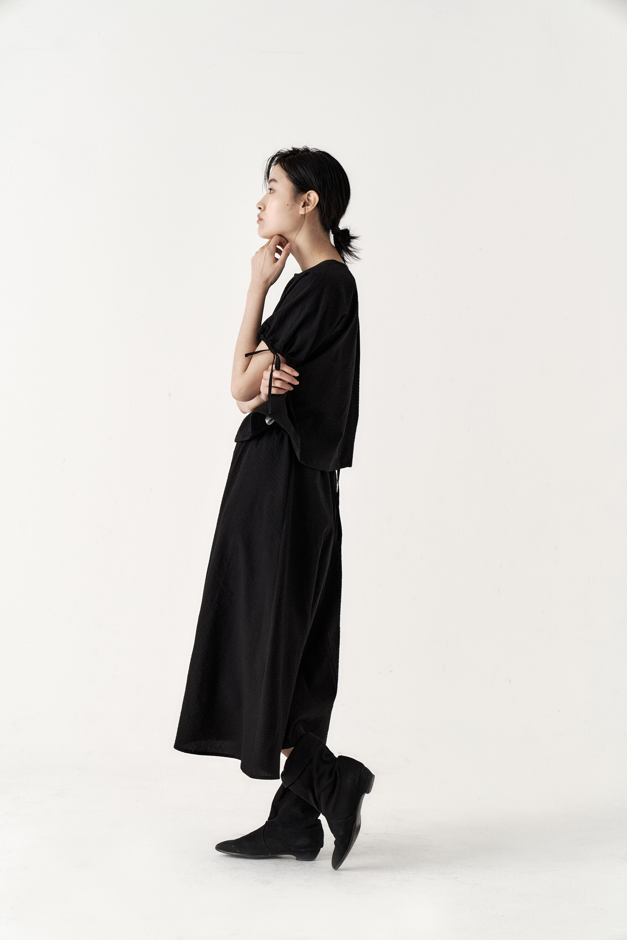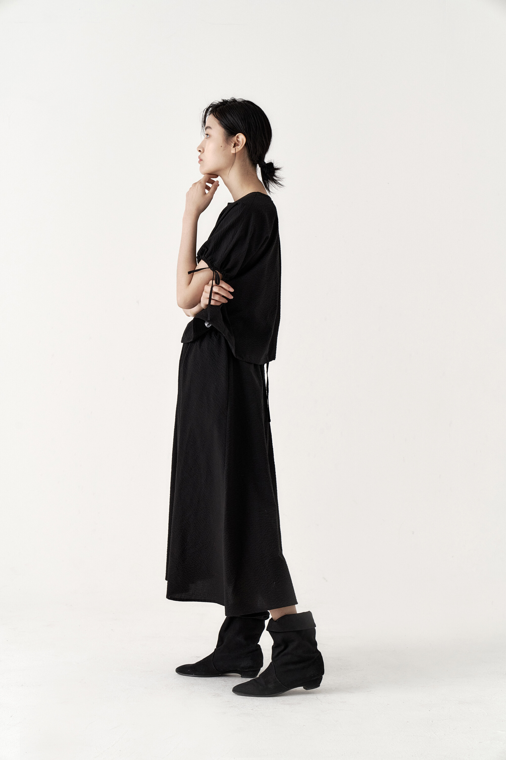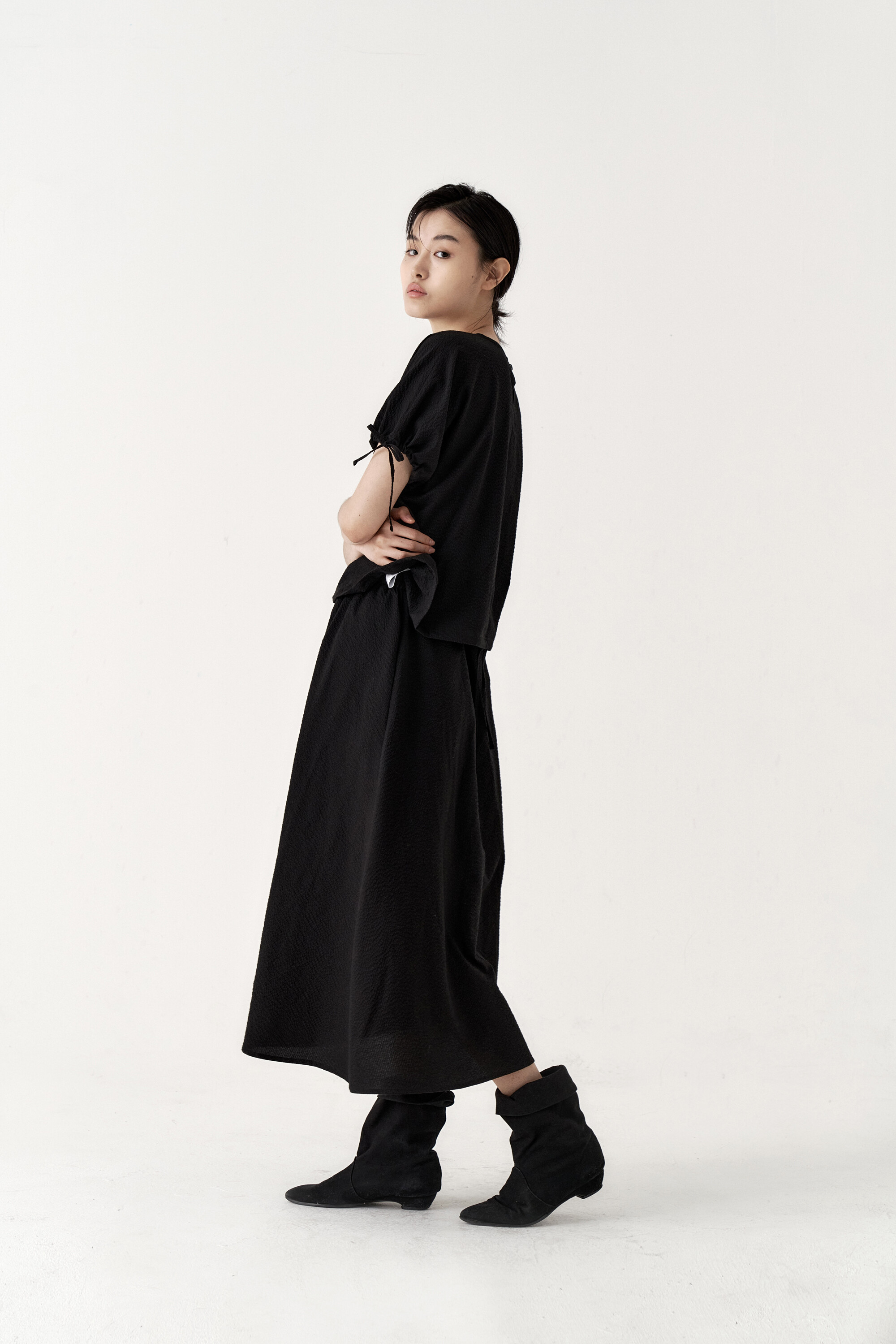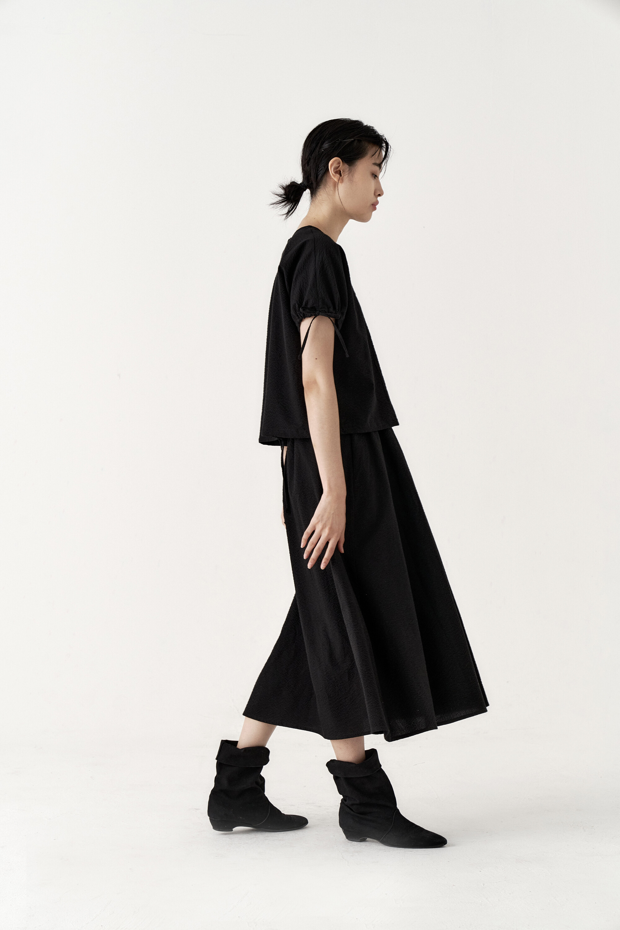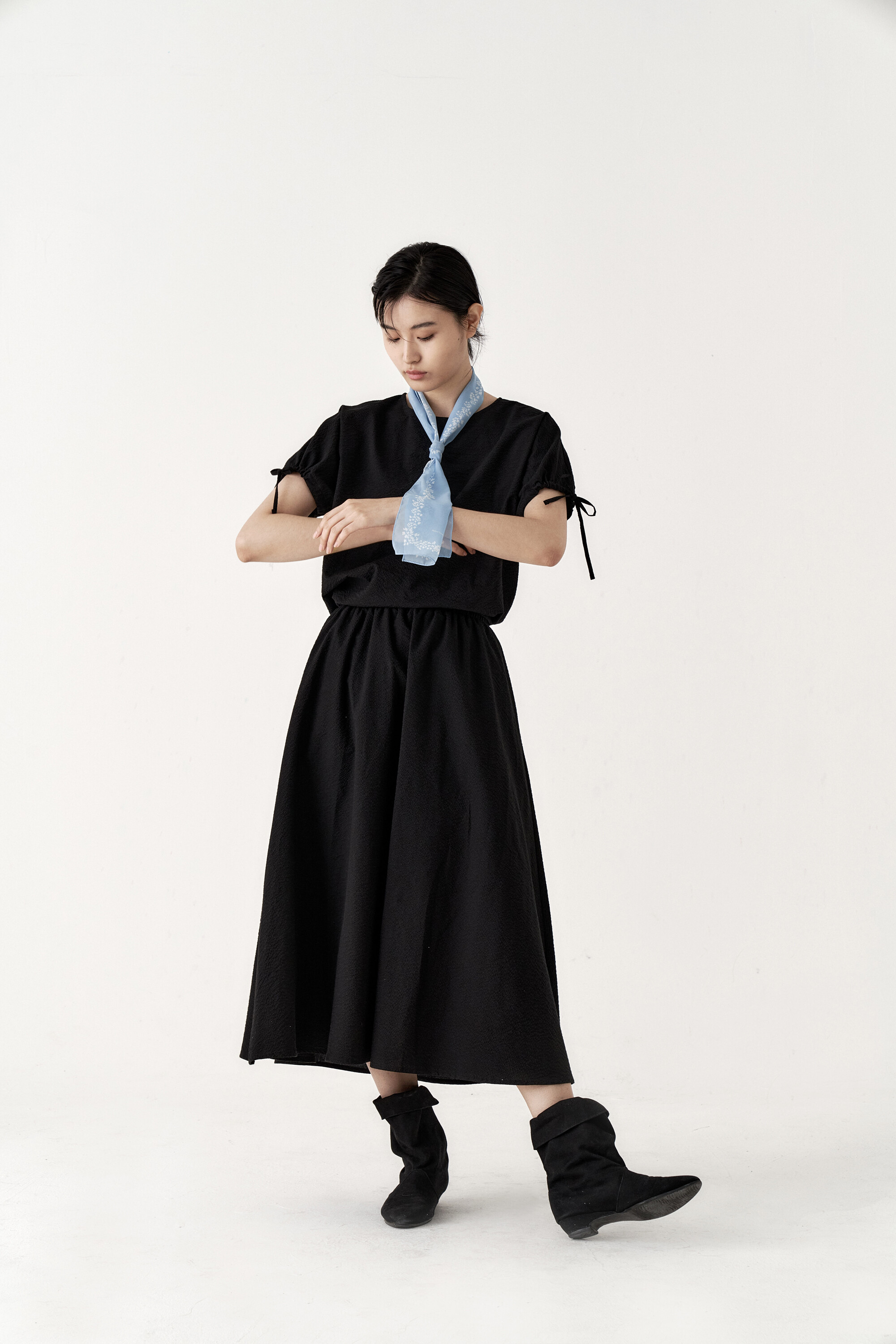 원단 표면에 엠보가 느껴지는 시어서커 원단으로 제작된 썸머 플레어 스커트입니다.