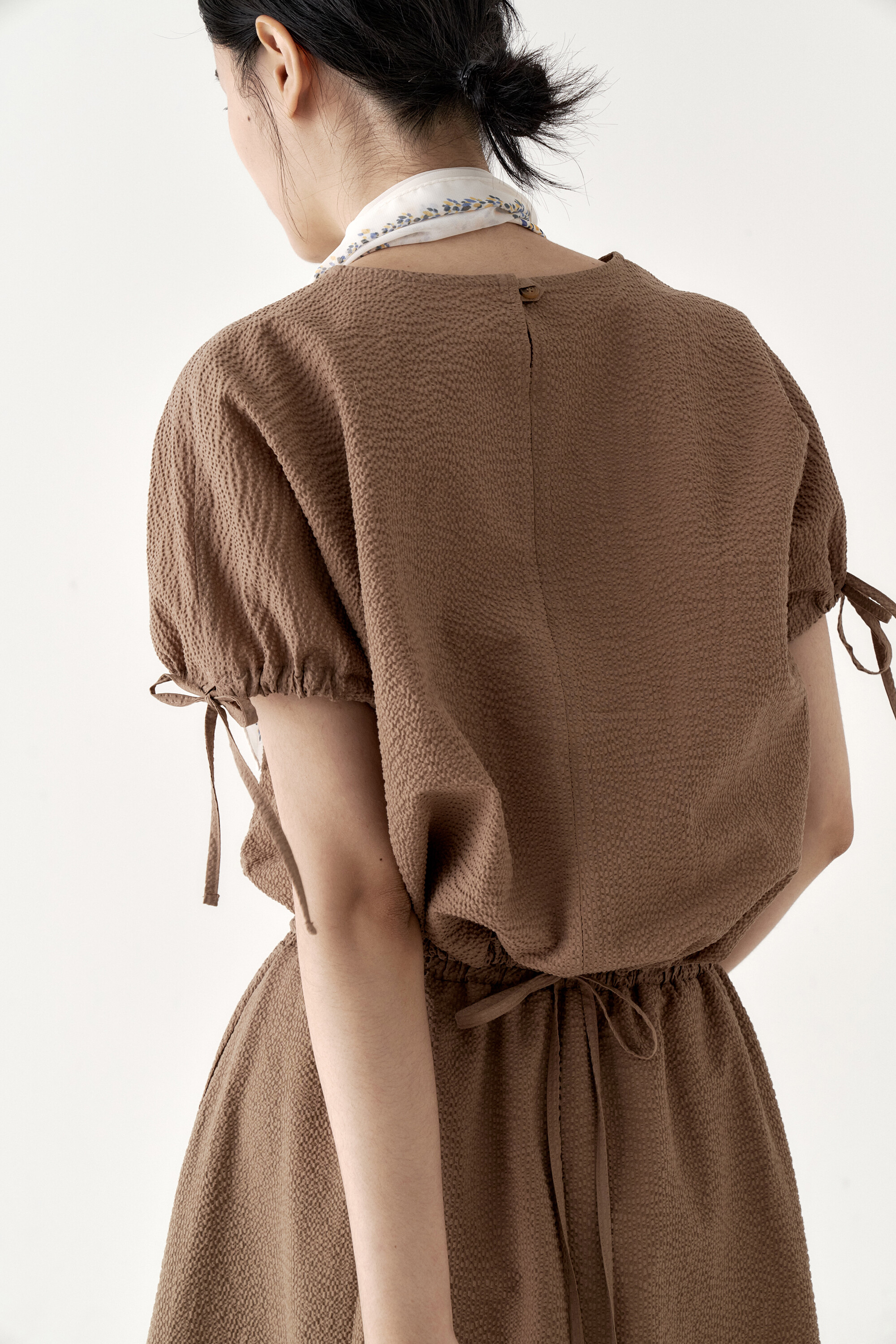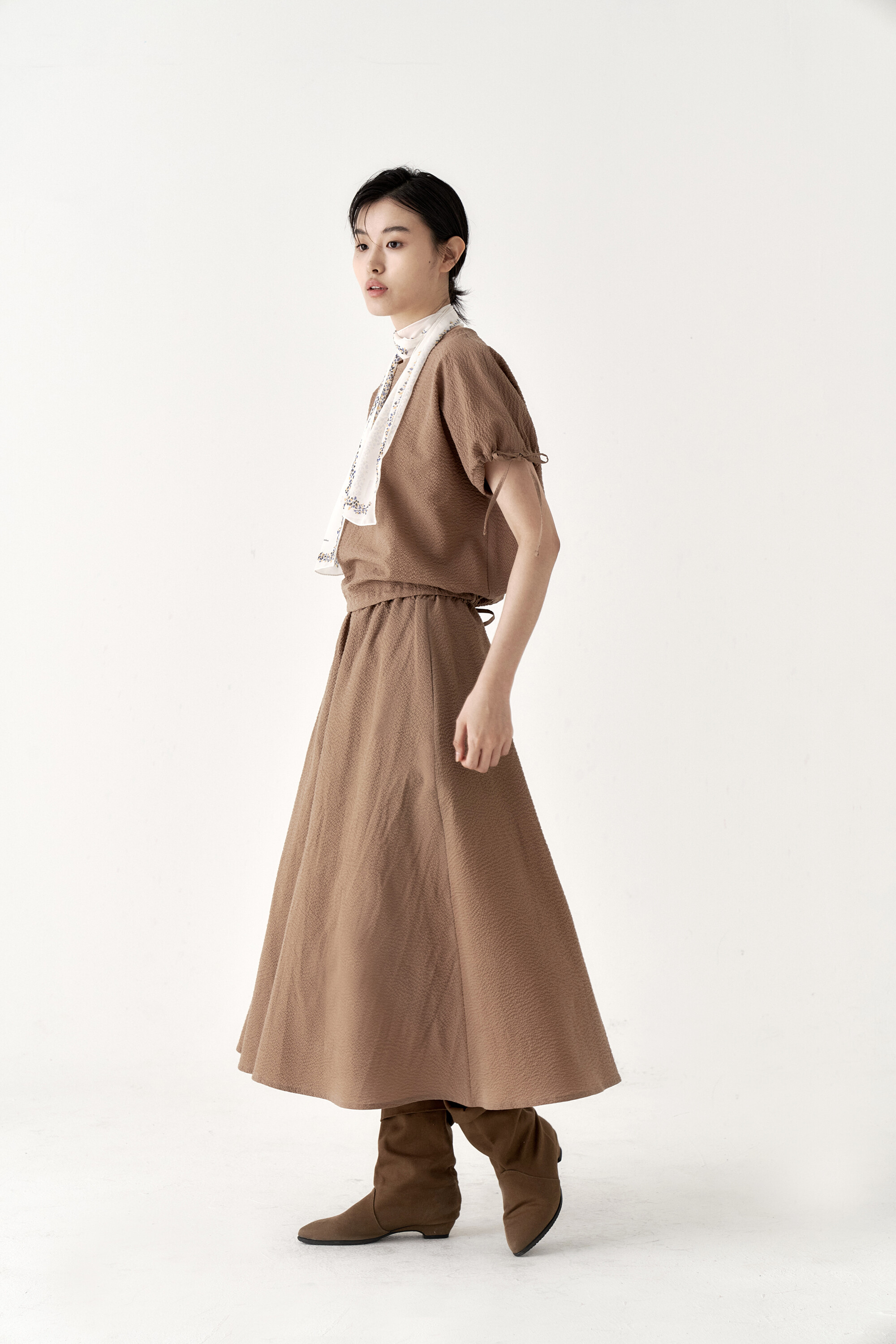 원단 표면에 엠보가 느껴지는 시어서커 원단으로 제작된 썸머 플레어 스커트입니다.