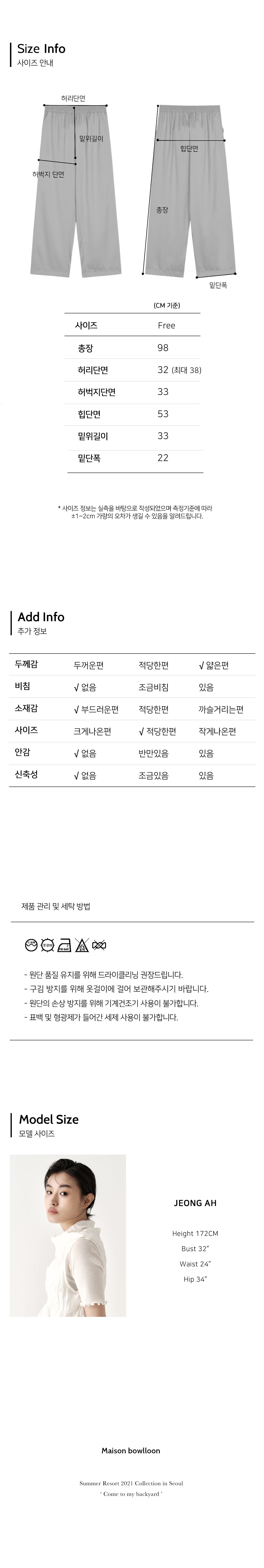 총장 98 / 허리단면 32-38 / 허벅지단면 33 / 힙단면 53 / 밑위길이 33 / 밑단폭 22