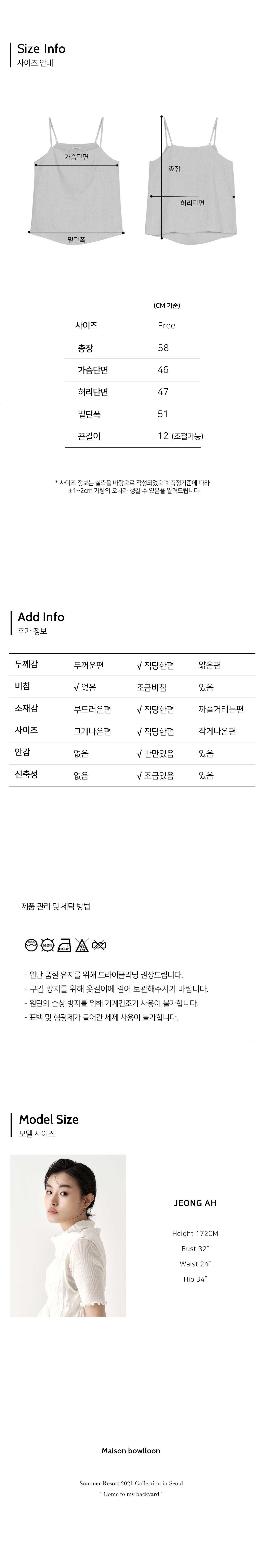 총장 43 / 가슴단면 46 / 허리단면 47 / 밑단폭 51 / 끈길이12 (조절가능)