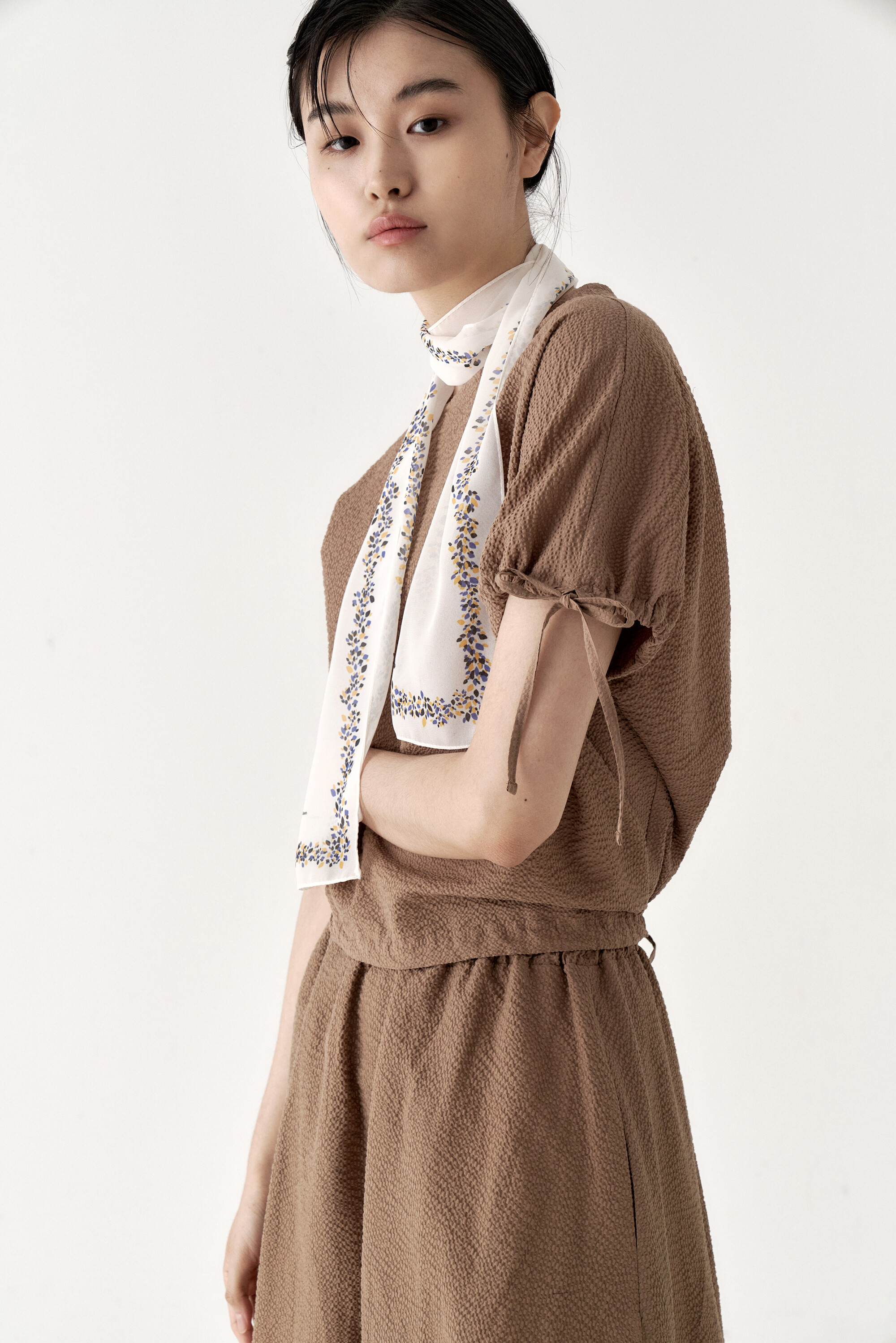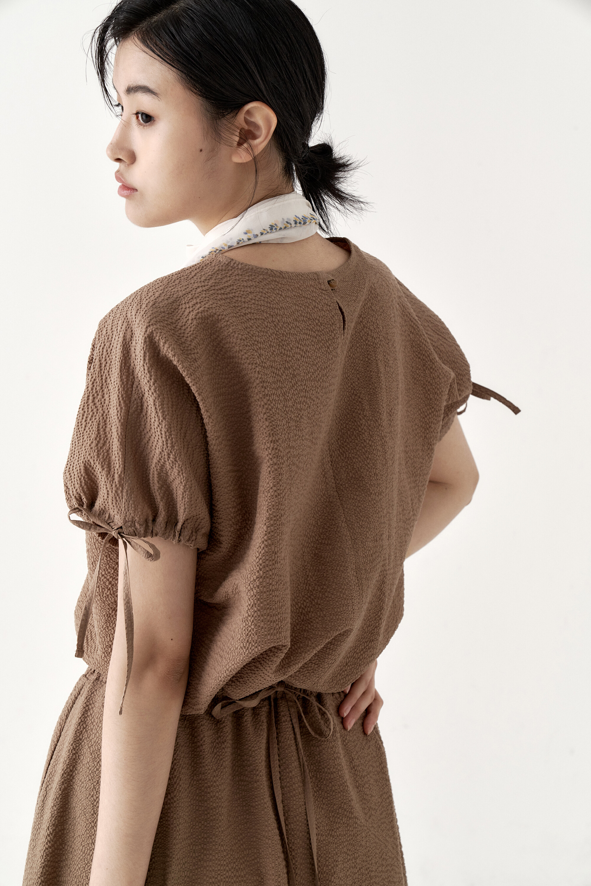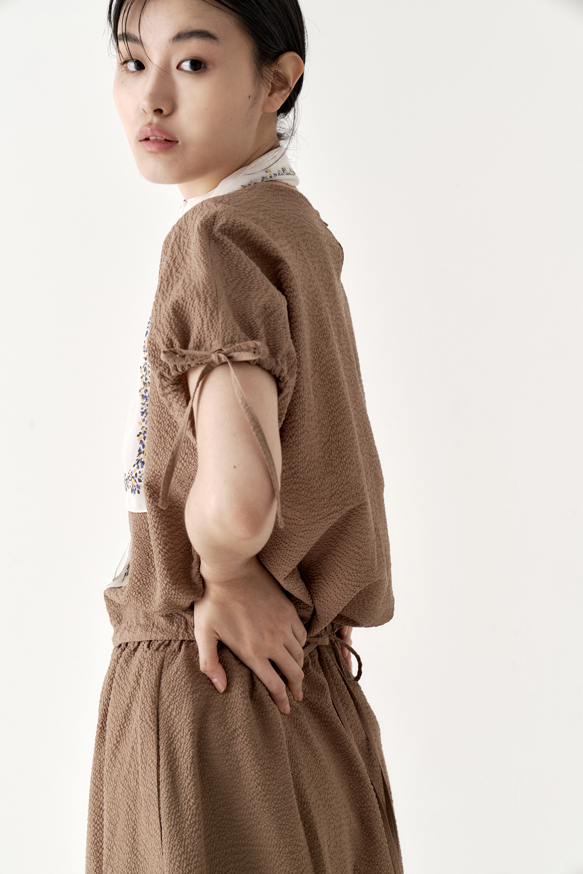 원단 표면에 엠보가 느껴지는 시어서커 원단으로 제작된 크롭 블라우스입니다.