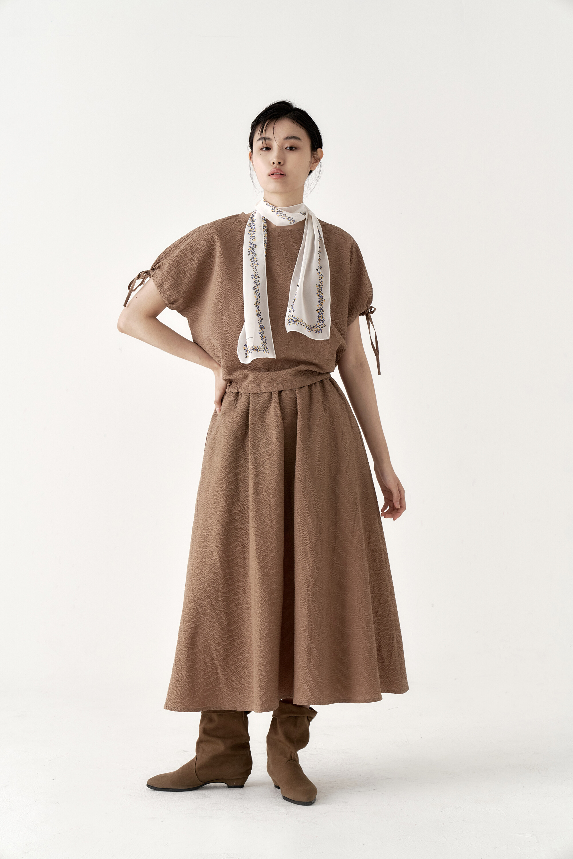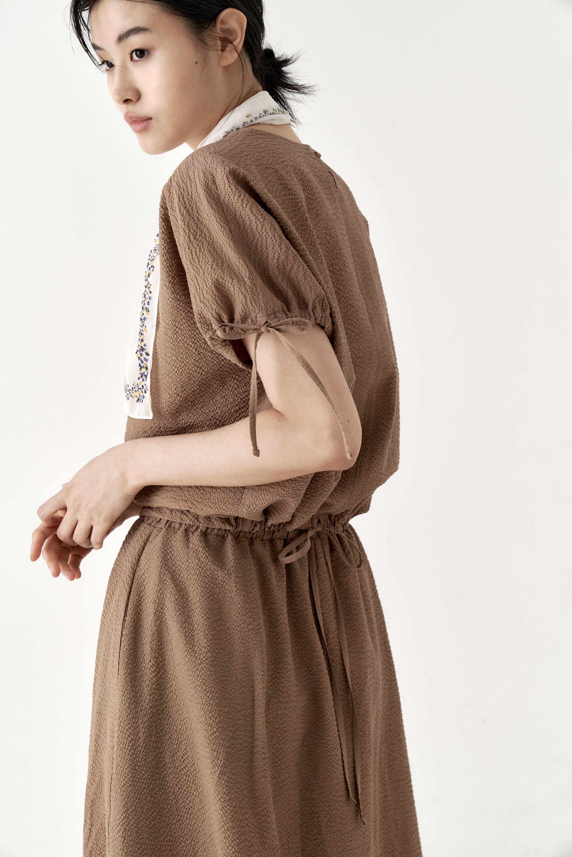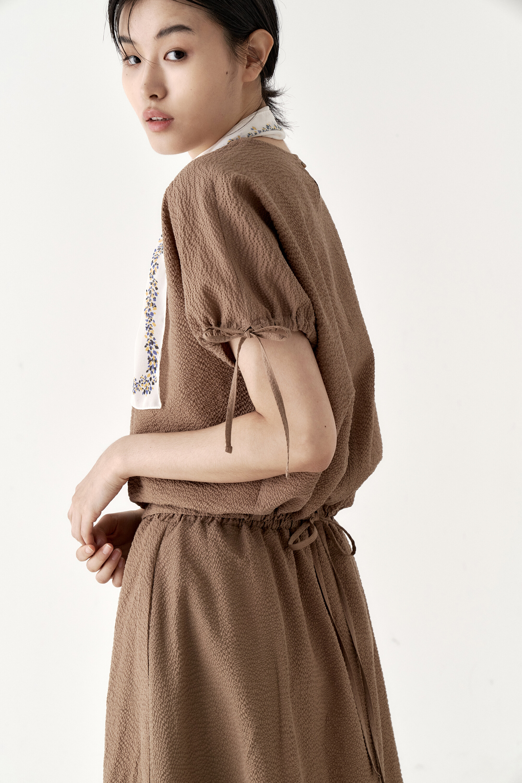 뒤중심에 원단고리와 버튼으로 여밈이 가능하며, 소매밑단과 몸판밑단은 스트링을 활용하여 셔링 디테일을 연출할 수 있습니다.