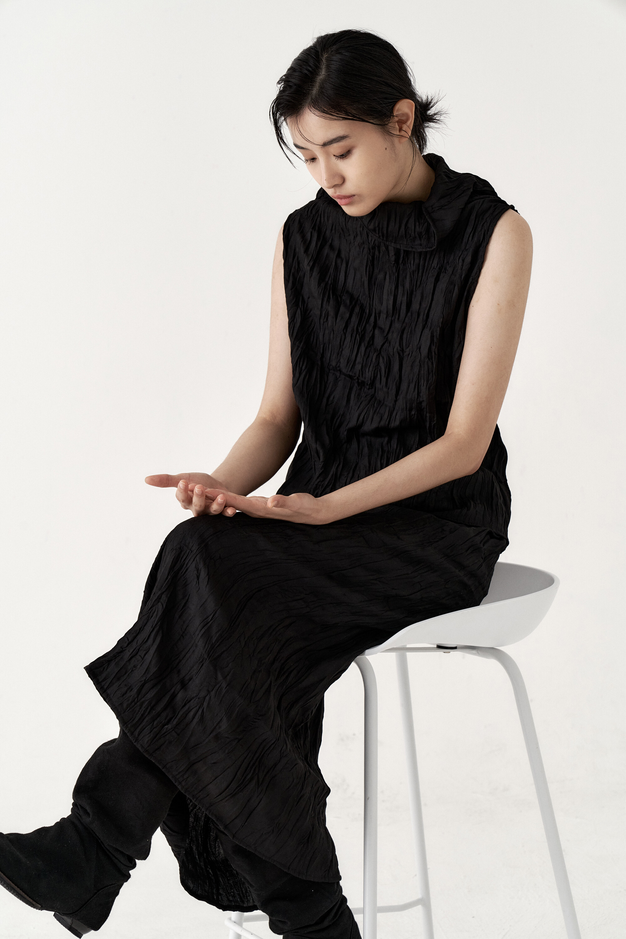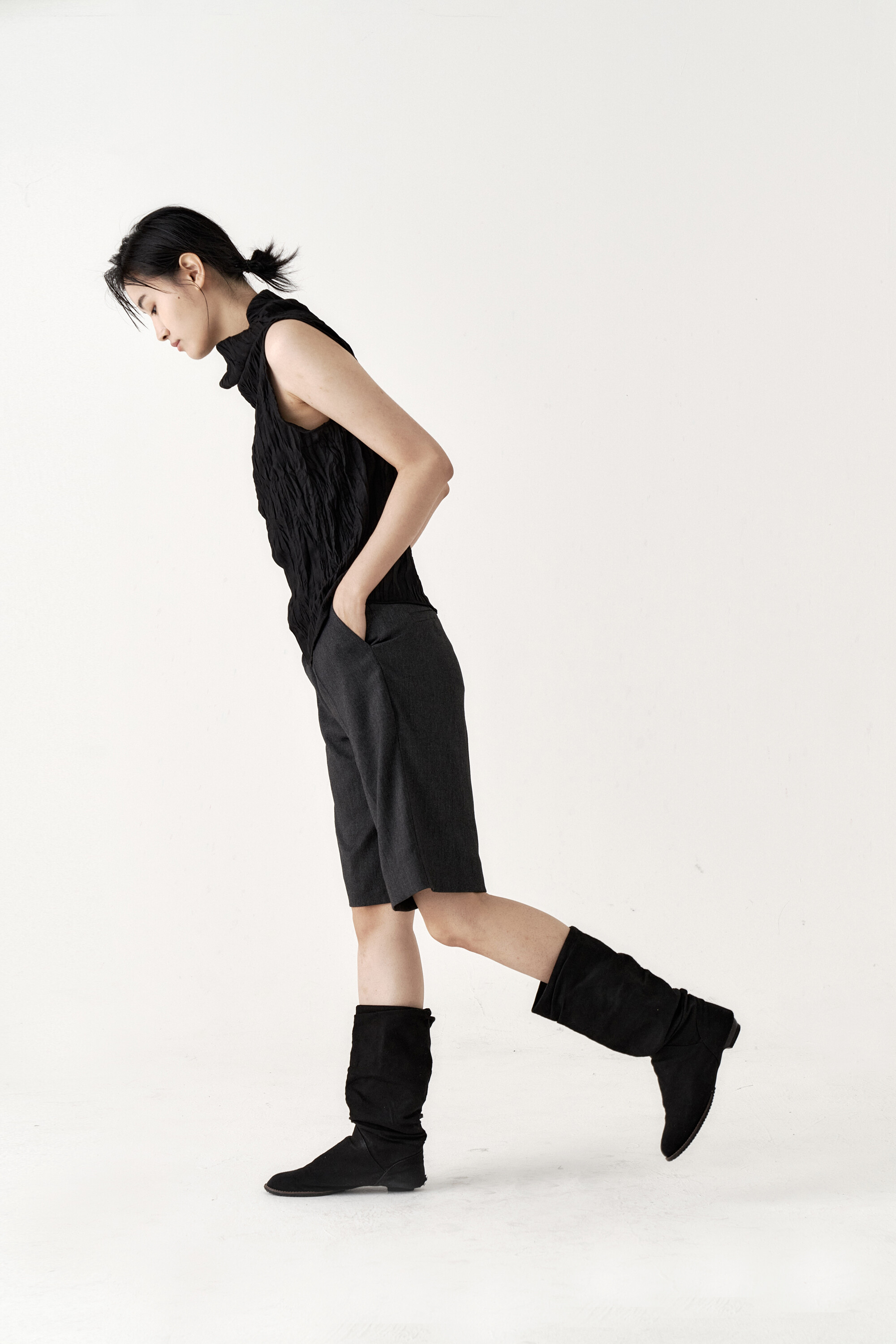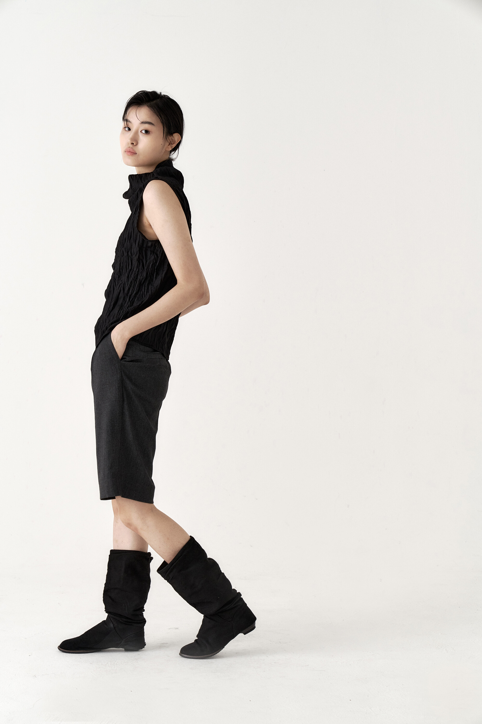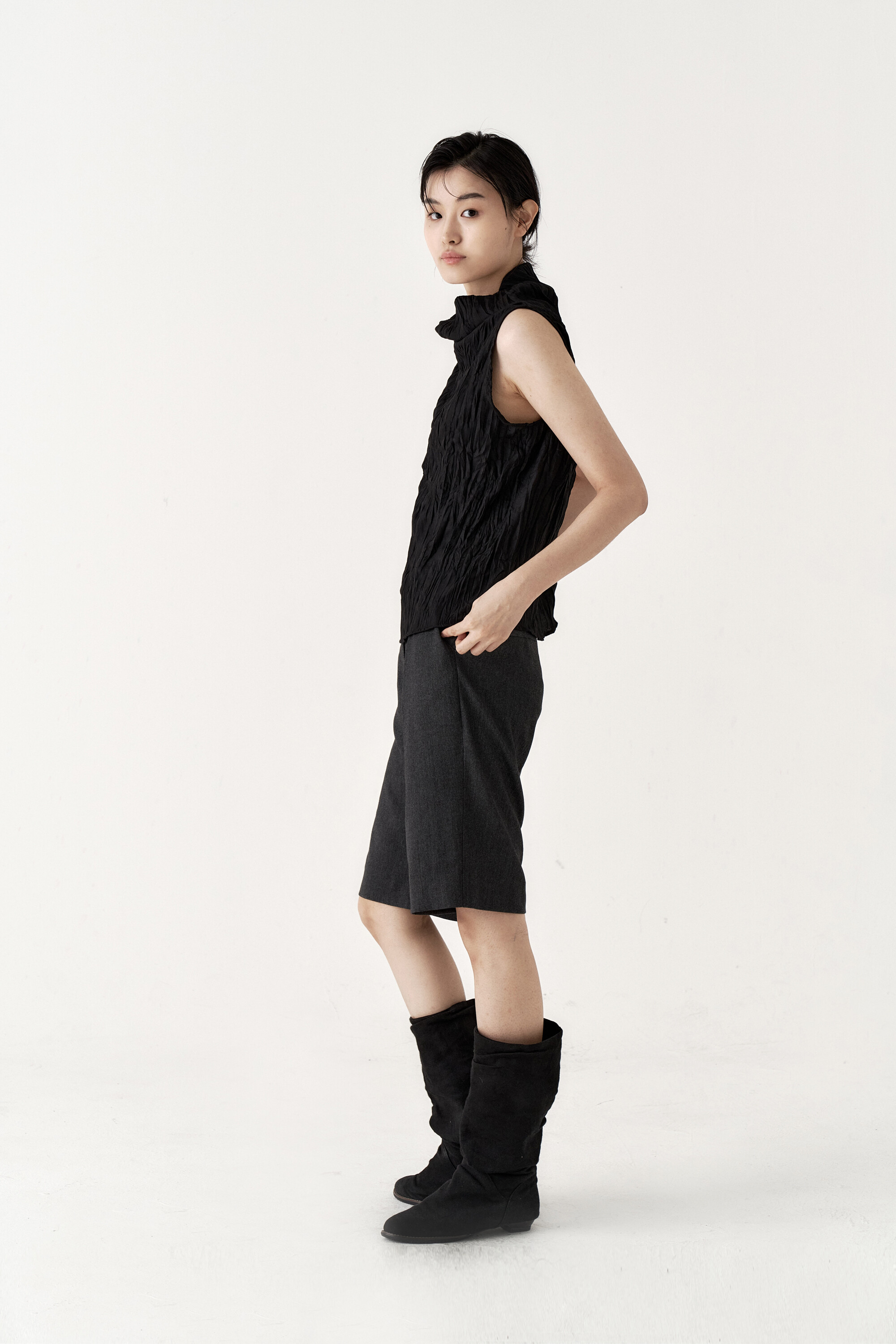 불규칙한 링클 원단으로 제작된 베스트입니다.