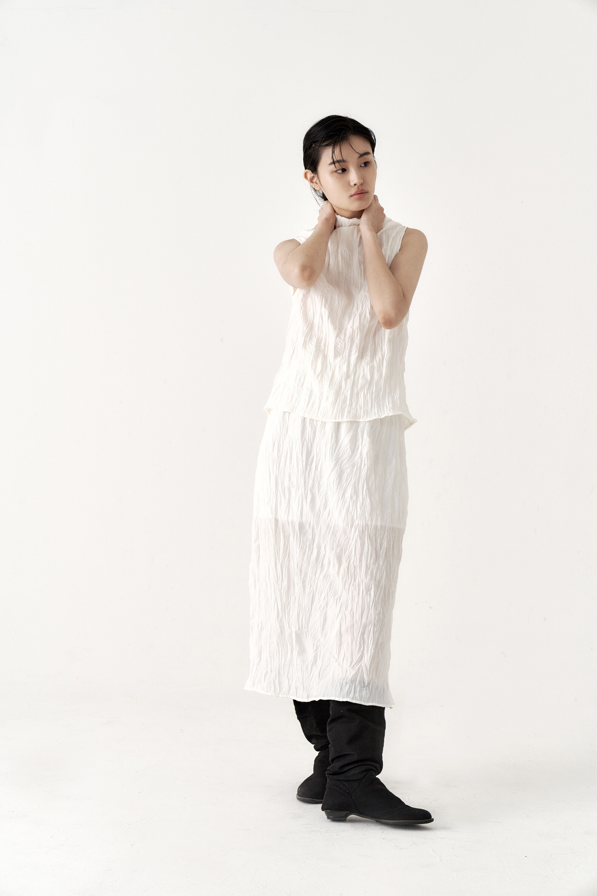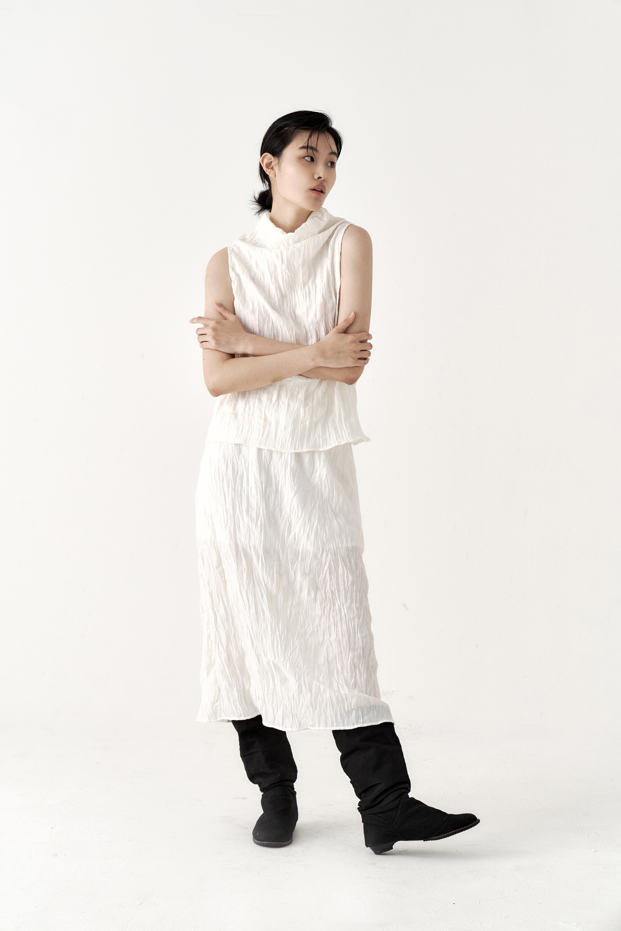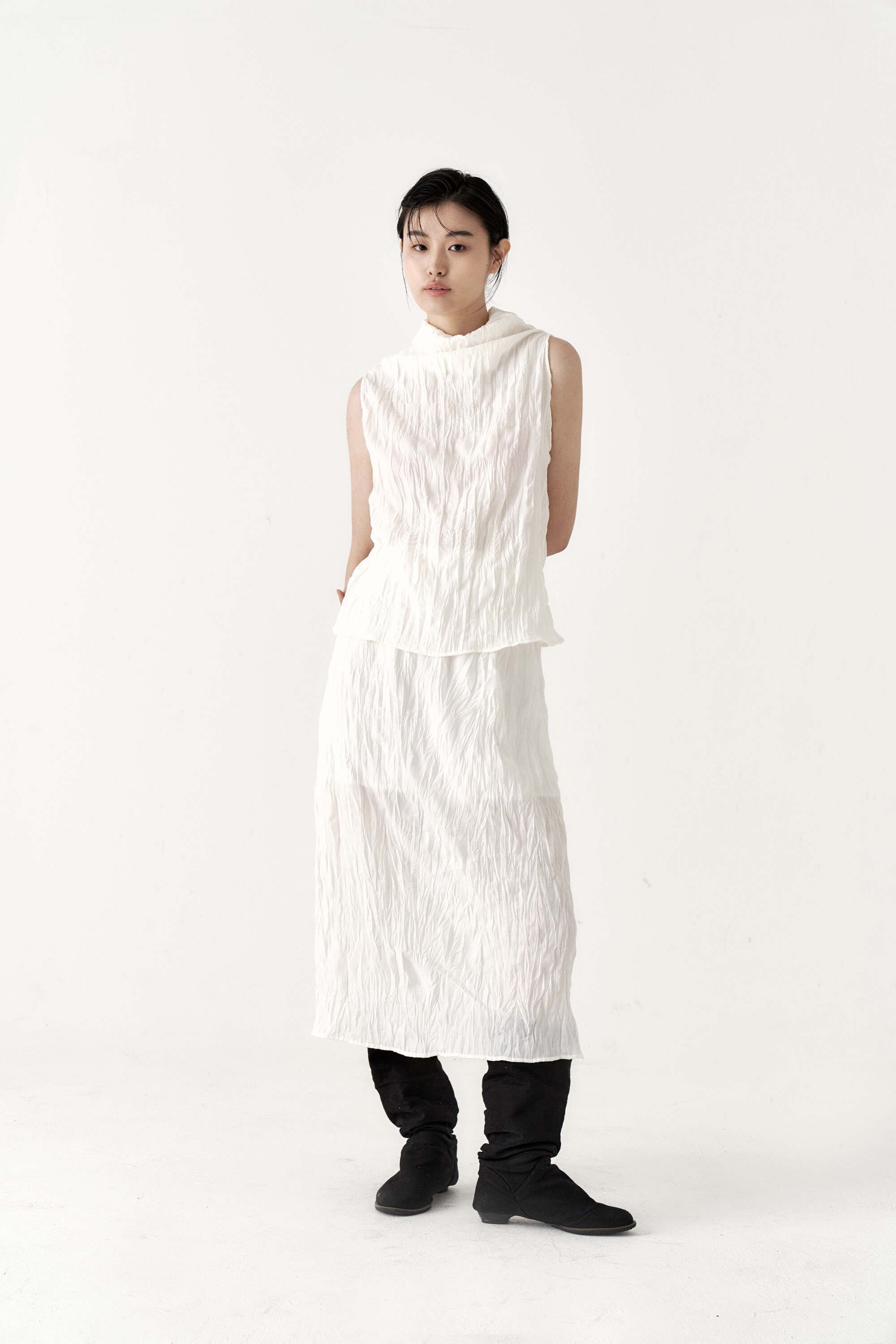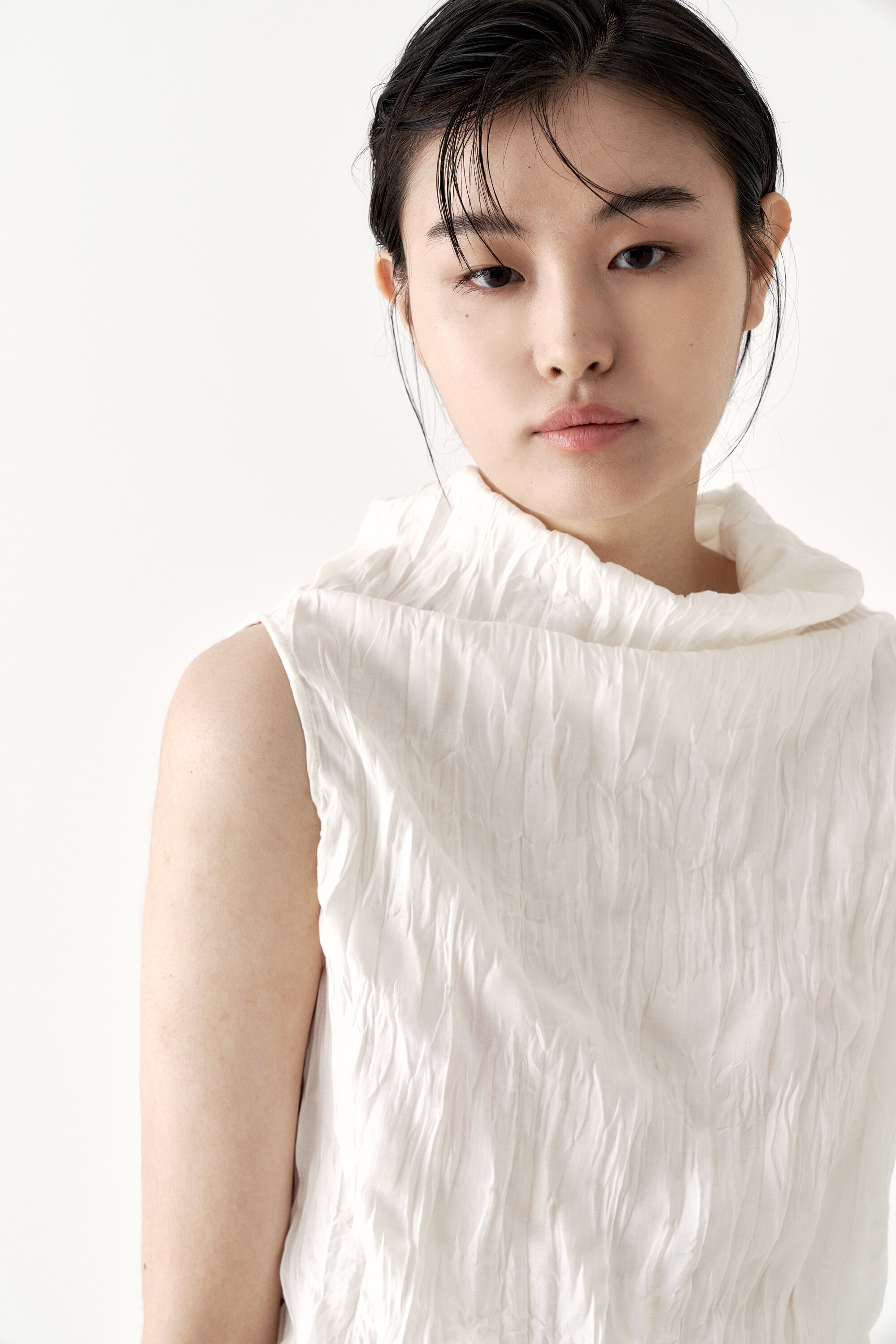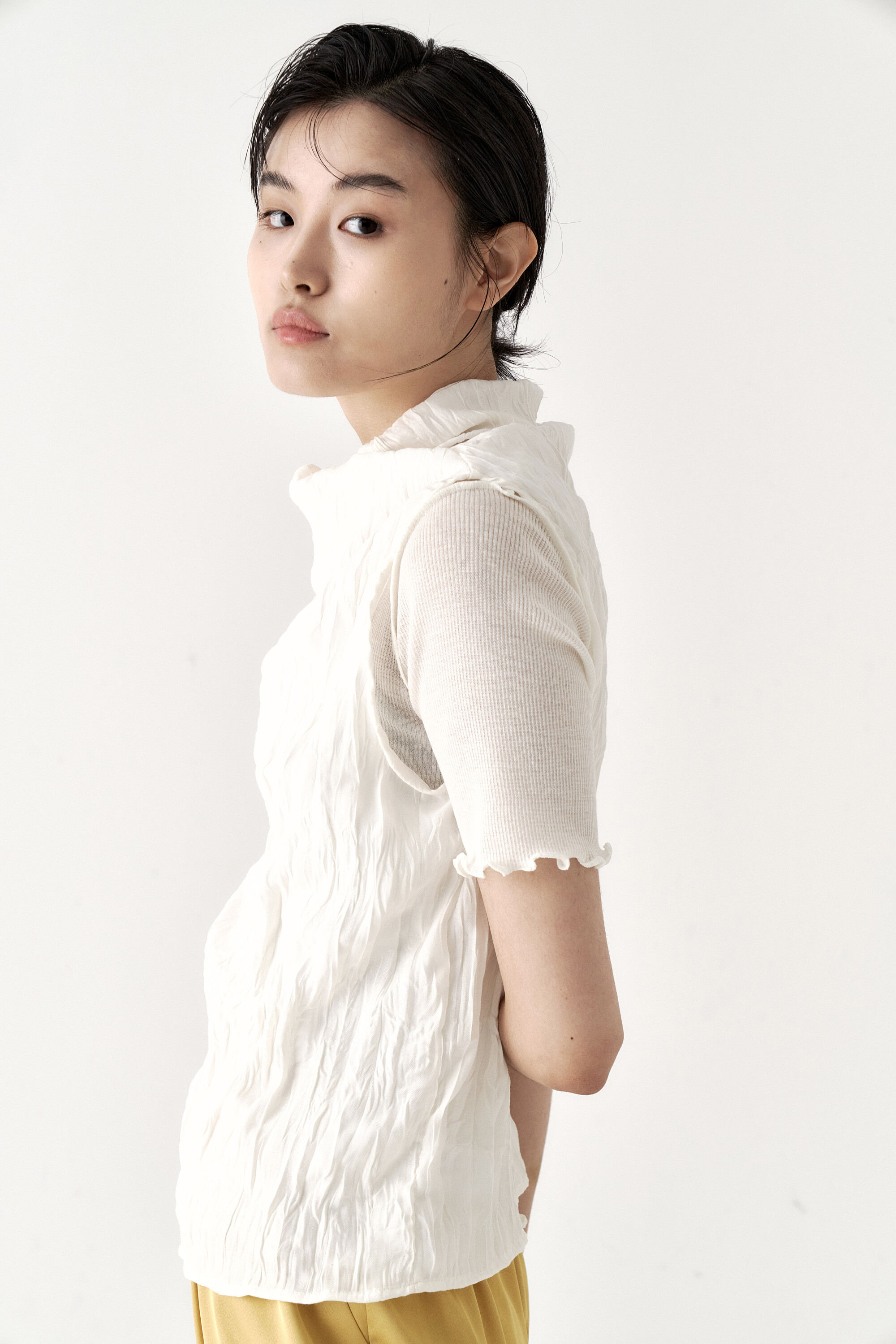 불규칙한 링클 원단으로 제작된 베스트입니다.