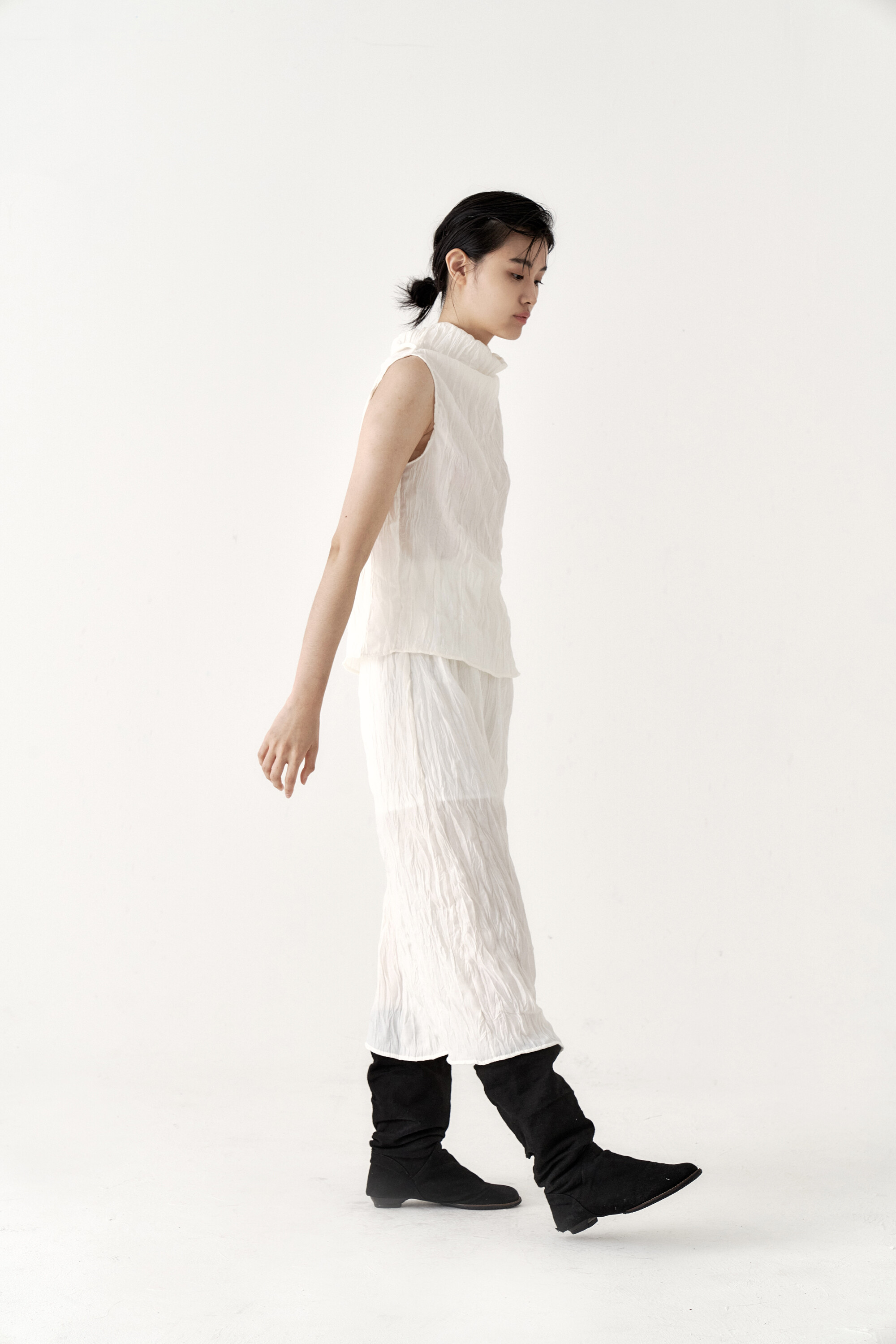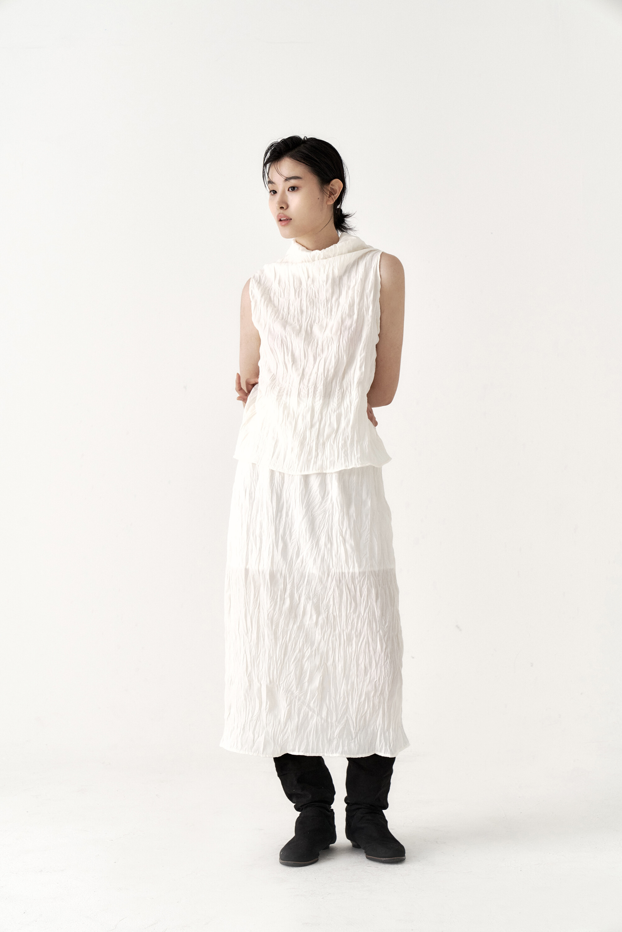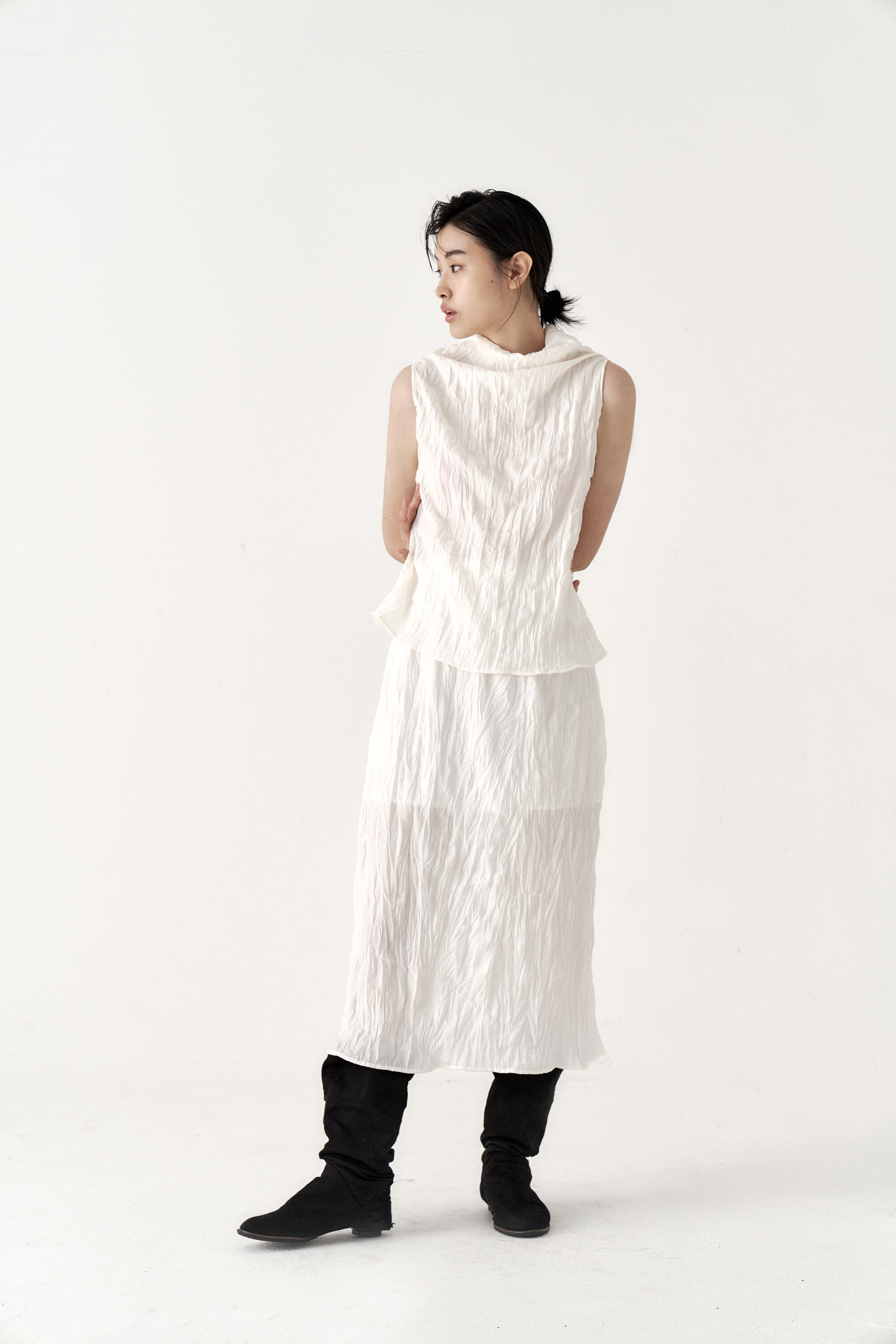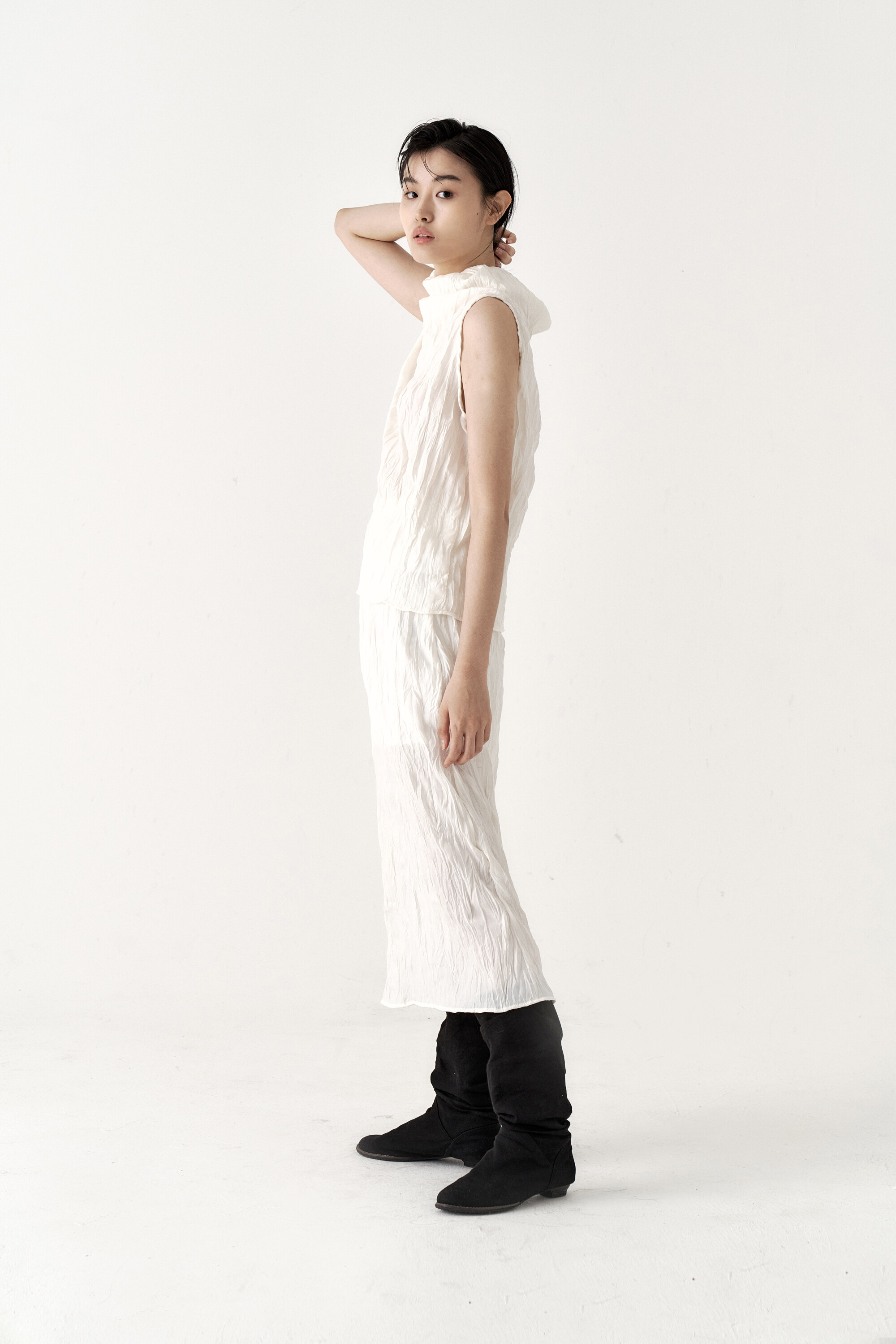 불규칙한 링클 원단으로 제작된 베스트입니다.
