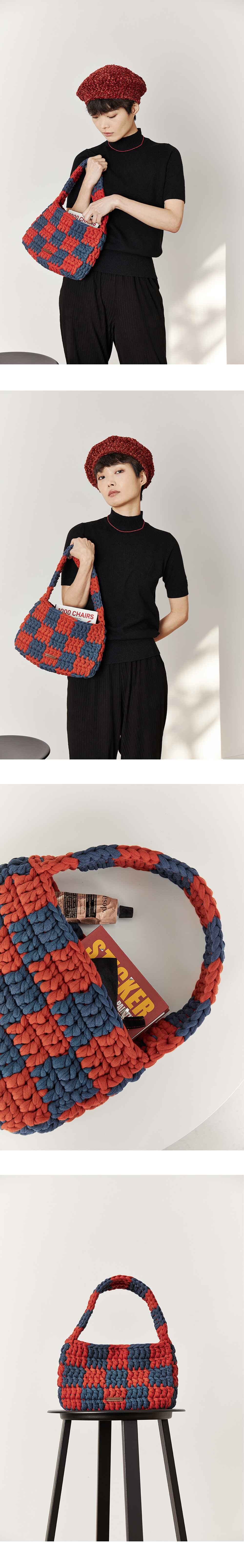 · DESCRIPTION 핸드메이드 방식으로 짜여진 체커보드 패턴의 백입니다. 50cm 길이의 스트랩으로 토트, 숄더 모두 착용가능한 디자인입니다. 탄탄한 짜임으로 이너백 없이도 수납에 불편함이 없으며, 내부 상단에는 자석버튼으로 여밈이 가능합니다. 외부 하단에는 가죽으로 제작된 로고라벨이 부착되어 있습니다.