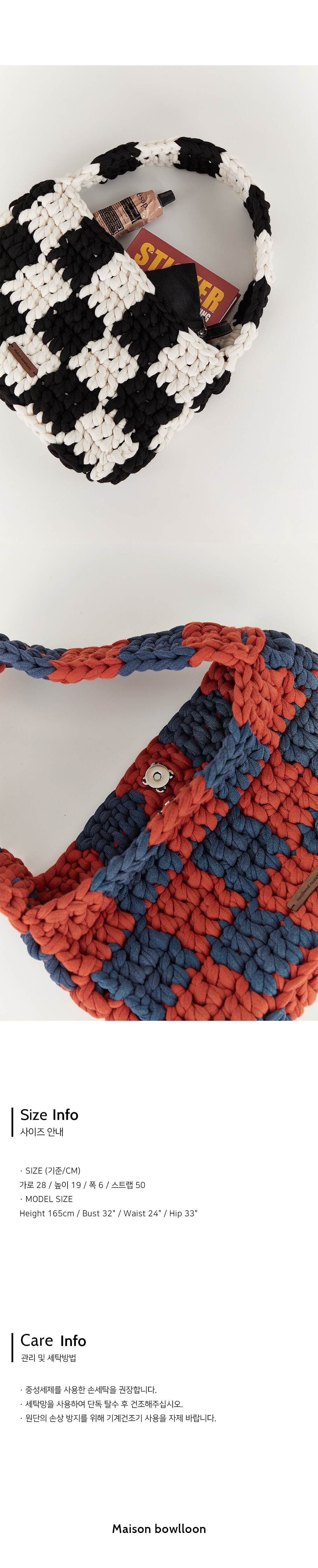 · DESCRIPTION 핸드메이드 방식으로 짜여진 체커보드 패턴의 백입니다. 50cm 길이의 스트랩으로 토트, 숄더 모두 착용가능한 디자인입니다. 탄탄한 짜임으로 이너백 없이도 수납에 불편함이 없으며, 내부 상단에는 자석버튼으로 여밈이 가능합니다. 외부 하단에는 가죽으로 제작된 로고라벨이 부착되어 있습니다.