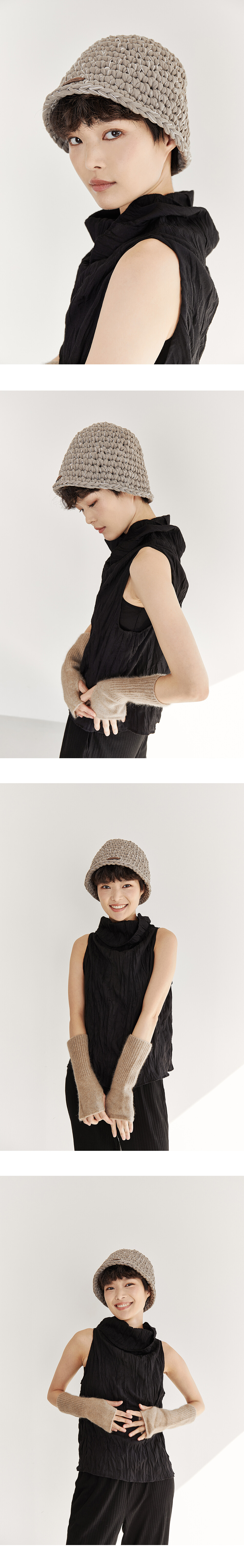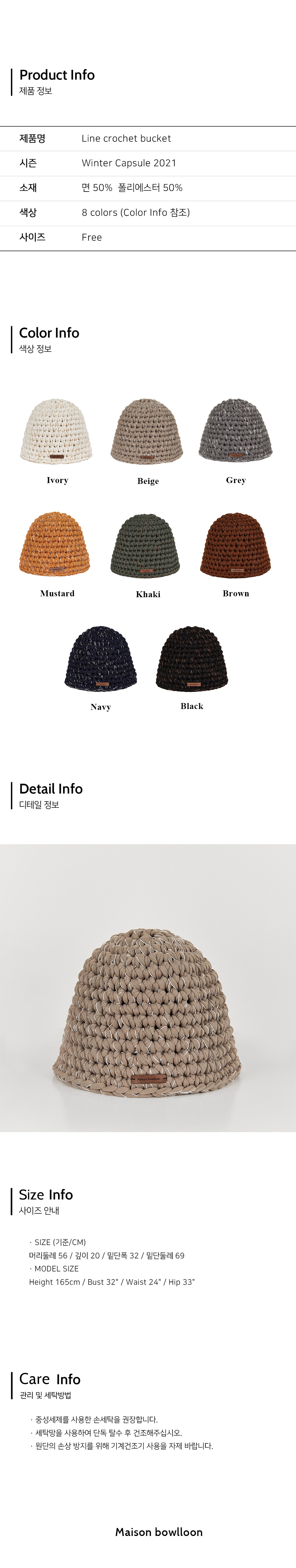 · DESCRIPTION 핸드메이드 방식으로 짜여진 크로쉐 버킷햇입니다. 모든 컬러는 배색실과 합사하여 제작되었습니다. 패브릭얀 자체의 톡톡한 조직감으로, 원하는 쉐입을 잡아 착용하실 수 있습니다. 외부 하단에는 가죽으로 제작된 로고라벨이 부착되어있습니다. 약 350g 의 무게감으로 기성 우븐 버킷햇보다는 중량감이 있습니다.