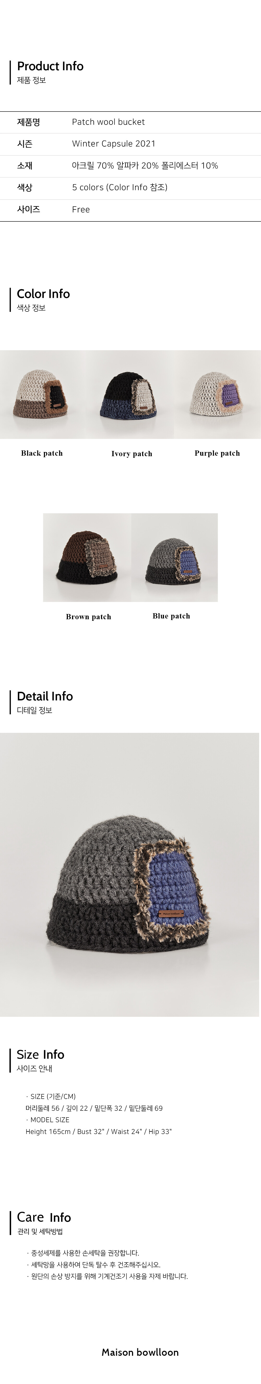 · DESCRIPTION 3가지 컬러의 알파카 혼방사와 포인트사로 제작된 버킷햇입니다. 배색사와 인조퍼를 통해 사각 형태의 패치디자인이 되어있습니다. 해당 패치디자인은 공정시에 배색짜임을 통해 제작되는 부분으로 일반적인 패치 부착형 디자인보다 더 많은 제작공정이 필요합니다. 모든 공정은 수작업으로 진행됩니다.