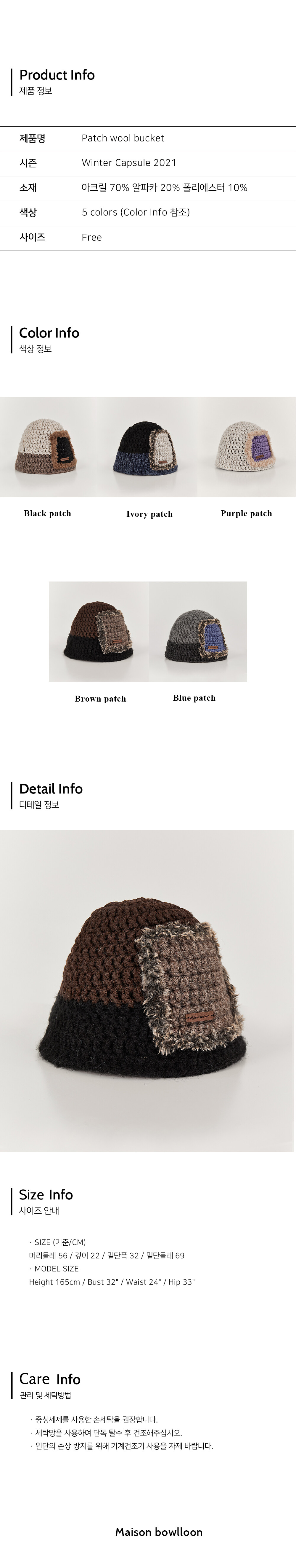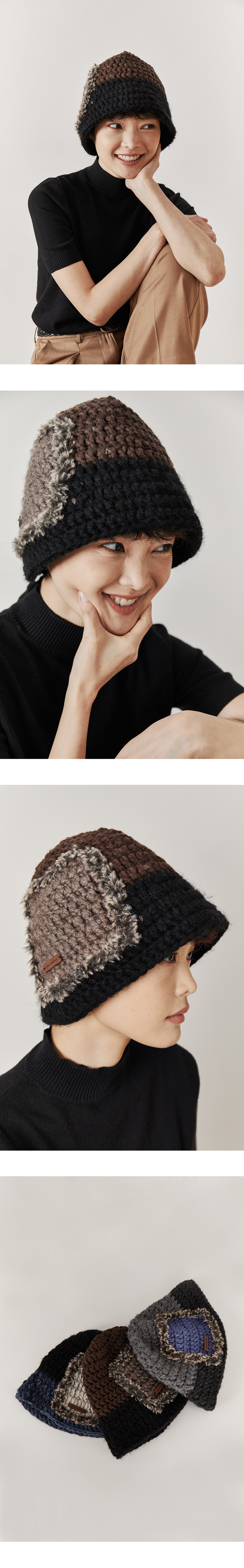 · DESCRIPTION 3가지 컬러의 알파카 혼방사와 포인트사로 제작된 버킷햇입니다. 배색사와 인조퍼를 통해 사각 형태의 패치디자인이 되어있습니다. 해당 패치디자인은 공정시에 배색짜임을 통해 제작되는 부분으로 일반적인 패치 부착형 디자인보다 더 많은 제작공정이 필요합니다. 모든 공정은 수작업으로 진행됩니다.
