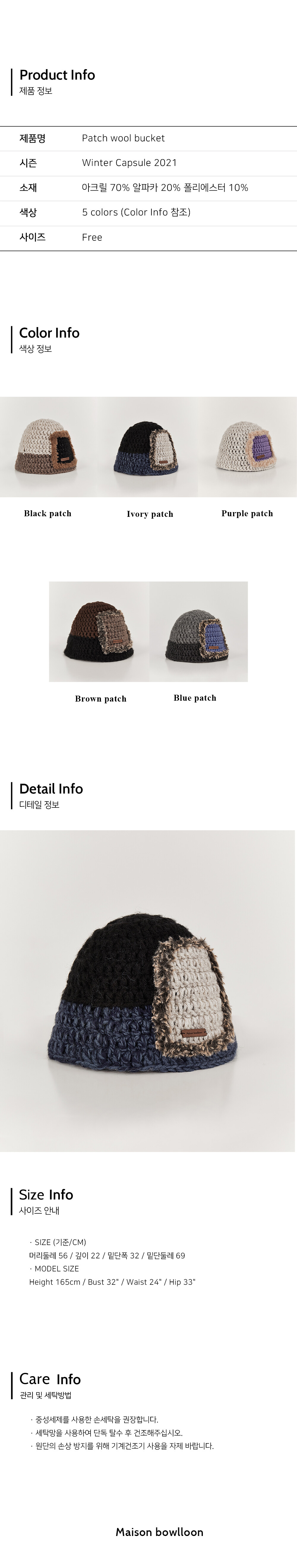 · DESCRIPTION 3가지 컬러의 알파카 혼방사와 포인트사로 제작된 버킷햇입니다. 배색사와 인조퍼를 통해 사각 형태의 패치디자인이 되어있습니다. 해당 패치디자인은 공정시에 배색짜임을 통해 제작되는 부분으로 일반적인 패치 부착형 디자인보다 더 많은 제작공정이 필요합니다. 모든 공정은 수작업으로 진행됩니다.
