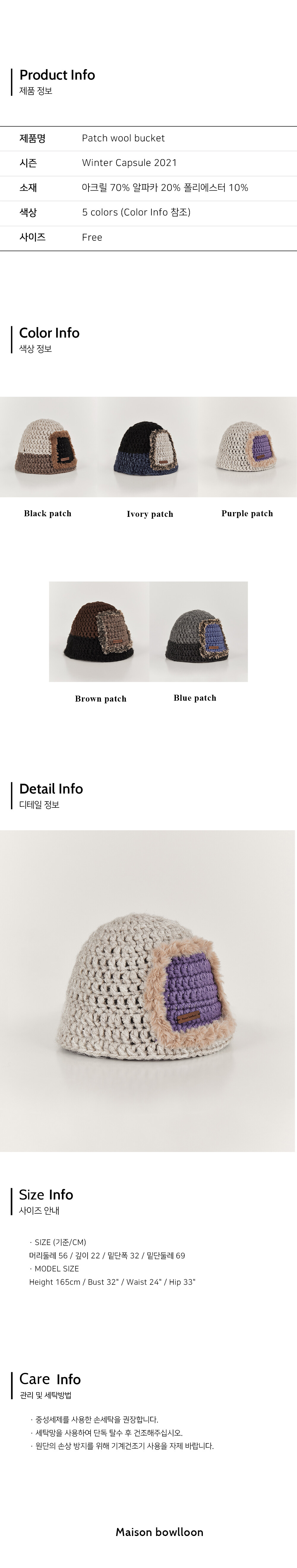 · DESCRIPTION 3가지 컬러의 알파카 혼방사와 포인트사로 제작된 버킷햇입니다. 배색사와 인조퍼를 통해 사각 형태의 패치디자인이 되어있습니다. 해당 패치디자인은 공정시에 배색짜임을 통해 제작되는 부분으로 일반적인 패치 부착형 디자인보다 더 많은 제작공정이 필요합니다. 모든 공정은 수작업으로 진행됩니다.