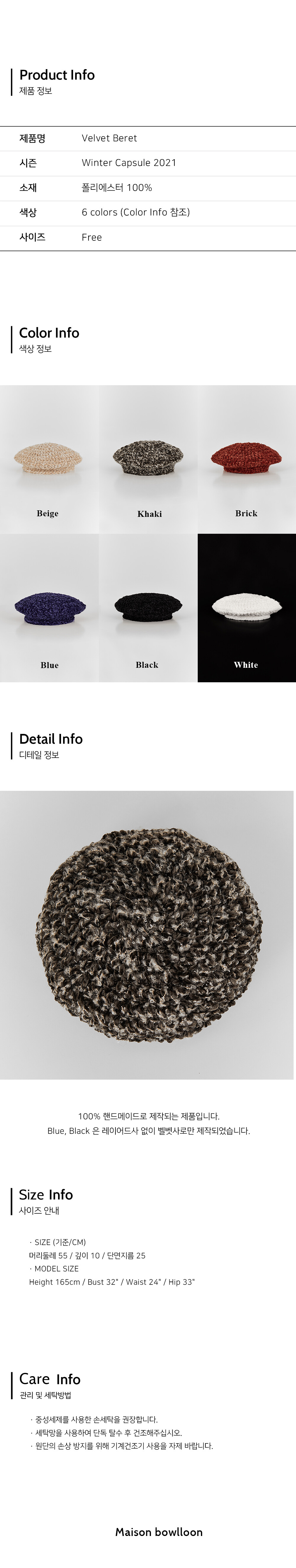 · DESCRIPTION 핸드메이드 방식으로 짜여진 벨벳 베레입니다. 깊지 않은 디자인의 베레로 데일리로 착용하기 좋은 쉐입을 가지고 있습니다. 일본 수입 벨벳사를 사용하여 터치감이 부드럽고, 선명한 컬러가 특징입니다. 내부 하단에는 가죽으로 제작된 로고라벨이 부착되어있습니다. Beige, Brick, Khaki, White 네가지 컬러는 얇은 배색사와 합사되어있으며, Blue, Black 은 합사 없이 벨벳사 단독으로만 제작되었습니다.