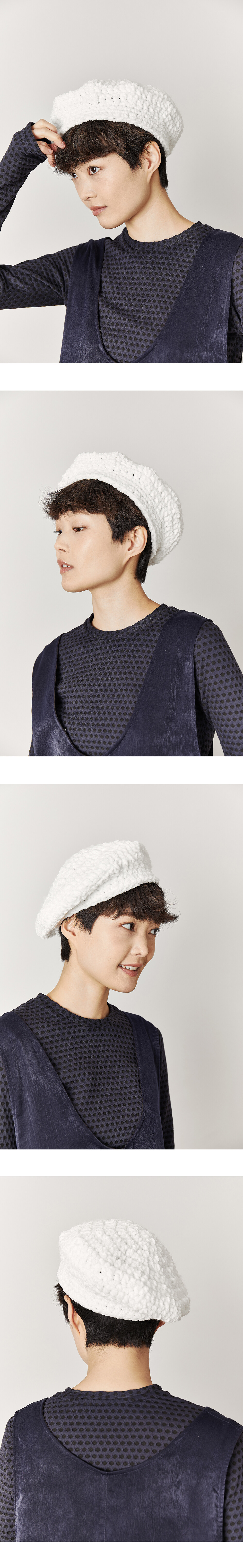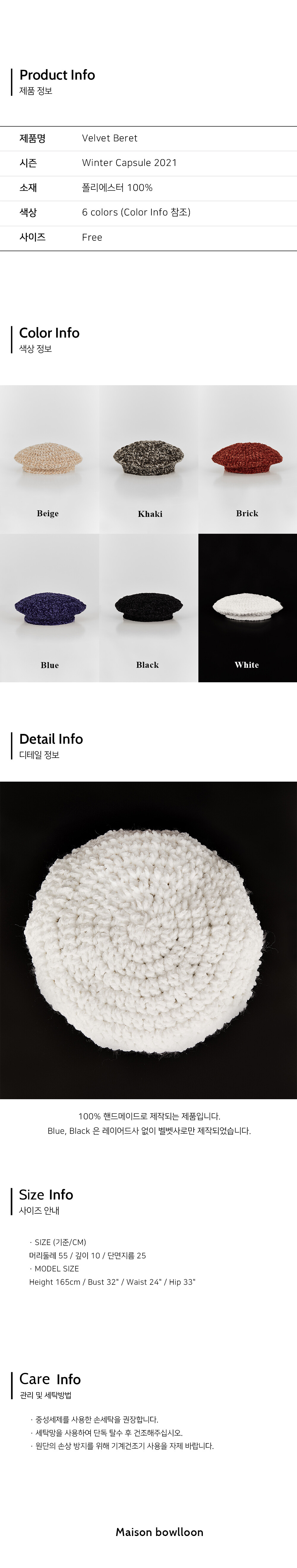 · DESCRIPTION 핸드메이드 방식으로 짜여진 벨벳 베레입니다. 깊지 않은 디자인의 베레로 데일리로 착용하기 좋은 쉐입을 가지고 있습니다. 일본 수입 벨벳사를 사용하여 터치감이 부드럽고, 선명한 컬러가 특징입니다. 내부 하단에는 가죽으로 제작된 로고라벨이 부착되어있습니다. Beige, Brick, Khaki, White 네가지 컬러는 얇은 배색사와 합사되어있으며, Blue, Black 은 합사 없이 벨벳사 단독으로만 제작되었습니다.
